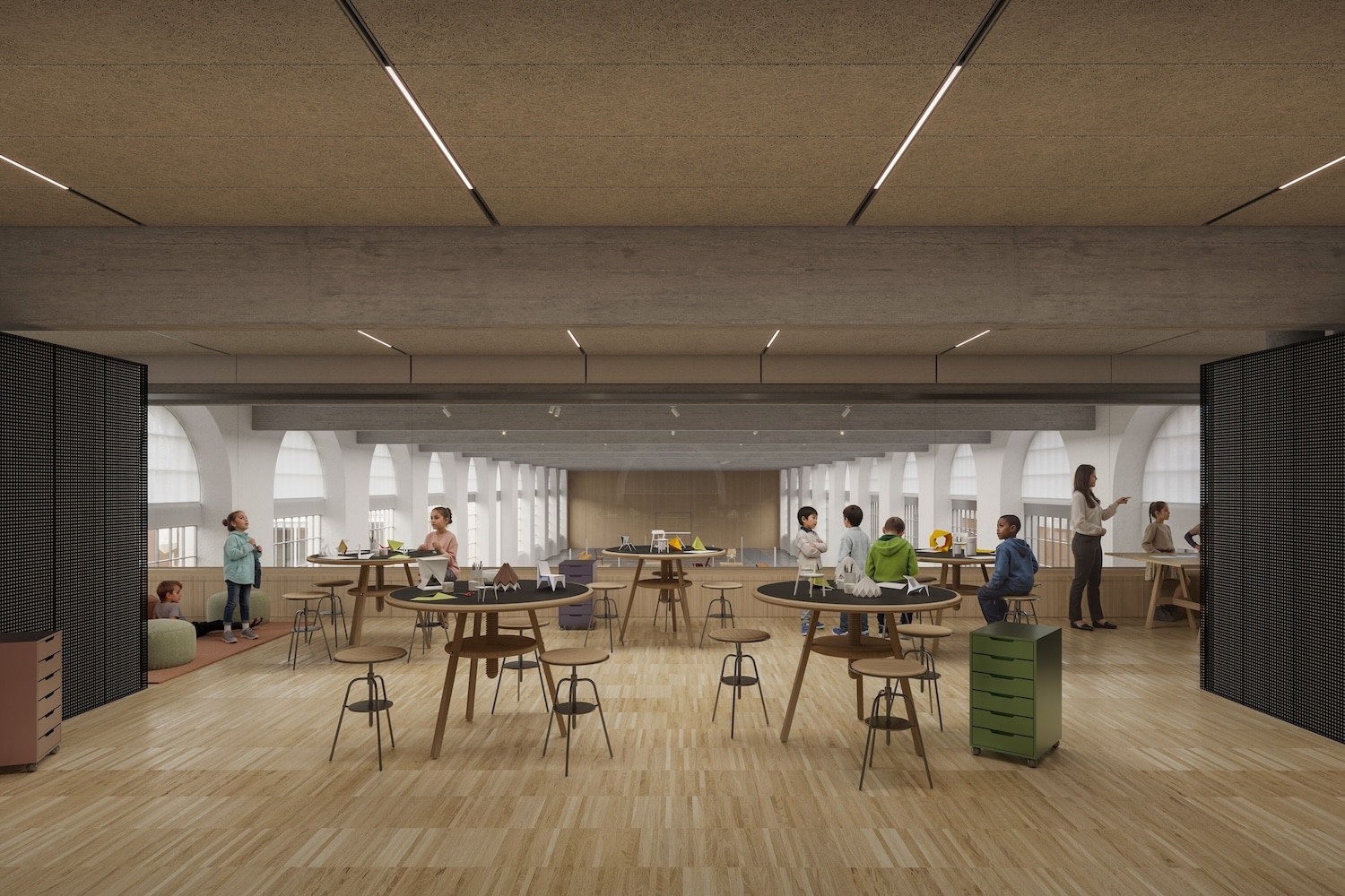 Le mobilier y est signé par des maisons comme Knoll, Ligne Roset, Moustache, Petite Friture, Sammode, Source Edition ou Vitra, renouvelé chaque année en écho à l’exposition en cours. La salle d’exposition déploie une grande nef où les structures existantes rythment naturellement le parcours. La Mezzanine, en surplomb, accueille ateliers et rencontres avec un mobilier conçu par le duo Marie et Alexandre en collaboration avec le fabricant Alki.