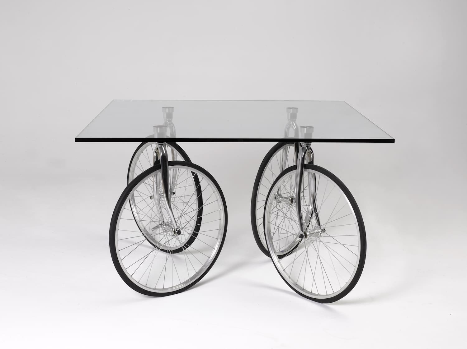 Résultat : près de 400 objets issus d’une dizaine d’institutions françaises, dont le Centre national des arts plastiques (CNAP), le Centre Pompidou, le MAMC+, le Musée des Arts décoratifs et du Design de Bordeaux, le Frac Grand Large Hauts-de-France, les Manufactures nationales Sèvres et Mobilier national. On y croise des rubans de passementerie stéphanois tissés au Jacquard vers 1900, matière textile où la main de l’artisan dialogue avec le métier mécanique, des couverts tordus de Bruno Munari en métal poli, la Table Tour de Gae Aulenti dont les pieds sont des roues et fourches de vélo récupérées en acier chromé, ou encore l’Anonymous Stool de Ron Arad qui associe acier, aluminium et bois d’aulne pour réinventer le tabouret d’architecte.