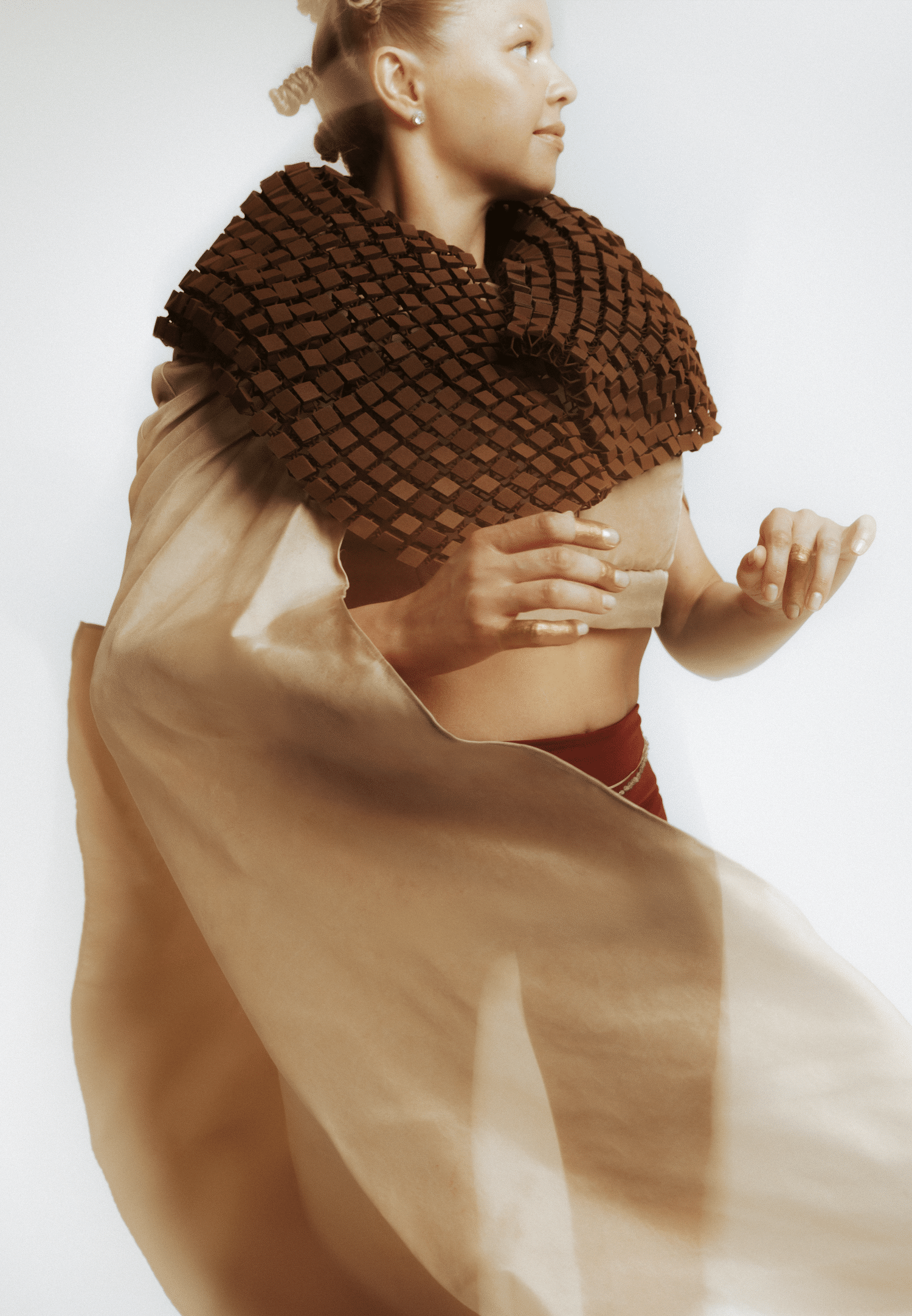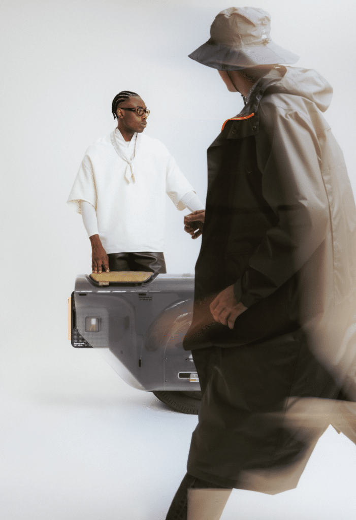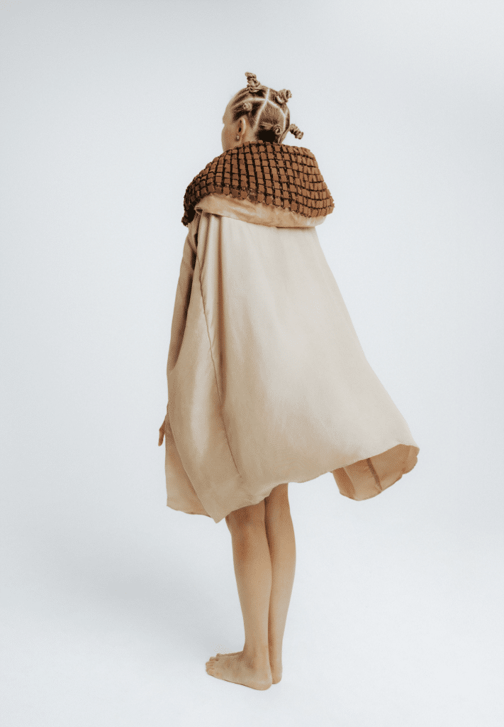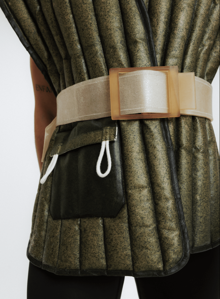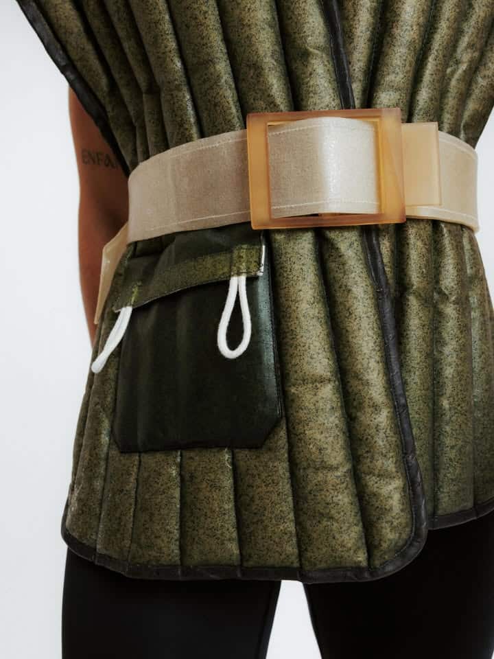 Le designer travaille depuis plusieurs années sur la recherche et le développement du Phycotex, un néo-matériau à base d’algues qu’il décline sous différentes formes. Pour le kimono, des plaques souples d’algues ont été moulées puis matelassées avec de la ouatine recyclée, créant une texture à la fois protectrice et respirante. L’appuie-tête et les épaulettes sont également fabriqués à partir de ces plaques rigides, tandis que le marquage arrière est réalisé par gravure laser directement sur la matière, révélant une teinte blanche naturelle sans ajout d’encre.