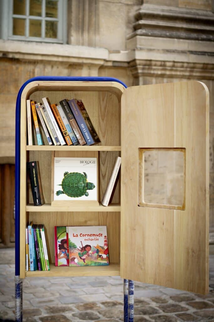 Composée de plusieurs éléments : une table, des assises, une boîte à livres et un mobilier hybride servant autant de banc que d’accroche vélo, cette gamme modulaire crée des points d’ancrage dans l’espace urbain. Chaque pièce devient une passerelle entre les usagers, un prétexte au lien, un appel à la convivialité plus que du mobilier.
