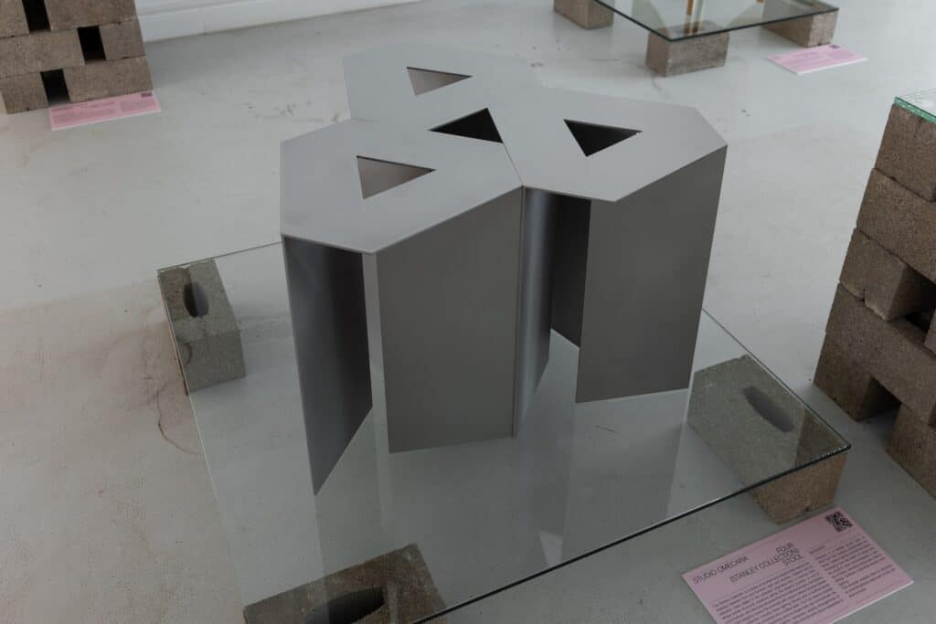 Pour la scénographie, un parti pris fort : simplicité, modularité, consommation minimale de matière. Les briques (prêtées) et le verre (récupéré) ont permis de construire des structures modulables, réutilisables, sans gaspillage. Les cartels étaient imprimés en 100 % papier. Ce traitement modeste mais réfléchi faisait écho à la philosophie du design conscient, pragmatique, durable.