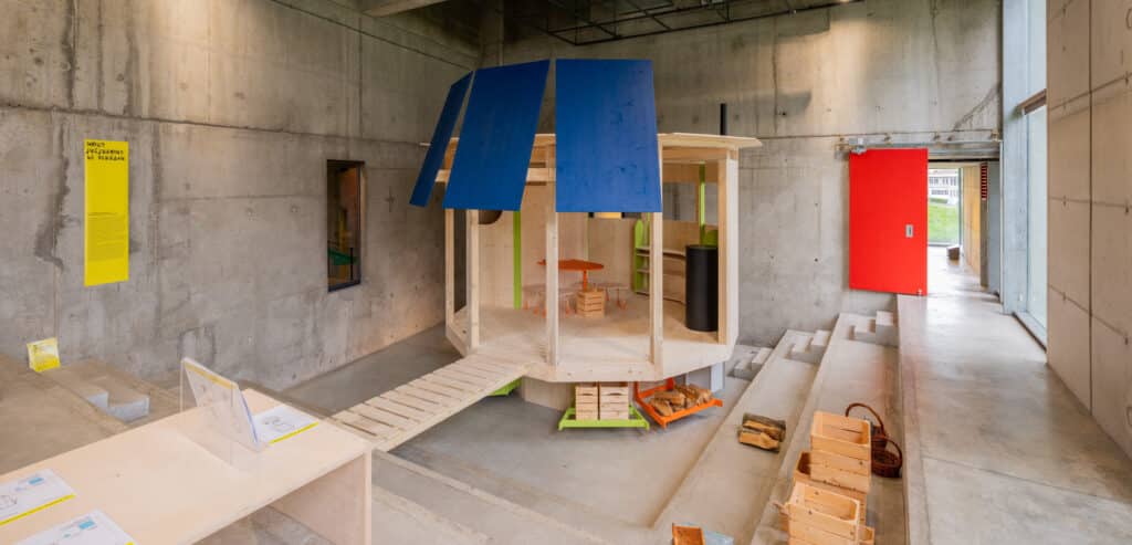 - Réparer le terrain : un espace de discussion collectif pensé comme une agora fluide, avec des tabourets mobiles, une structure boisée centrale et une scénographie participative. L’objectif : créer un commun, poser les bonnes questions et documenter nos débats. A découvrir aussi dans ce cadre, une installation à l’extérieur du lieu d’exposition pour activer un séchoir collectif avec les étudiants de la HEAD Genève.