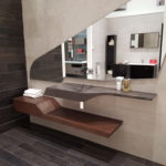 Nous retrouvons tous les matériaux de revêtements distribués par la marque, Krion (résine de synthèse dernière génération composée de deux tiers de minéraux naturels et d’un faible pourcentage de résines à grande résistance permettant d’allier performances et aspect naturel), carrelage, céramique, bois, verre, pierre, cuivre…