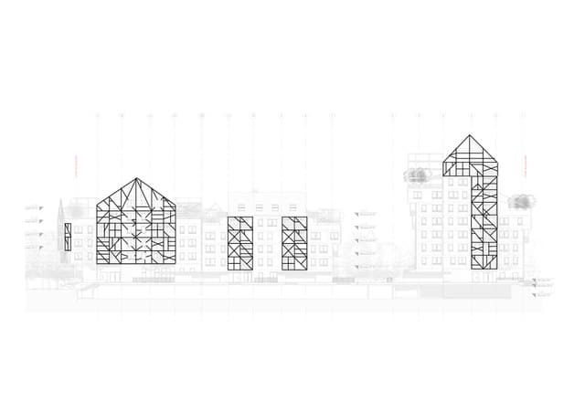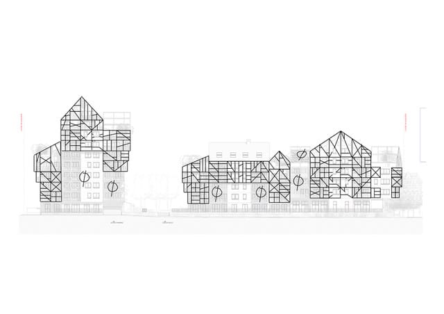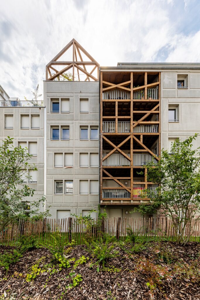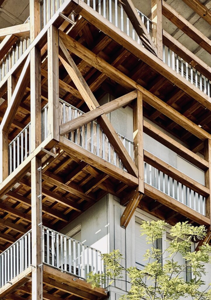 Le colombage n’y est pas un décor mais un moteur de composition : empreintes en creux dans le béton, terrasses aériennes et jeux de volumes. “Le défi était de donner l’impression que tout le bâtiment repose sur ces structures, tout en respectant les contraintes du béton et des prémurs”. Une prouesse technique qui mêle dessin, ingénierie et sens du détail, jusque dans les pignons, où l’équipe s’est “amusée” à jouer avec les avancées et retraits de volumes.