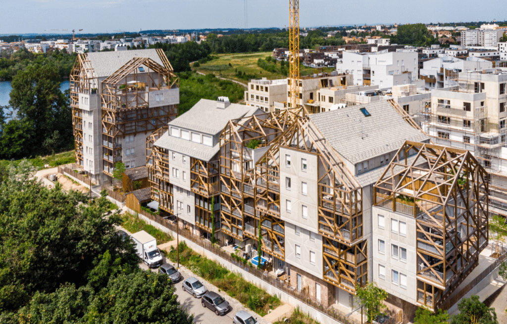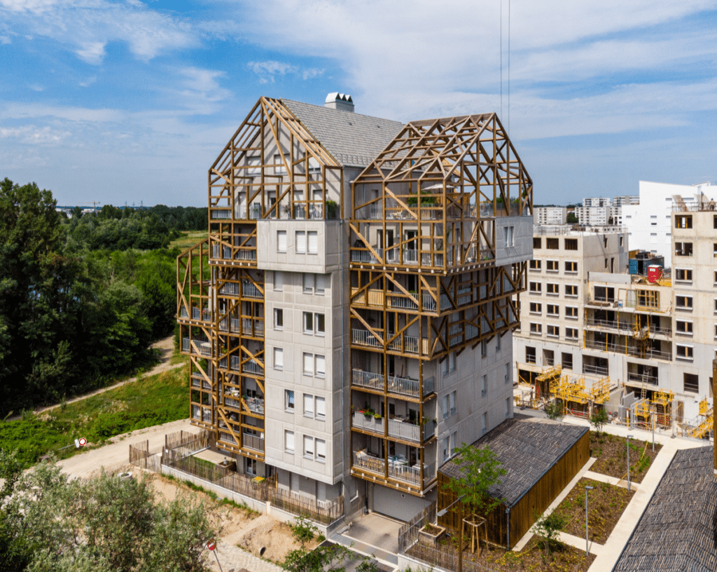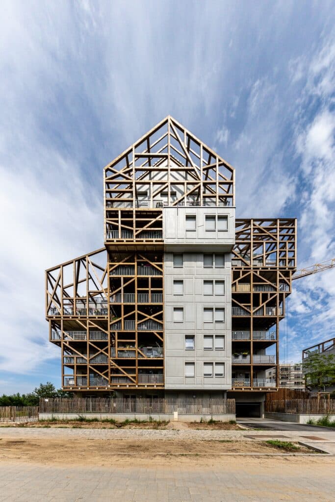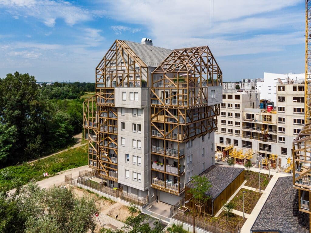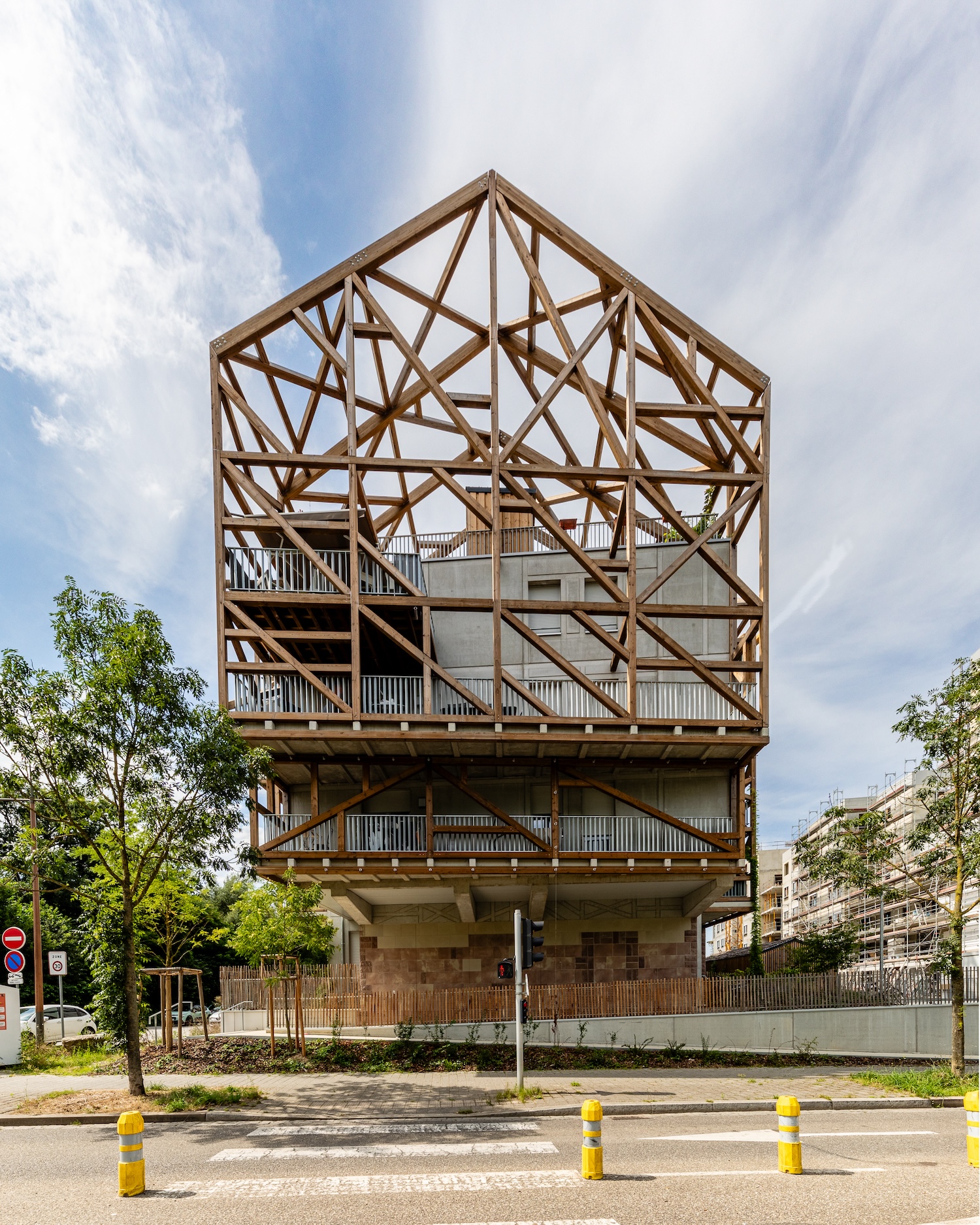 À Ostwald, dans la métropole strasbourgeoise, Édouard François signe pour Vinci Immobilier un ensemble de logements où le colombage alsacien retrouve une expression contemporaine. Pensé comme un manifeste contre la standardisation des villes, le projet associe architecture et poésie, à travers l’intervention de l’artiste François Mangeol sur la façade du bâtiment.