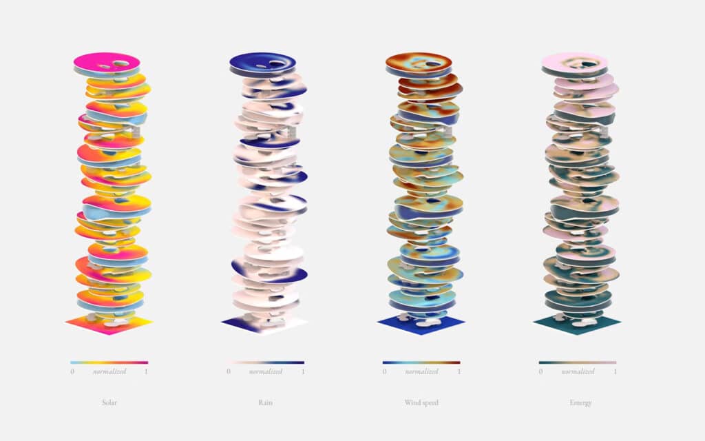 La tour se compose de plateformes circulaires connectées par un noyau central, avec des colonnes fines suspendant certains niveaux. Les écosystèmes de forêts et de prairies qui croissent sur l’extérieur de la tour gèrent des services naturels tels que la séquestration du carbone et la régulation thermique.