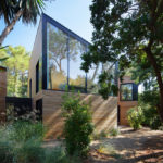 « A l’image de la presqu’ile du Cap Ferret, le terrain qui descend en pente douce vers la mer est une petite pinède d’arbousiers, yuccas et pins, typiques de la région. Il s’agissait donc de concevoir un projet en harmonie avec son paysage et limitant son impact sur l’environnement végétal existant. Rappelant les cabanes dans les arbres, la maison multiplie les percées visuelles qui accentuent sa relation à la nature. Son implantation permet de conserver au maximum les arbres existants tandis que le bois est majoritairement utilisé en façade jouant du mimétisme avec la pinède. »