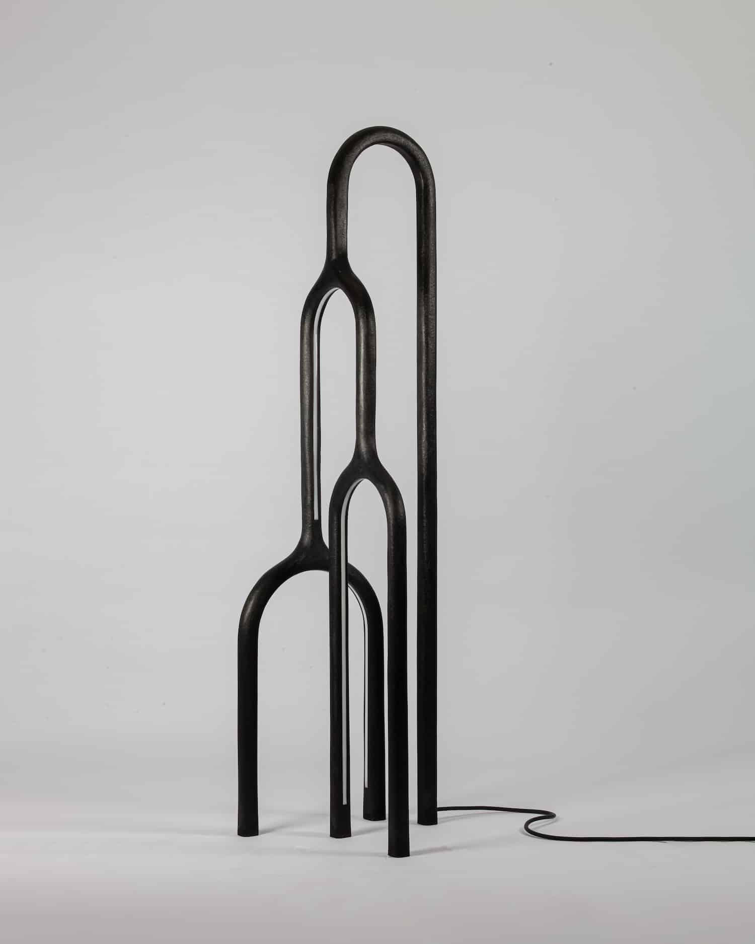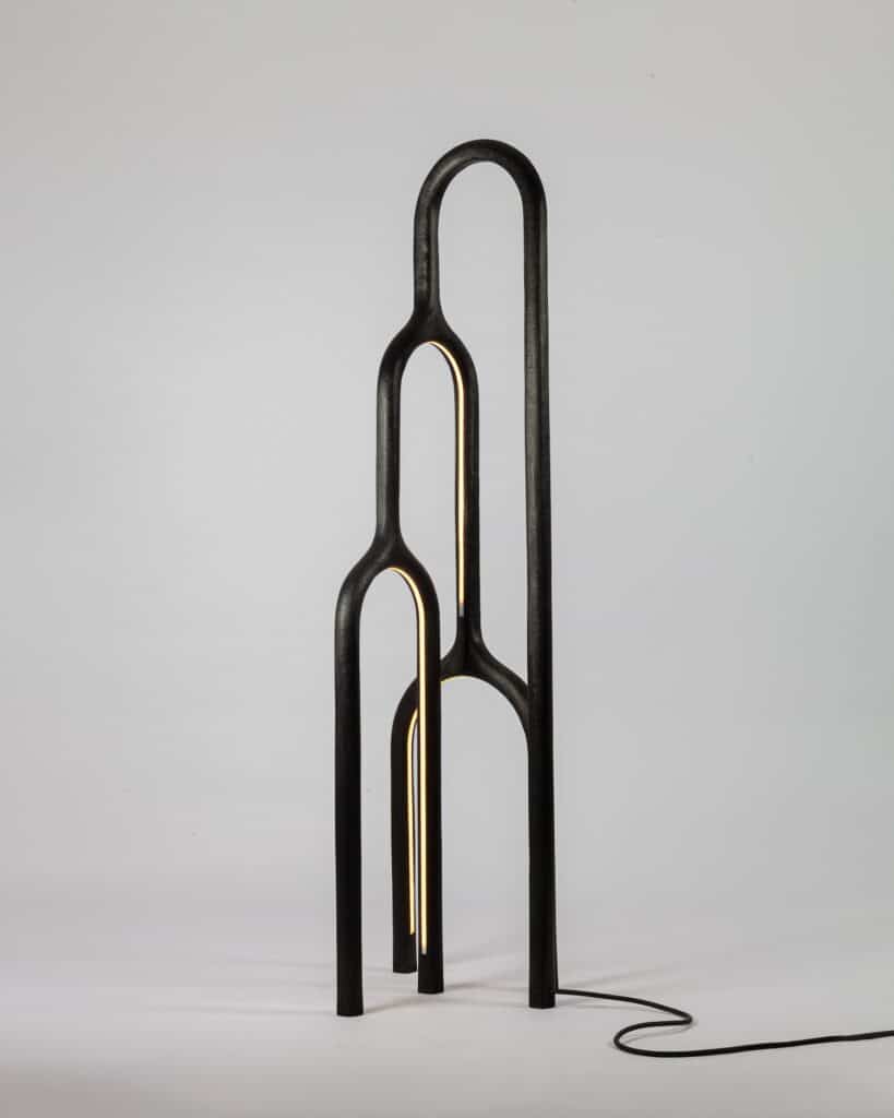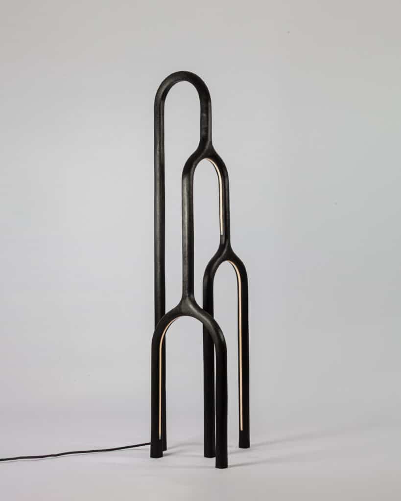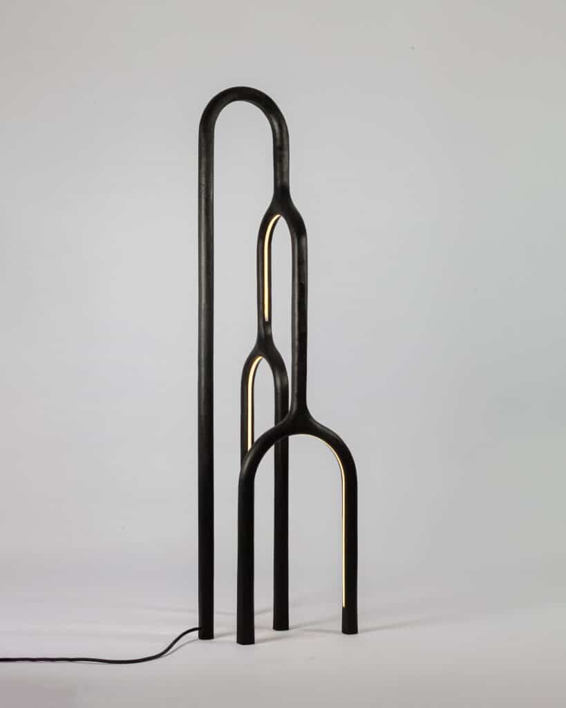 Dans cette nouvelle déclinaison (auparavant miroir), on devine la rigueur de l’architecte et la sensibilité du sculpteur. ARC n°1 n’est pas une lampe, c’est une oeuvre sculptée, une ligne lumineuse qui suggère le mouvement, le temps, l’équilibre tout en rondeur, en arrondis. Le métal patiné porte les traces du feu, du façonnage, d’un rapport direct à la matière soulignant la force des éléments. Chaque pièce révèle cette volonté d’ancrer le design dans une forme de lenteur, une pensée artisanale à rebours de la standardisation.