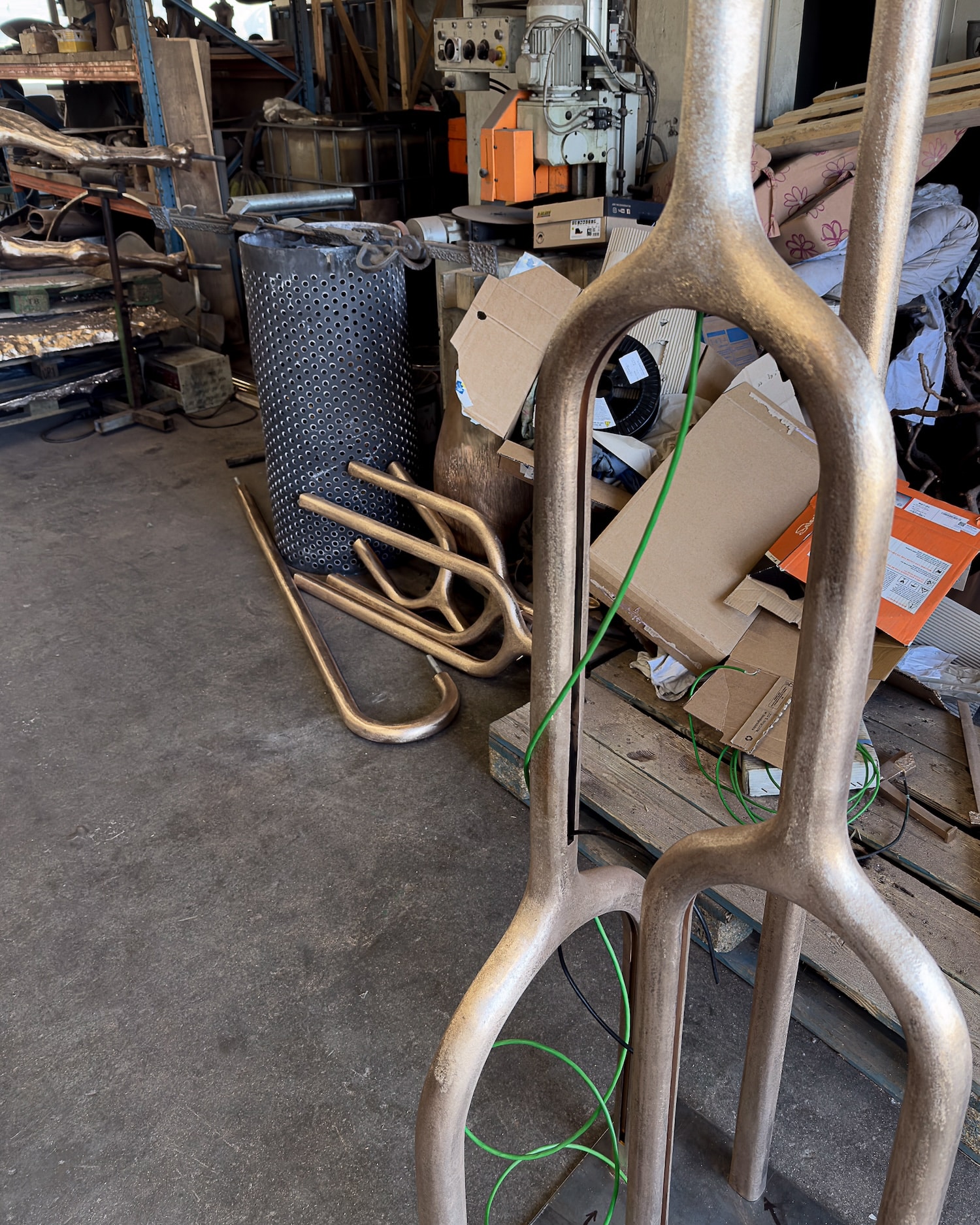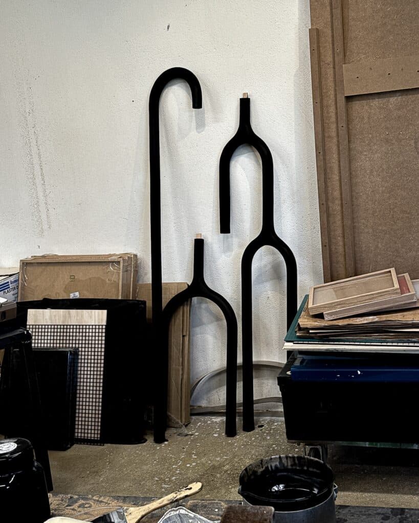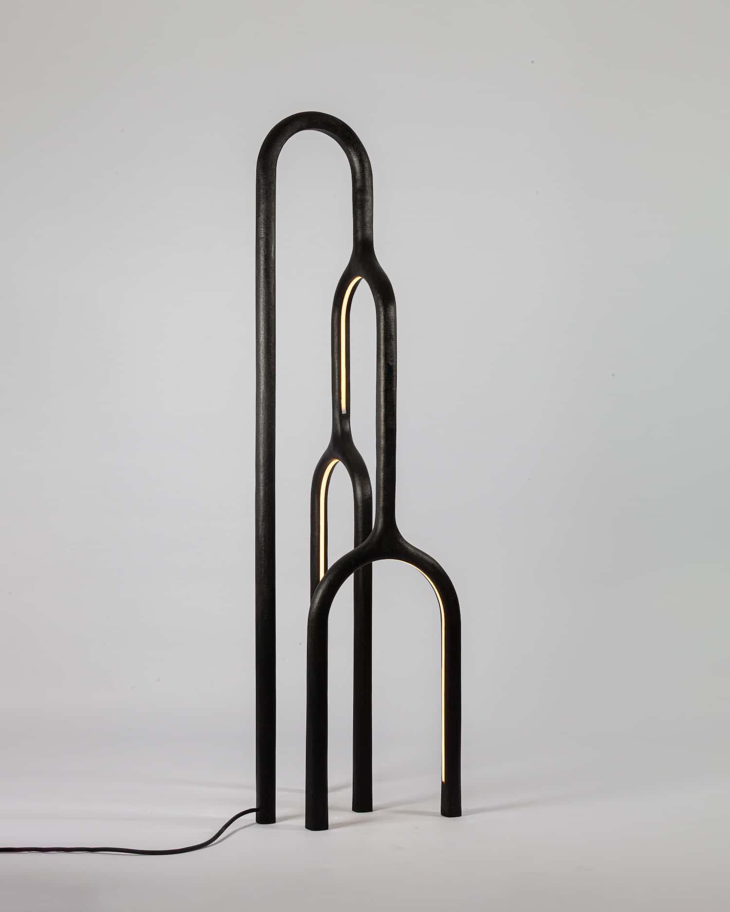 Dans cette nouvelle déclinaison (auparavant miroir), on devine la rigueur de l’architecte et la sensibilité du sculpteur. ARC n°1 n’est pas une lampe, c’est une oeuvre sculptée, une ligne lumineuse qui suggère le mouvement, le temps, l’équilibre tout en rondeur, en arrondis. Le métal patiné porte les traces du feu, du façonnage, d’un rapport direct à la matière soulignant la force des éléments. Chaque pièce révèle cette volonté d’ancrer le design dans une forme de lenteur, une pensée artisanale à rebours de la standardisation.