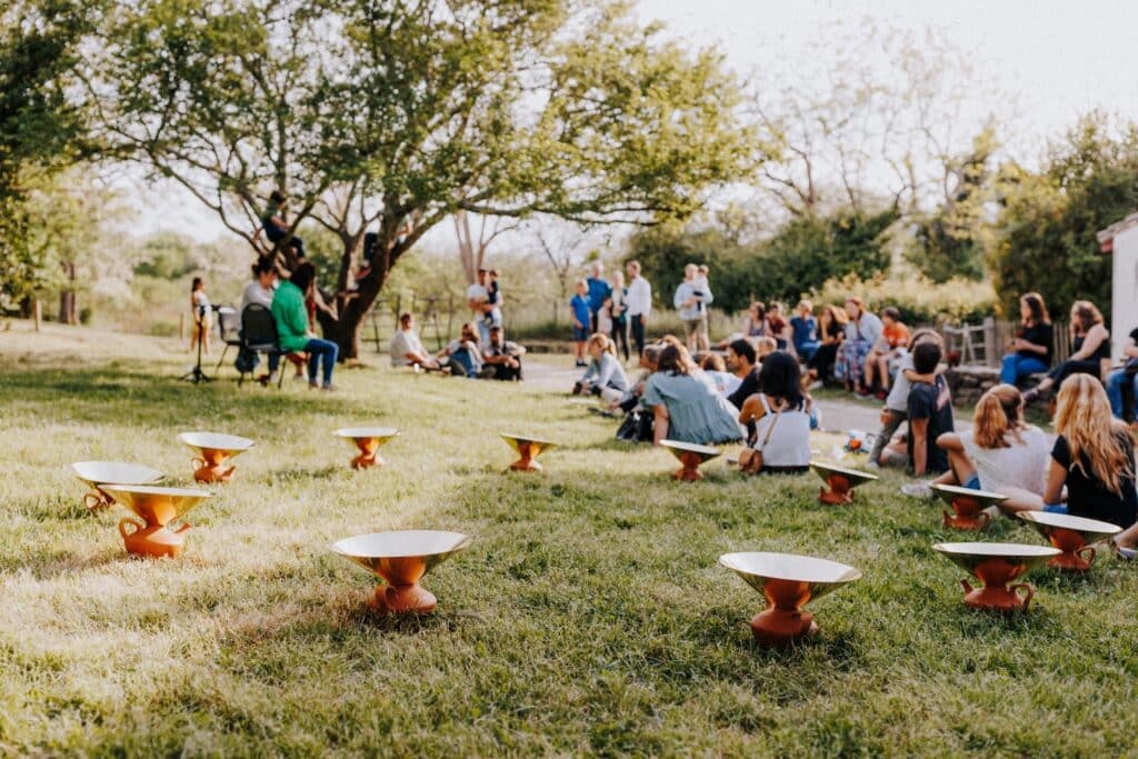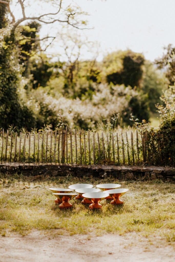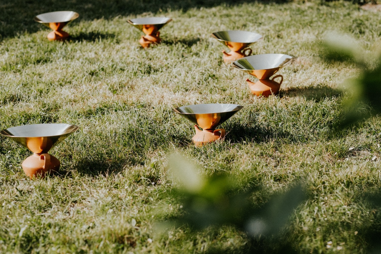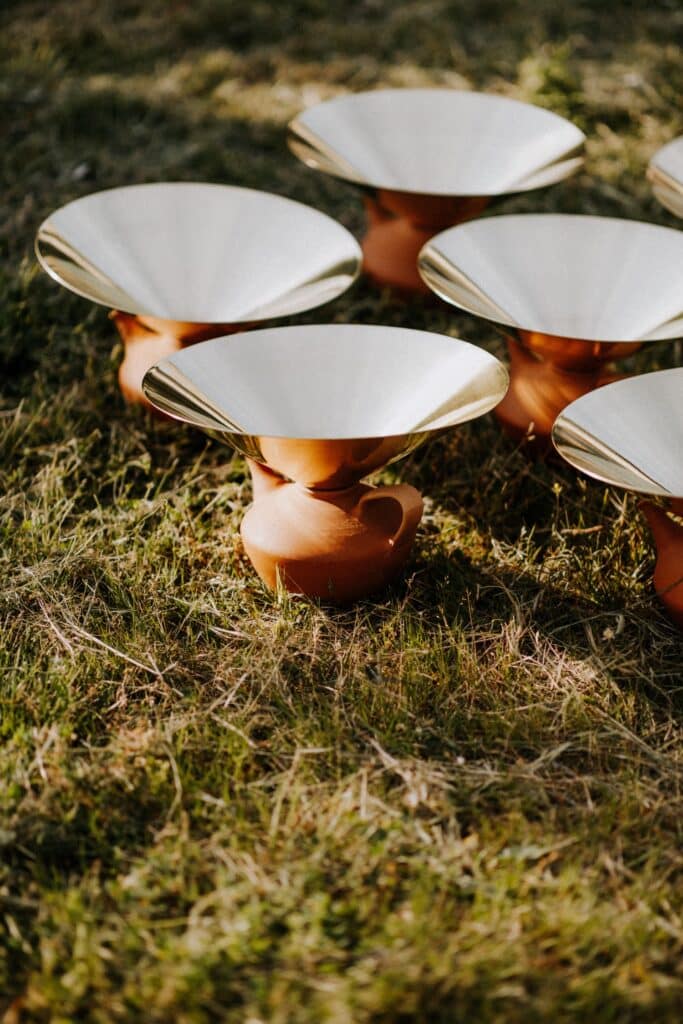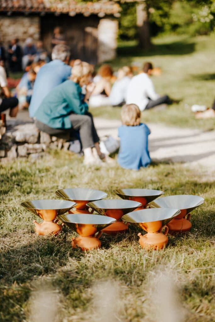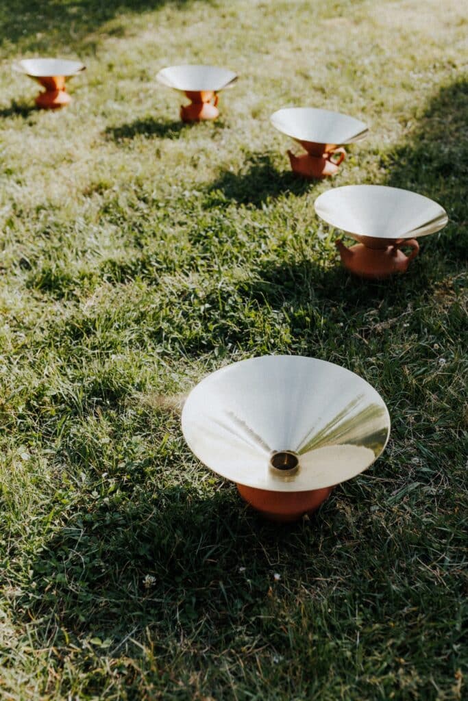 Le projet Eau, Pegarra a été présenté lors de l’exposition en plein air « Entre Terre & ciel » en 2023, permettant aux visiteurs d’expérimenter l’installation dans son contexte naturel. Les photographies de Marc-Alexandre Ducoté et Marion Saettele captent cette rencontre entre les éléments : l’argile ocre, le laiton doré, l’herbe verte et le ciel changeant. Chaque image témoigne d’un dialogue entre matières, entre tradition et contemporanéité, entre fonctionnalité et poésie.