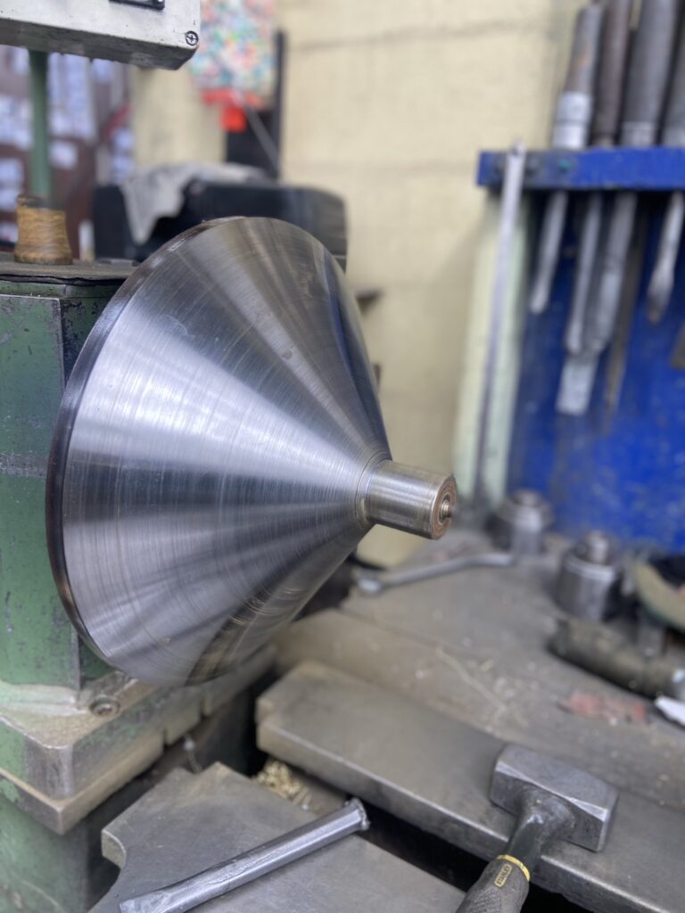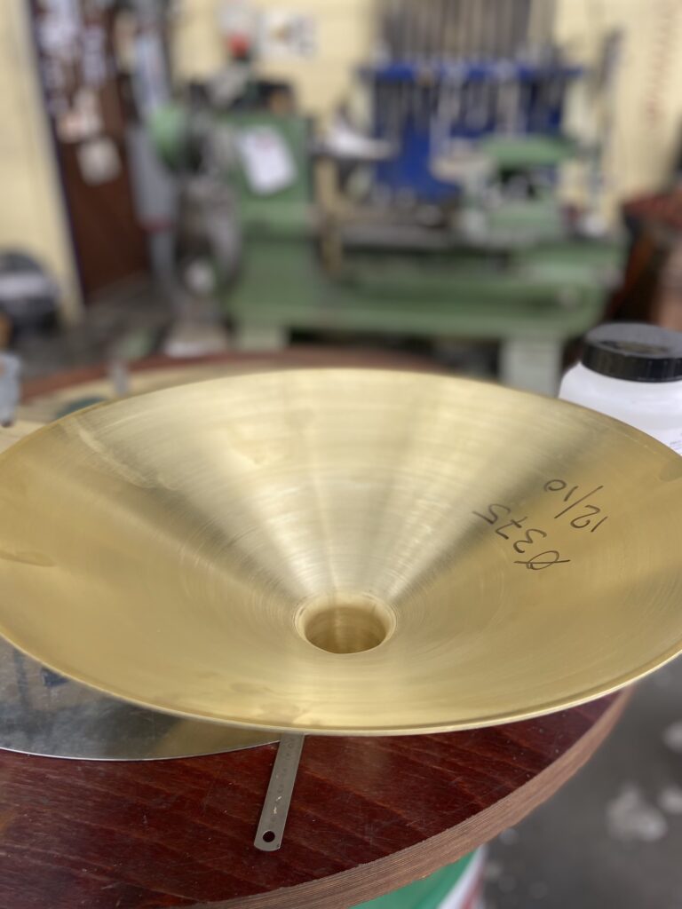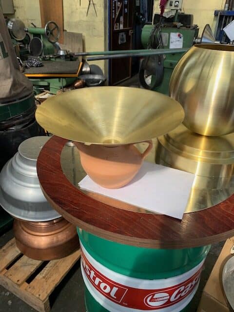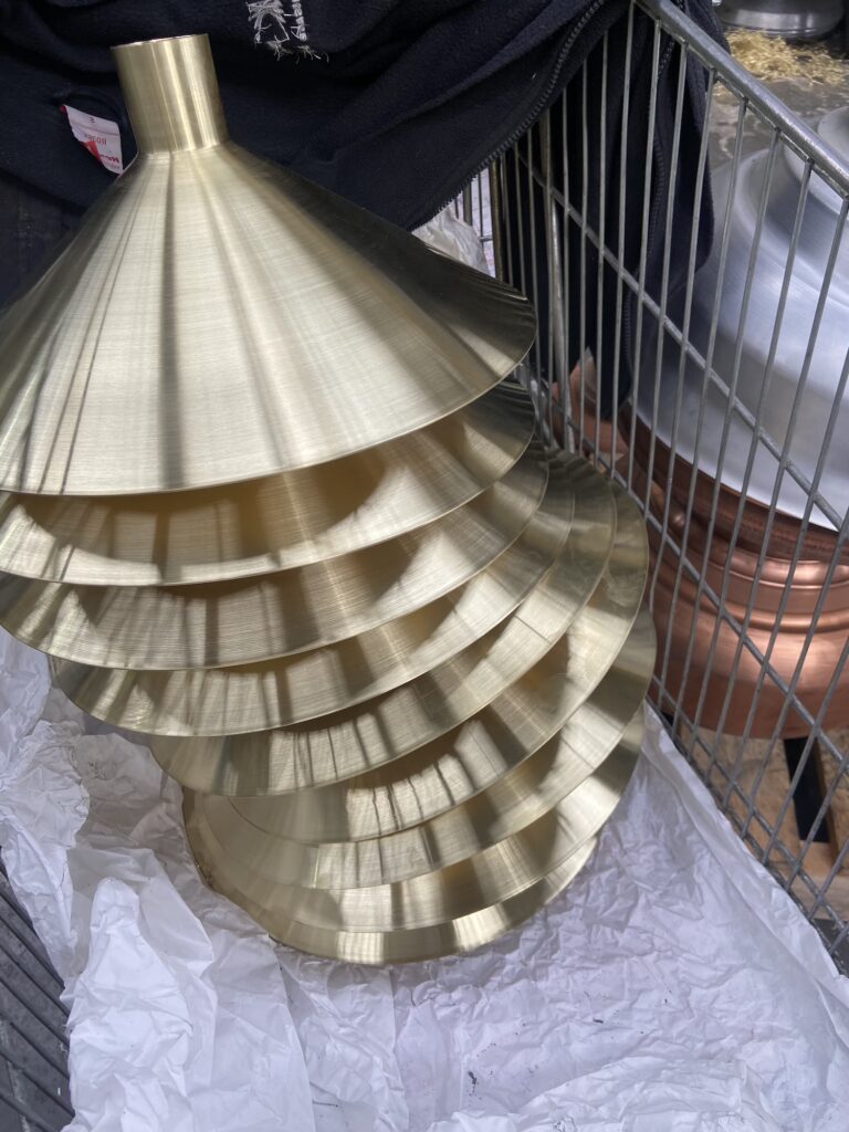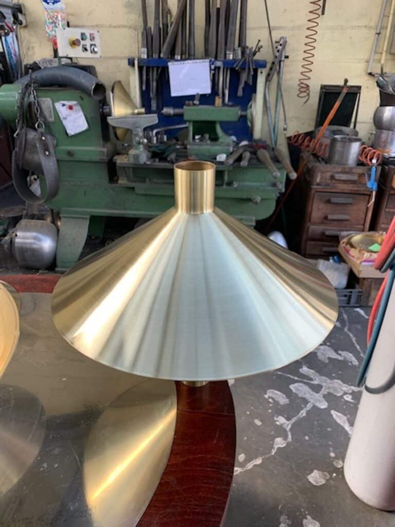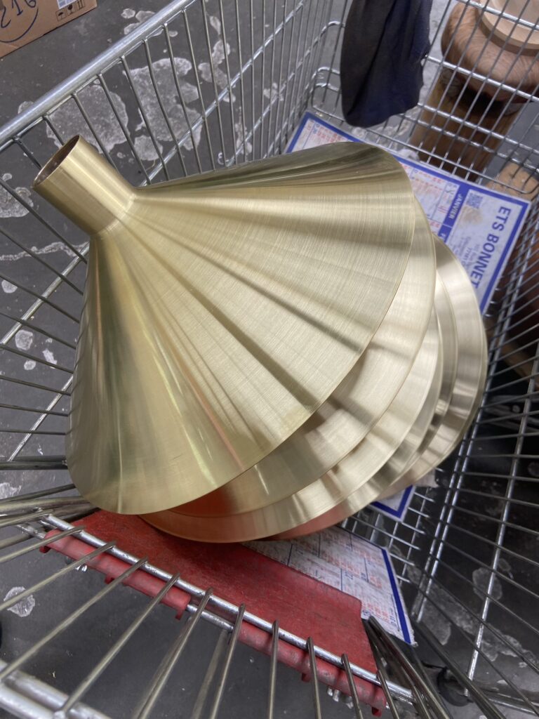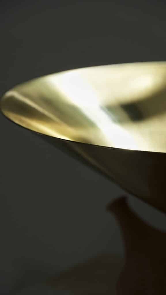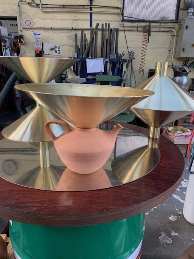 Au sommet de chaque Pegarra, une corolle en laiton poli miroir capte la lumière autant que les gouttes de pluie. Repoussé par Francis Parain à Chanteloup-en-brie, ce métal précieux rappelle les créations où le laiton devient élément sculptural, jouant sur les contrastes de matières et les reflets changeants.
