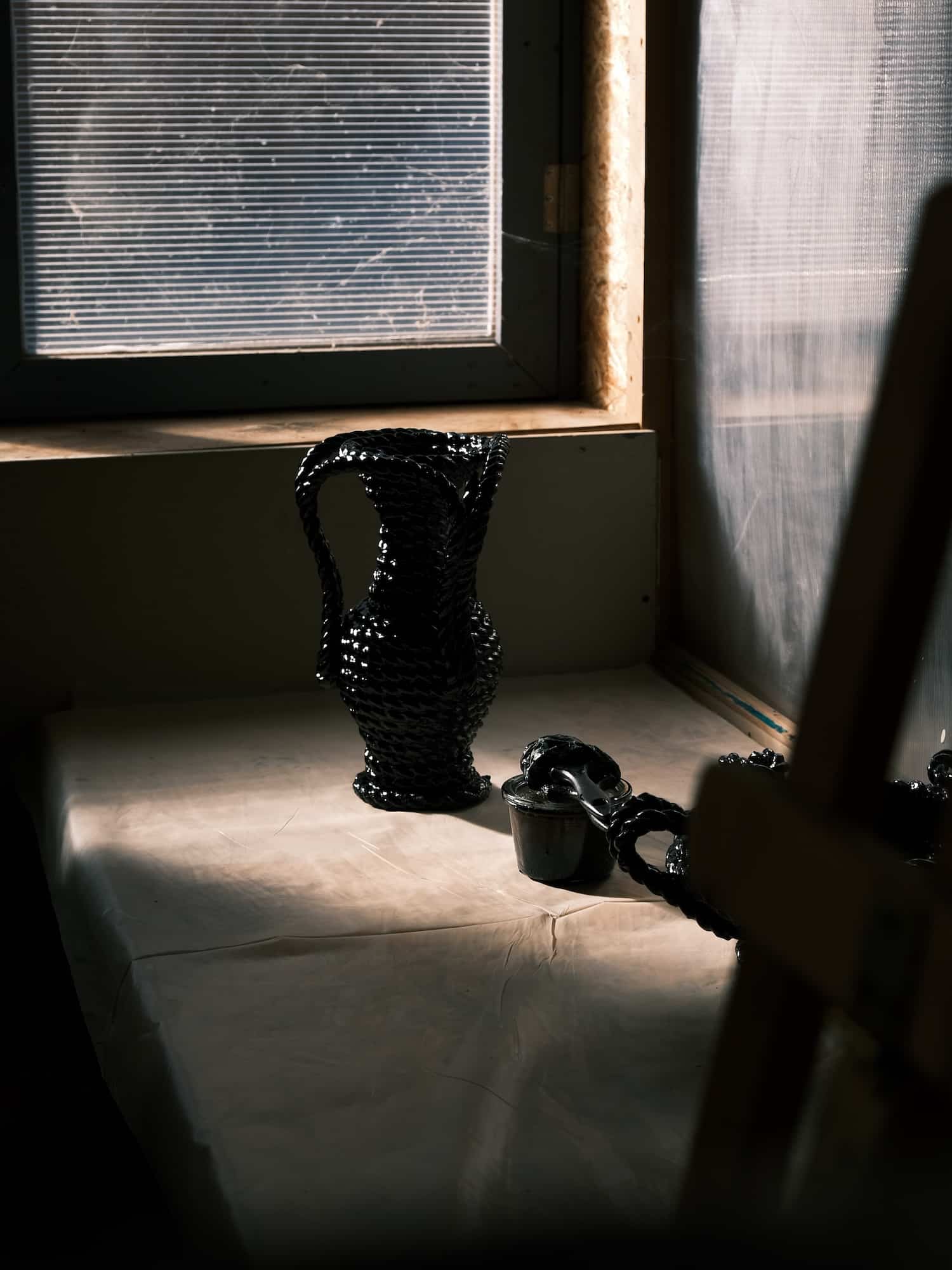 La structure de chaque vase repose sur une corde en chanvre française, torsadée puis mise en forme. Tous les volumes partagent une même base de 10 mètres de corde, mais se distinguent par leur typologie inspirée de l’Antiquité hellénistique : hydria, stamnos, pelike, coupe ou nestoris. Ce choix affirme une volonté de croiser les héritages culturels, en mêlant techniques asiatiques et formes méditerranéennes.