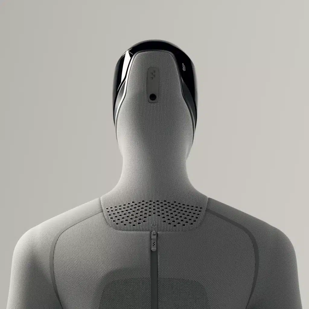 L’une des innovations majeures du F.03 réside dans son enveloppe extérieure : des surfaces tricotées 3D sur mesure qui remplissent à la fois une fonction esthétique et sécuritaire. Cette couche textile souple, associée à des composants corporels enveloppés de mousse, ne constitue pas uniquement une mesure de protection. Elle donne au F.03 une présence plus accessible, presque amicale, marquant une rupture délibérée avec l’esthétique froide et mécanique habituellement associée à la robotique et au métal.