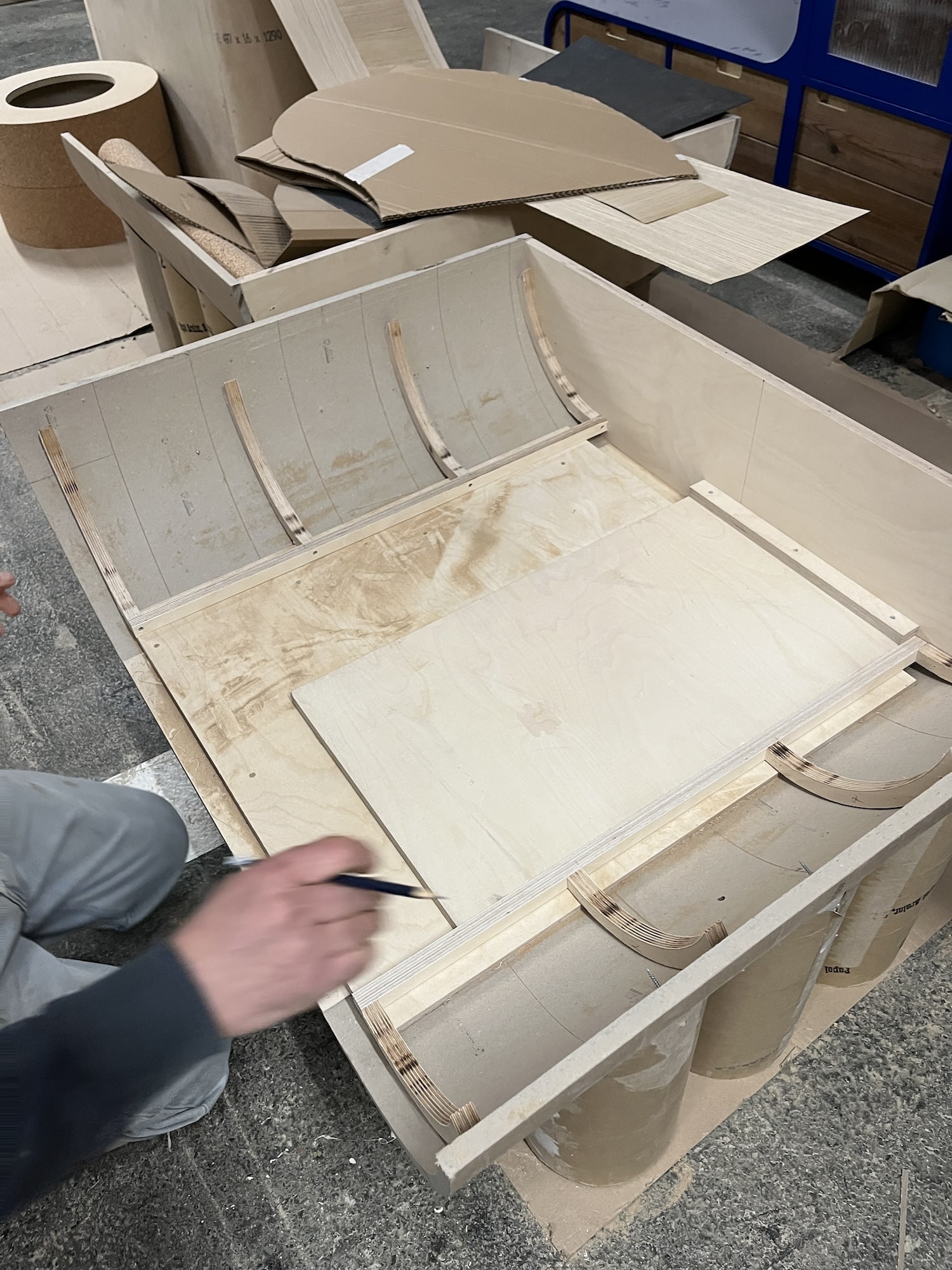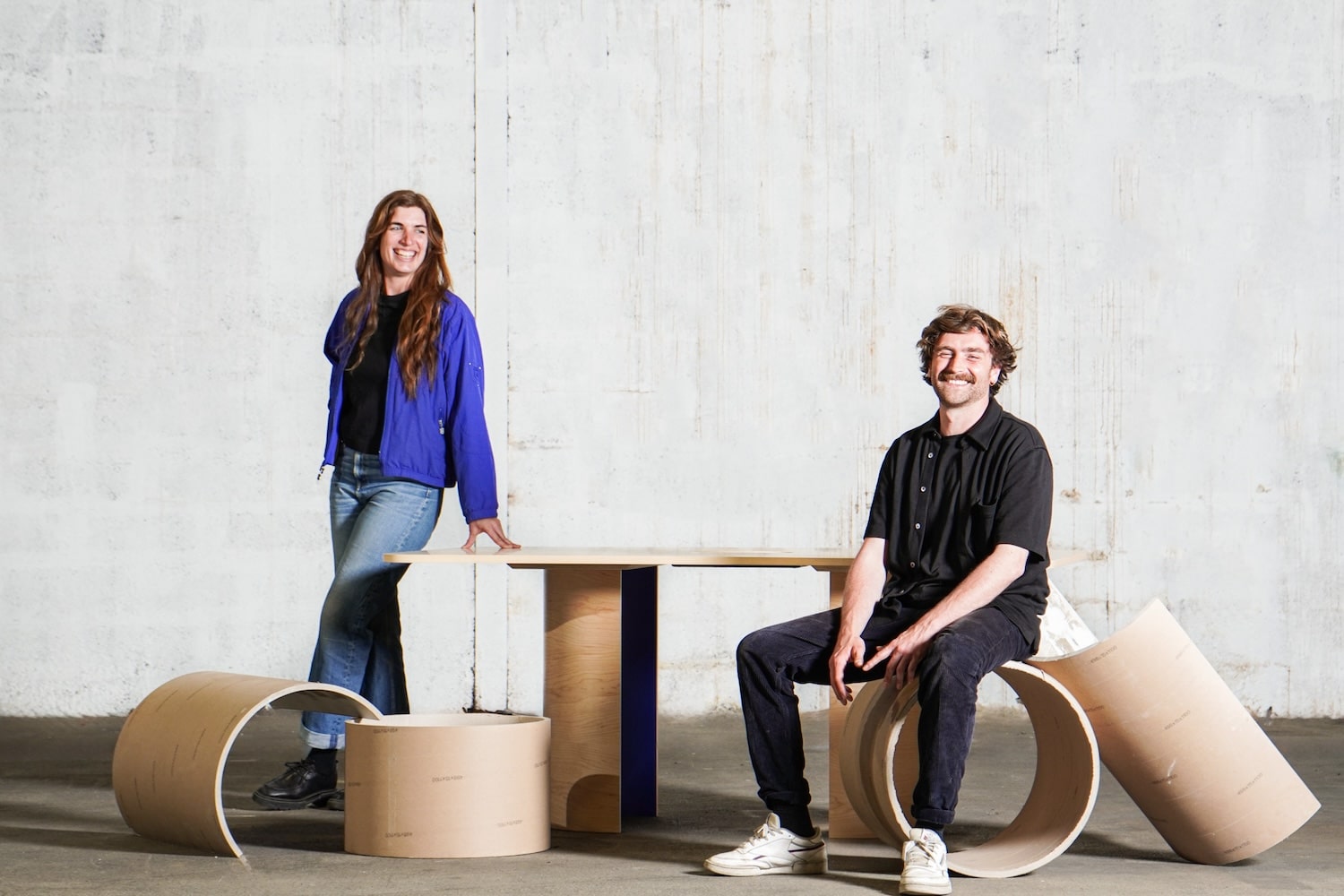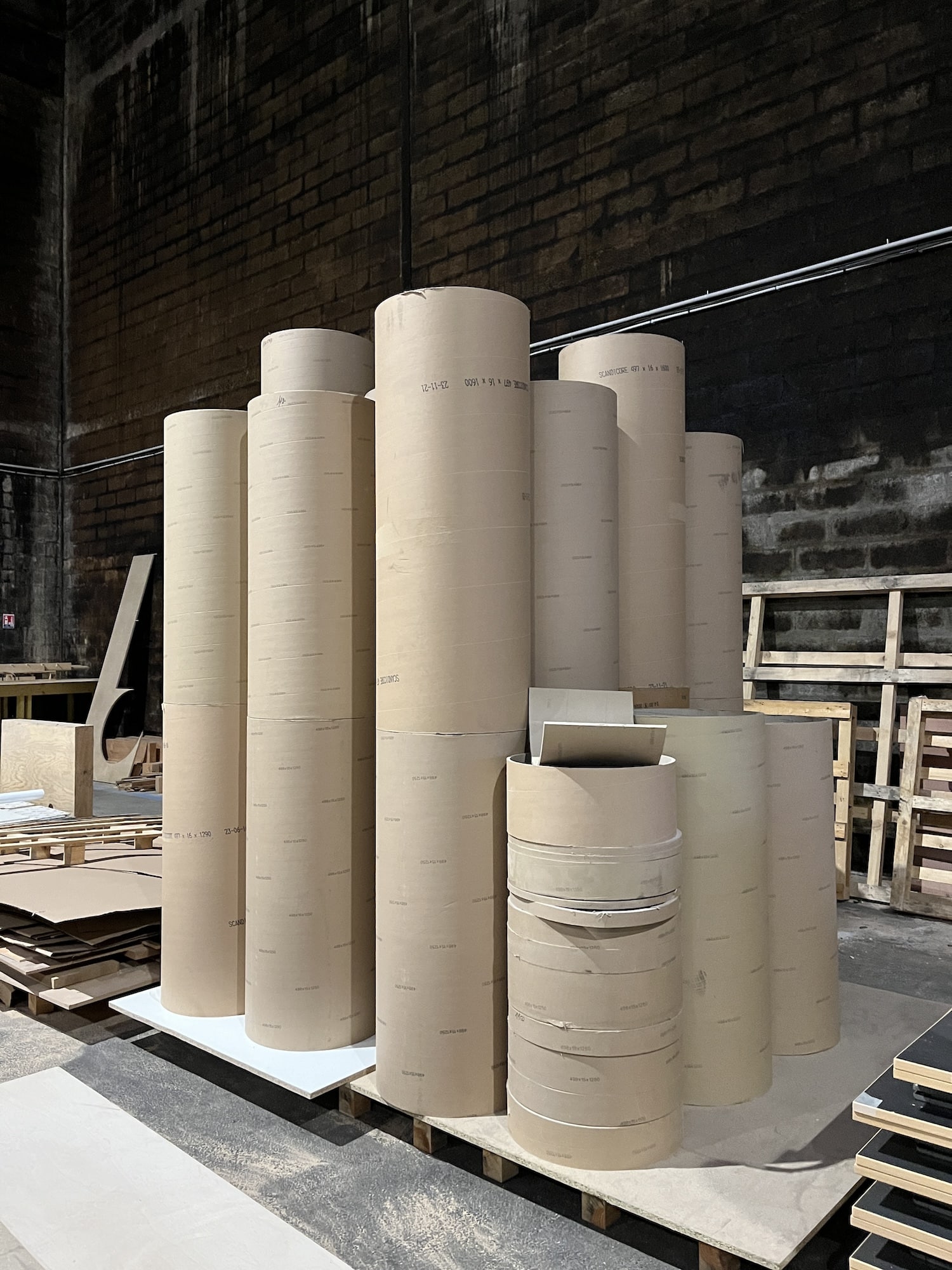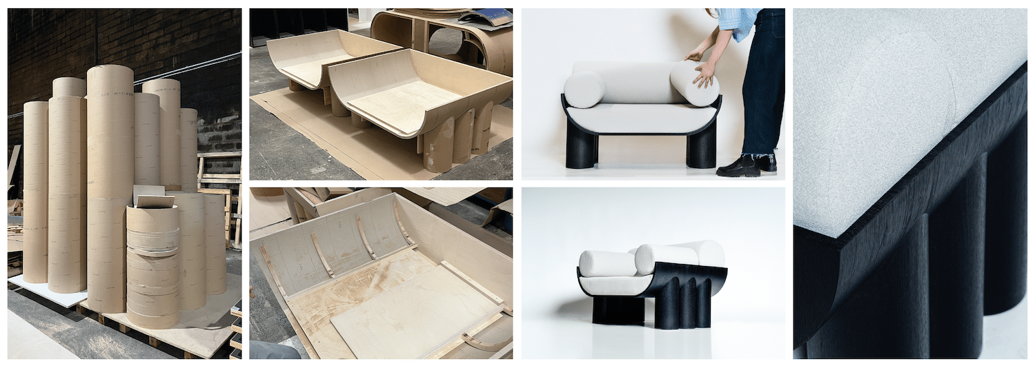initialement à la recherche d’aluminium, les deux designers découvrent un déchet inattendu : des viroles, des simples tubes en carton de 53 cm de diamètre. Une matière humble, abondante et standardisée, dont le potentiel formel et constructif apparaît immédiatement.
