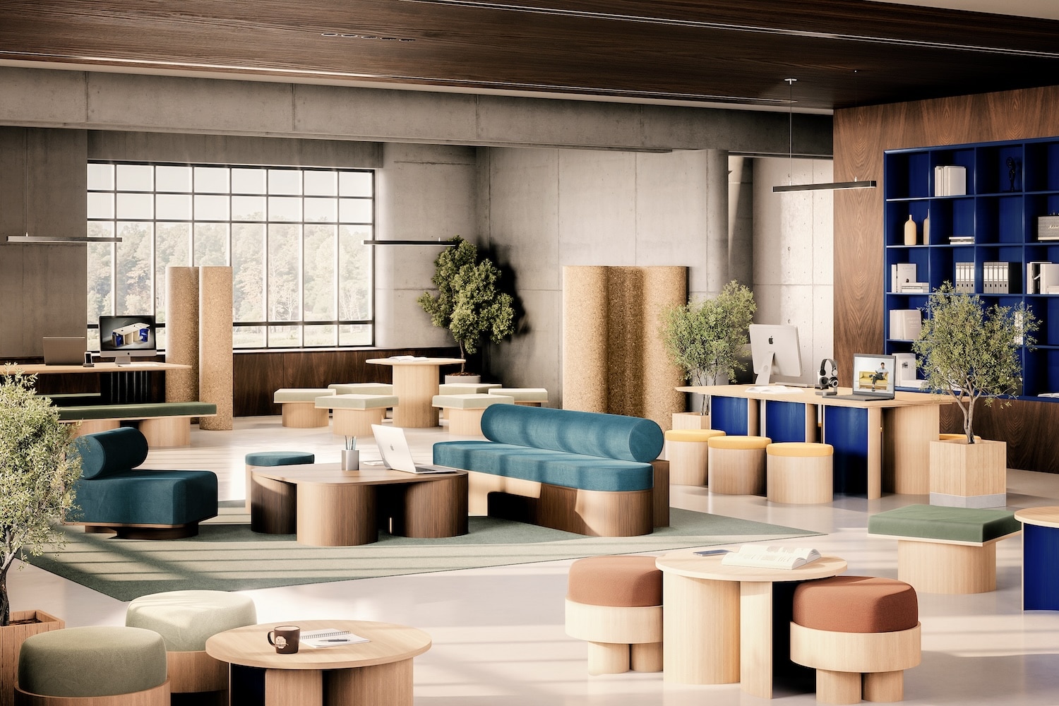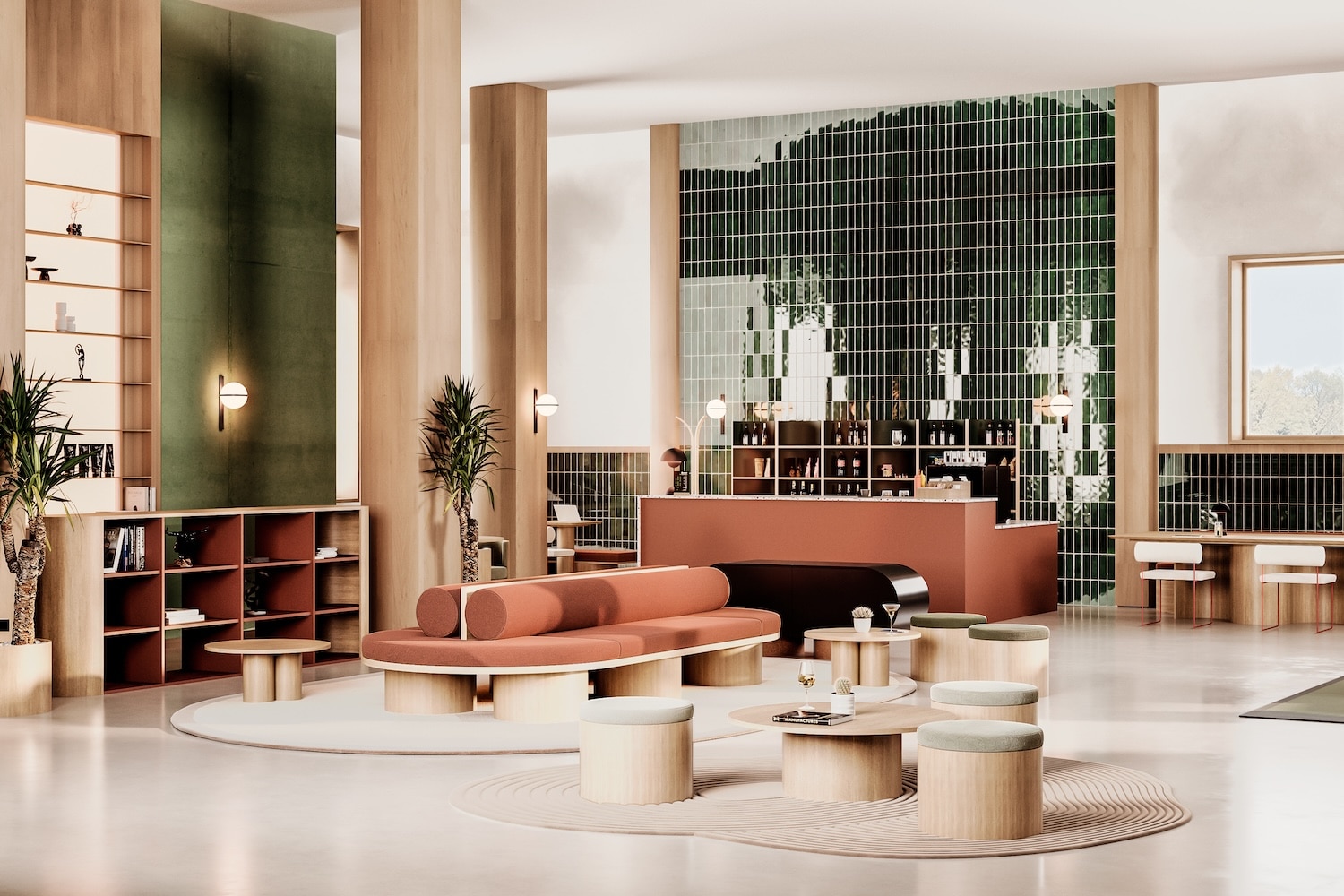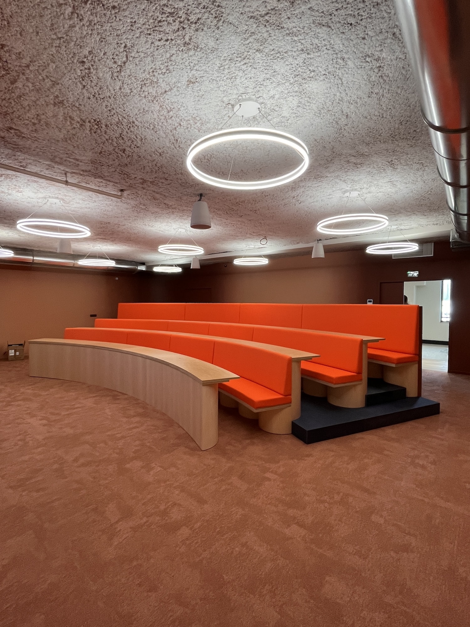 Gimmic Design a conçu l’aménagement intérieur d’un ensemble de 675 m2, mêlant mobilier de catalogue et créations sur mesure, notamment pour l’auditorium. Au total, 1 032 kg de viroles en carton et 48 kg de tubes de papeterie ont été réemployés sur le chantier. Des chiffres concrets, loin du geste manifeste, qui démontrent ce que le réemploi peut produire à