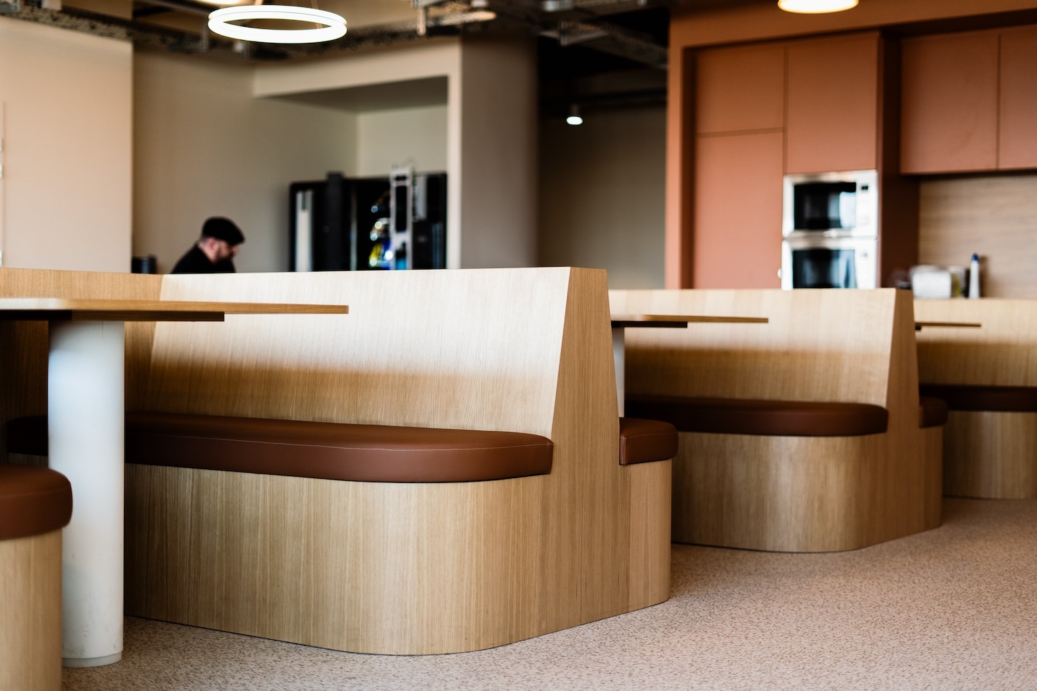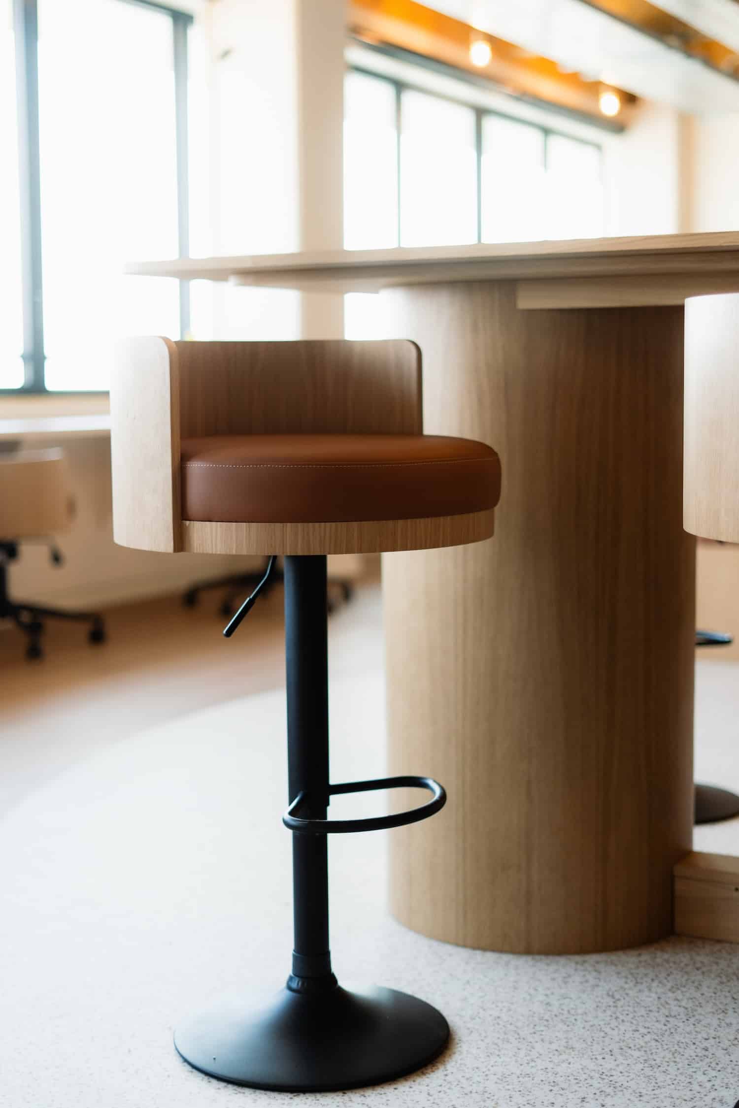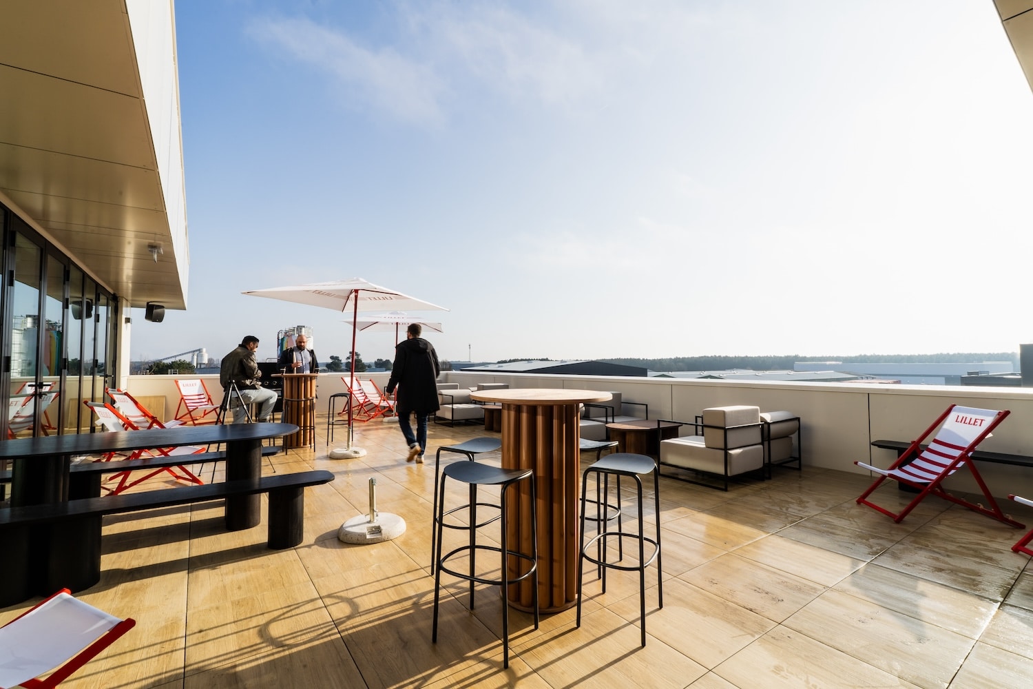 Fidèle à son approche collaborative, Gimmic n’a pas travaillé seul. Pour l’espace de restauration, 46 chaises signées Instead Mobilier, studio nantais qui fabrique à partir des résidus de brassage de la bière. Les plateaux de tables ? En plastique recyclé, réalisés avec Plastoo, structure bordelaise spécialisée dans la collecte, la transformation et la valorisation du plastique : 234 kg de matière détournée des déchets pour ce projet.
