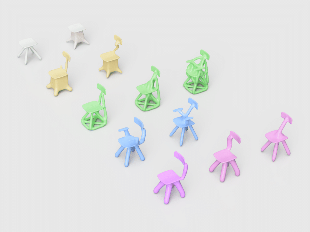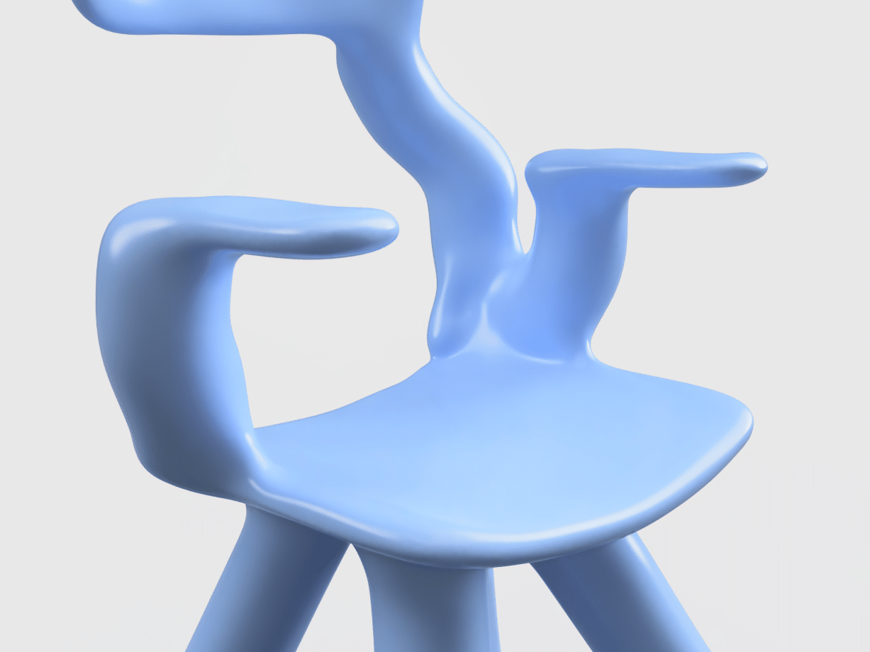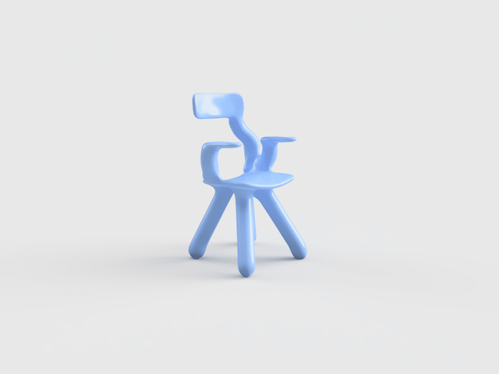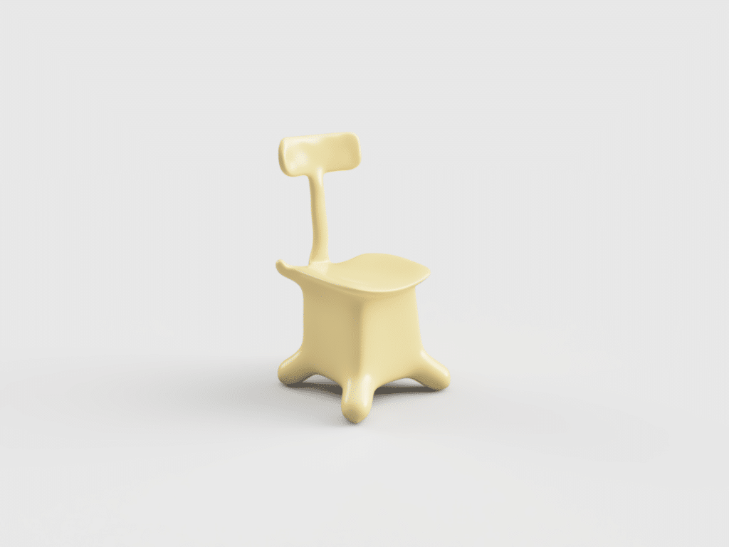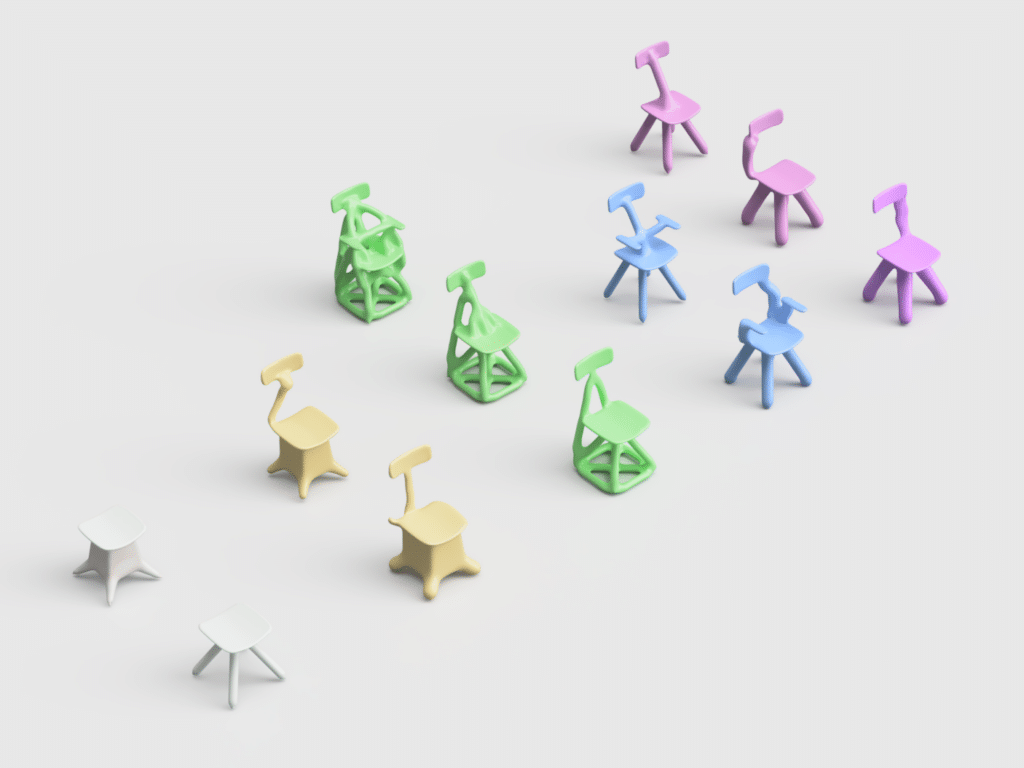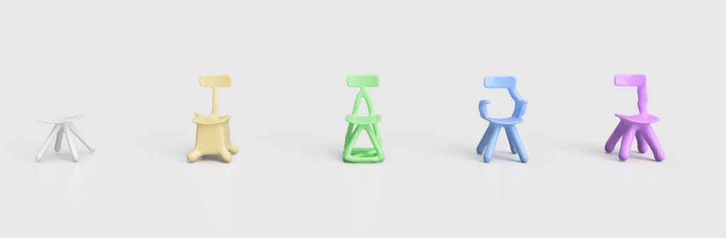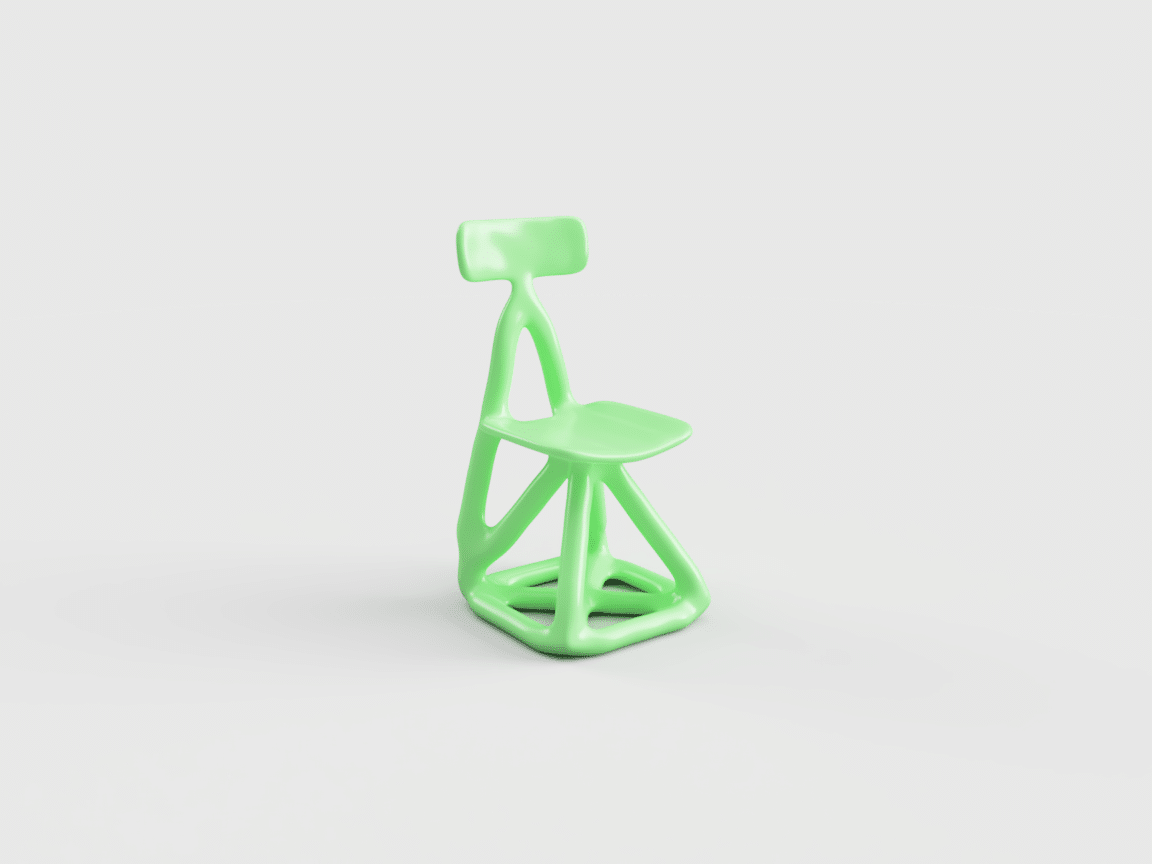 Loin d’une quête d’optimisation, son processus repose sur une base CAO simple, quatre pieds, une assise, parfois des accoudoirs, enrichie de contraintes structurelles volontairement absurdes, pour voir comment la machine se débrouille avec l’irrationnel.