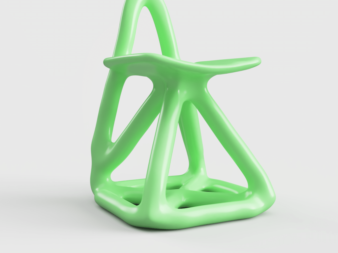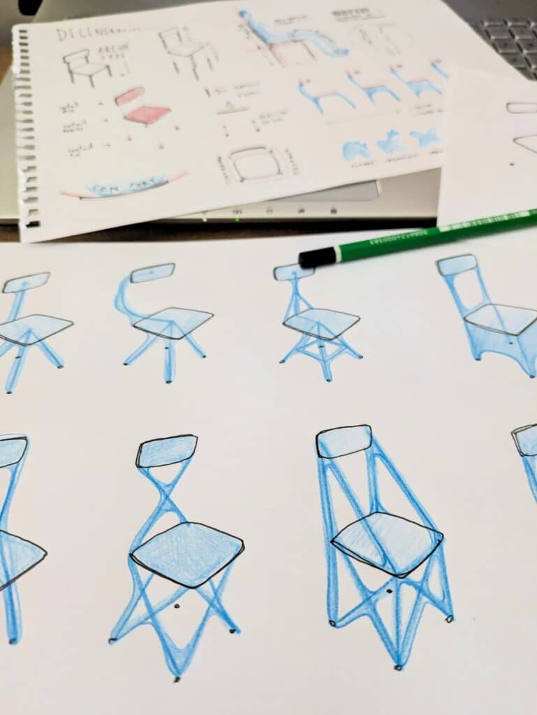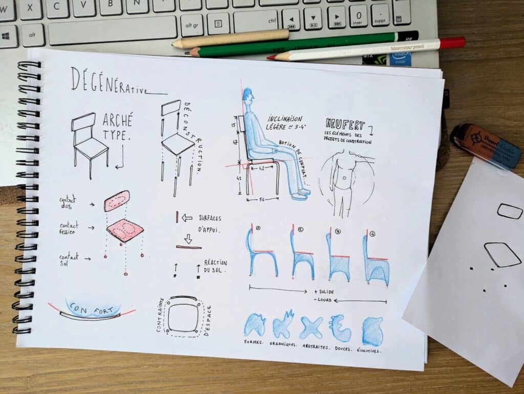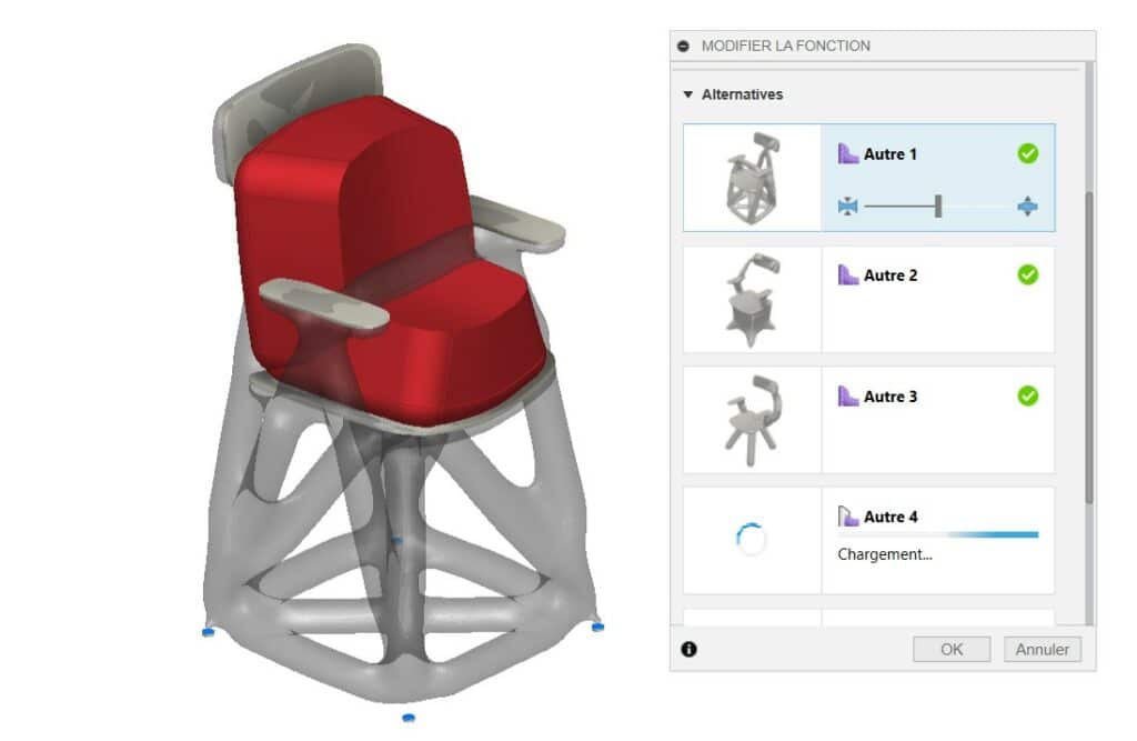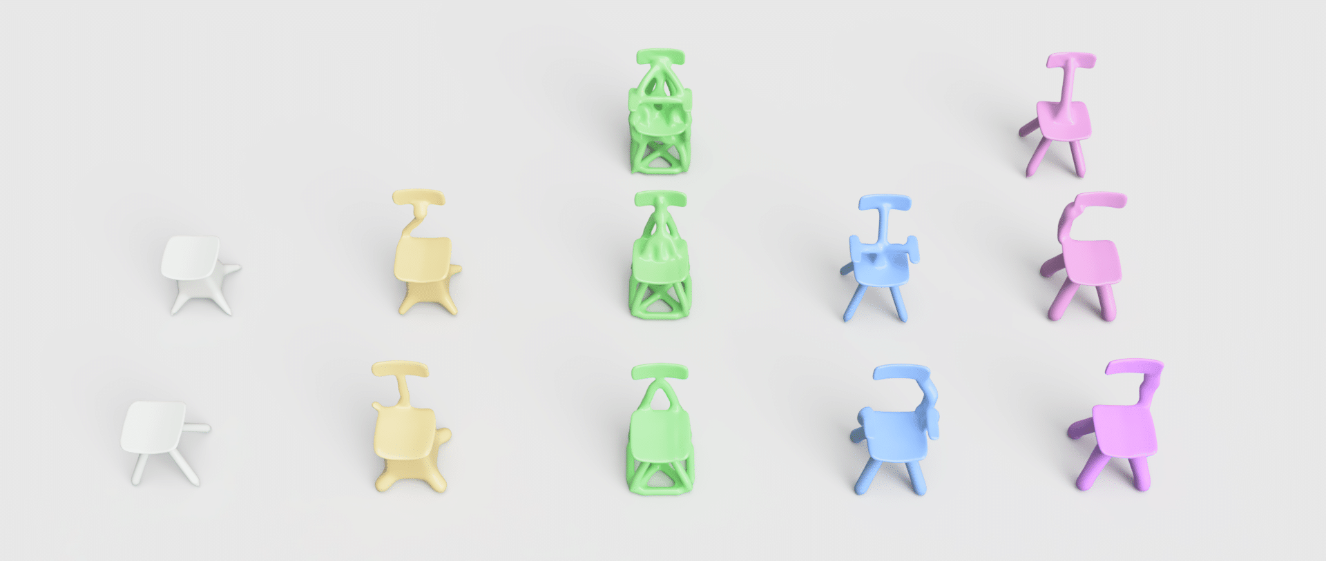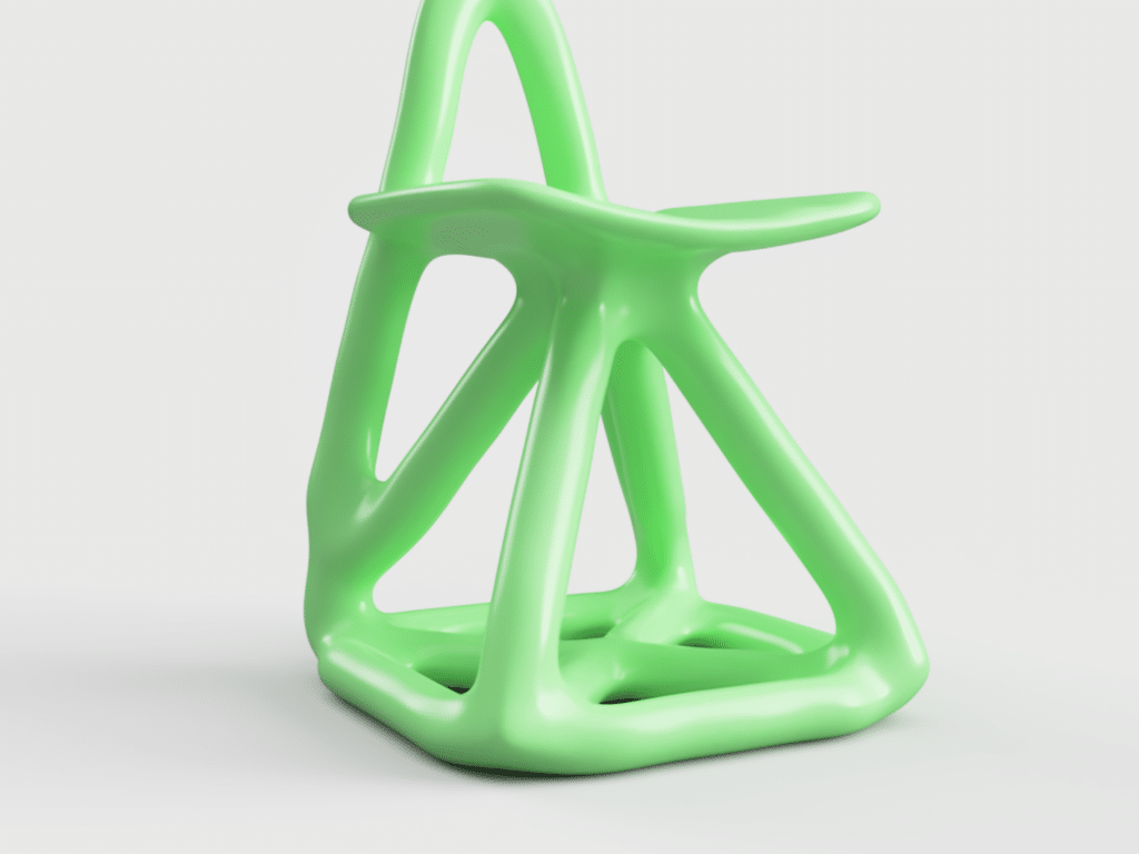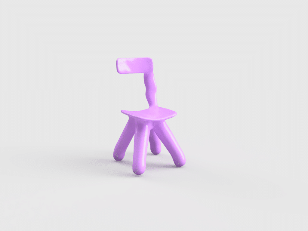 Loin d’une quête d’optimisation, son processus repose sur une base CAO simple, quatre pieds, une assise, parfois des accoudoirs, enrichie de contraintes structurelles volontairement absurdes, pour voir comment la machine se débrouille avec l’irrationnel.