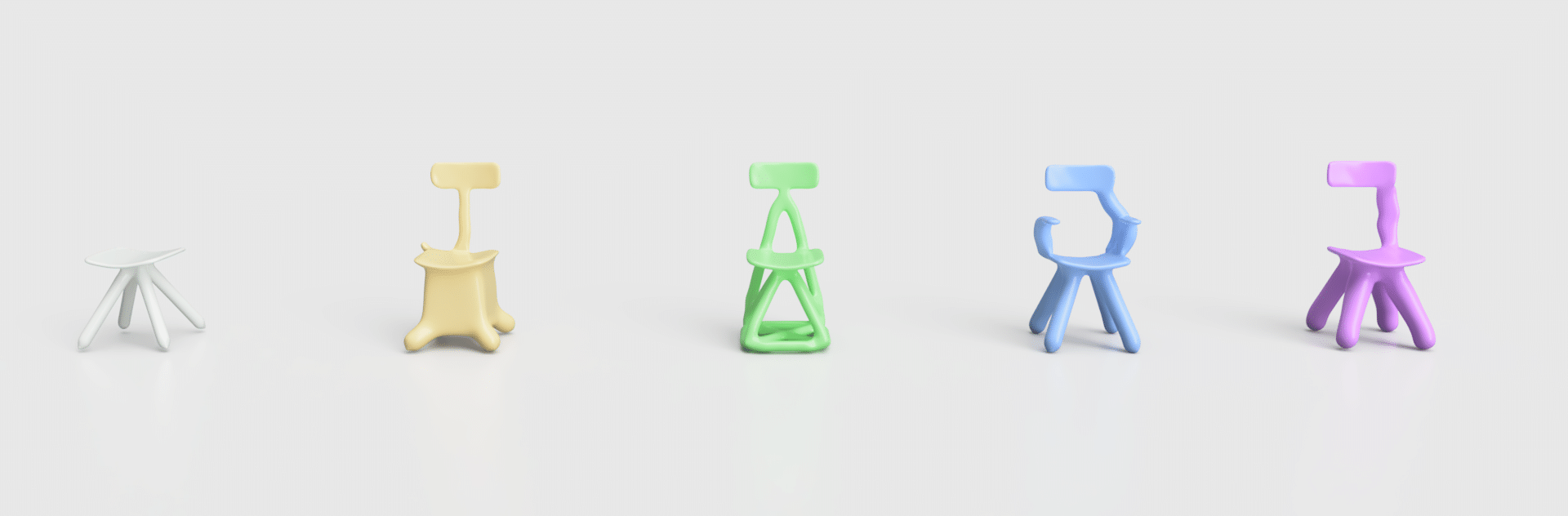 Chaque itération donne lieu à une forme inédite, parfois étonnamment cohérente, parfois entièrement farfelue. Le résultat : une série d’assises aux formes déviantes, presque utilisables, parfois poétiques, toujours provocantes.