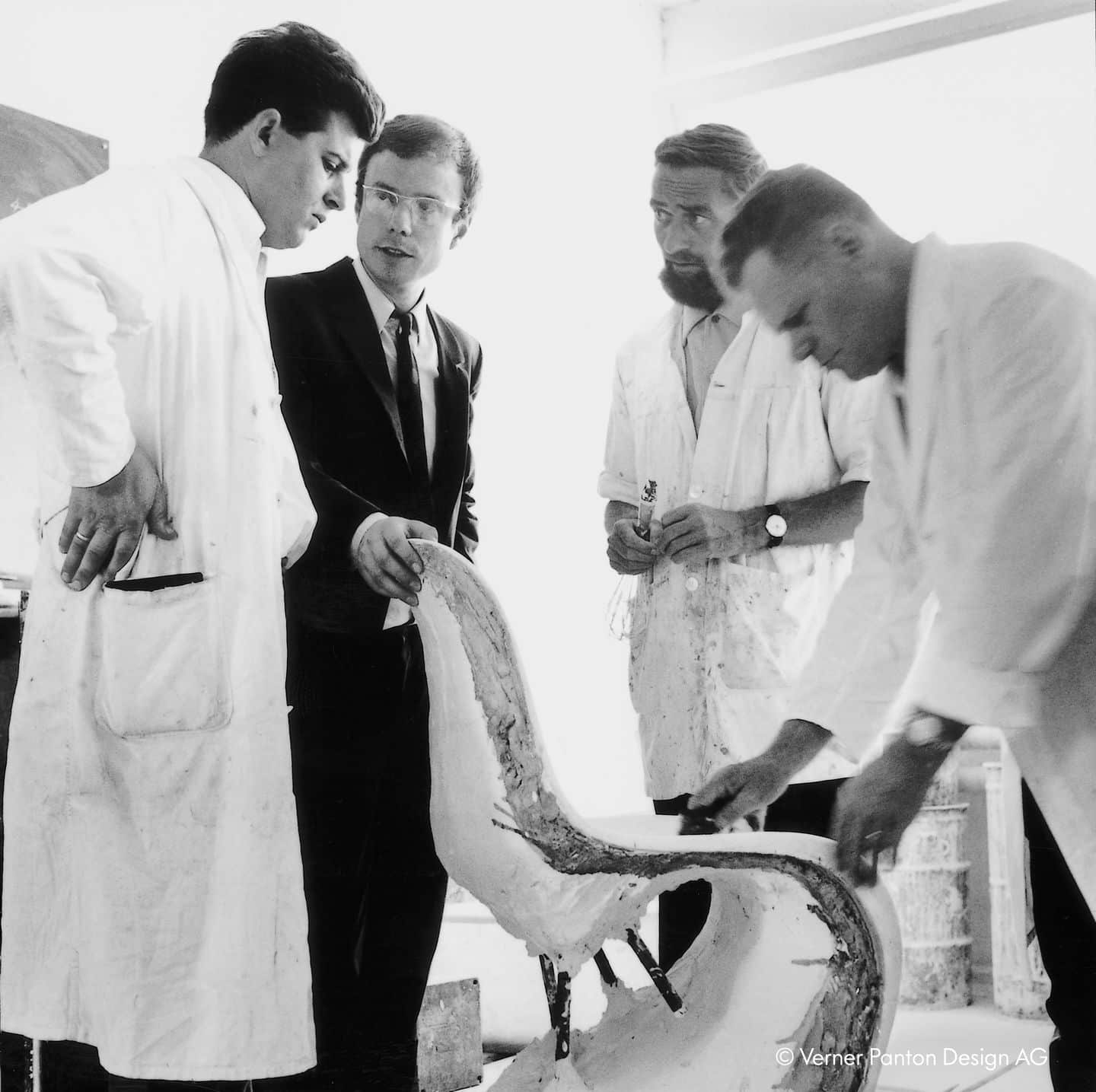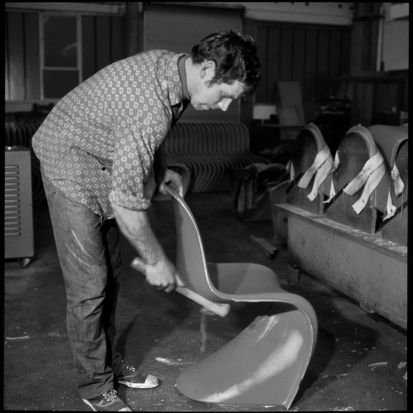 C’est finalement Rolf Fehlbaum, fils du fondateur de Vitra, qui perçoit le potentiel. En 1967, les 100 premiers exemplaires sortent en polyester renforcé de fibre de verre pressé à froid. Exposés à la foire du meuble de Cologne en 1968, la sensation est immédiate. Panton, insatisfait, continue à travailler avec Vitra, avec le producteur de plastique Bayer puis BASF, pour trouver des matériaux mieux adaptés : plus légers, moins coûteux, empilables. La version en polypropylène moulé par injection finit par arriver. Elle est encore produite aujourd’hui.
