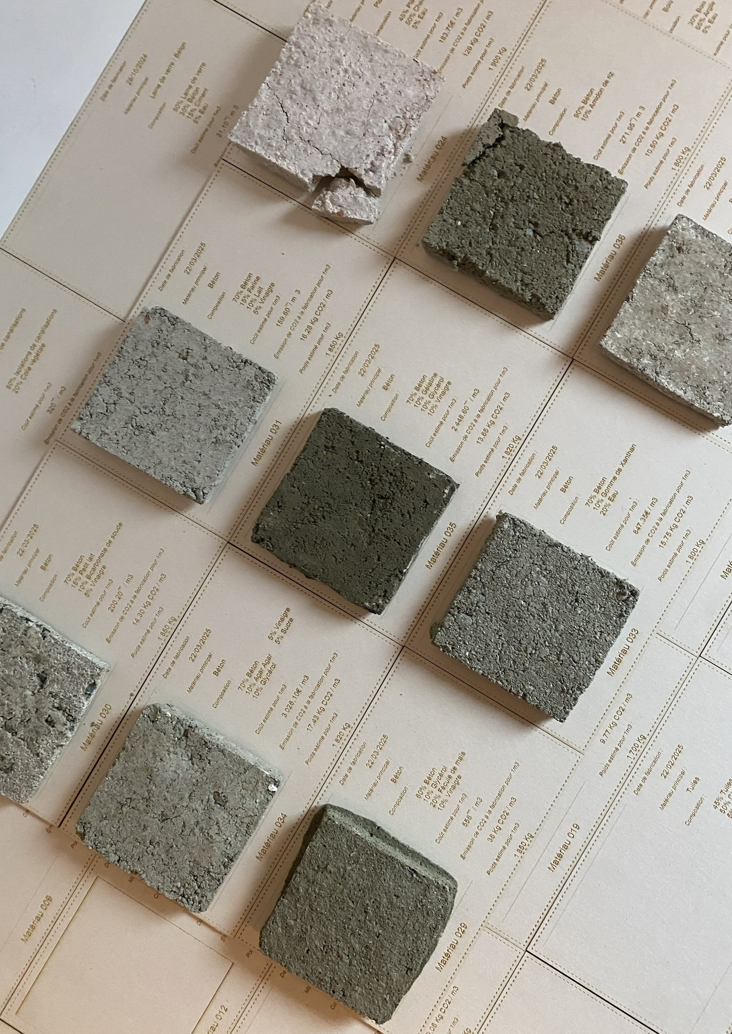 Ce travail repose sur plus de 80 essais de formulation, guidés par une volonté : concevoir un « béton de réemploi » qui ne se contente pas d’être structurel, mais qui soit aussi esthétique, porteur de sens et de mémoire. Un matériau composite dans lequel s’entrelacent béton concassé, plâtre, carrelage, brique et tuile, autant d’éléments collectés, sélectionnés, repensés.