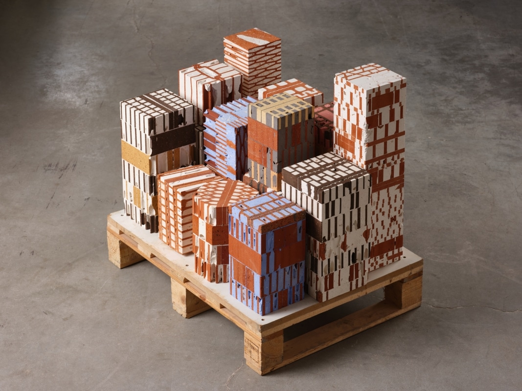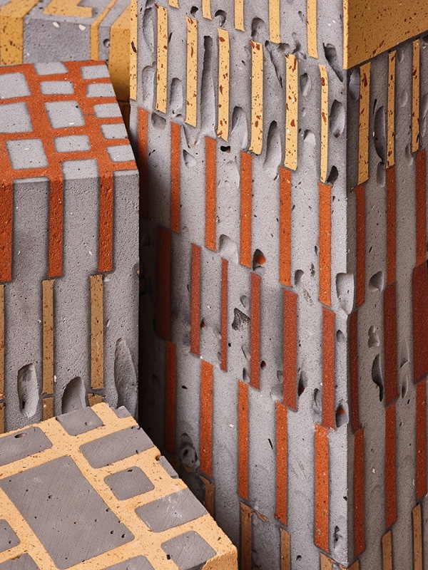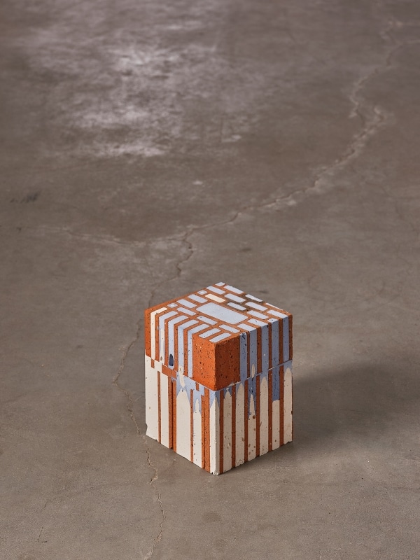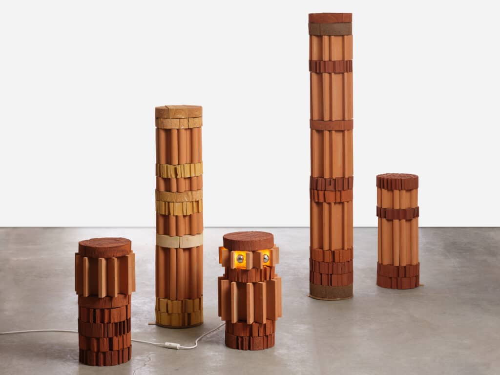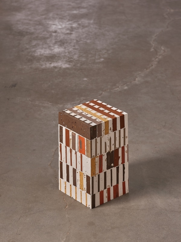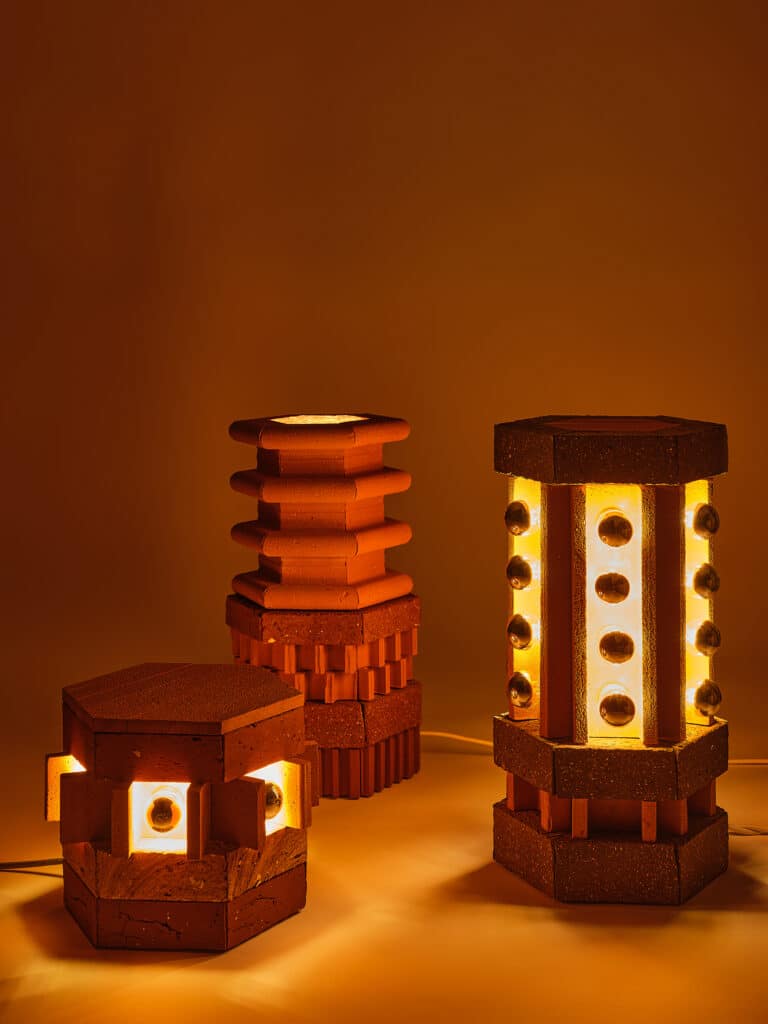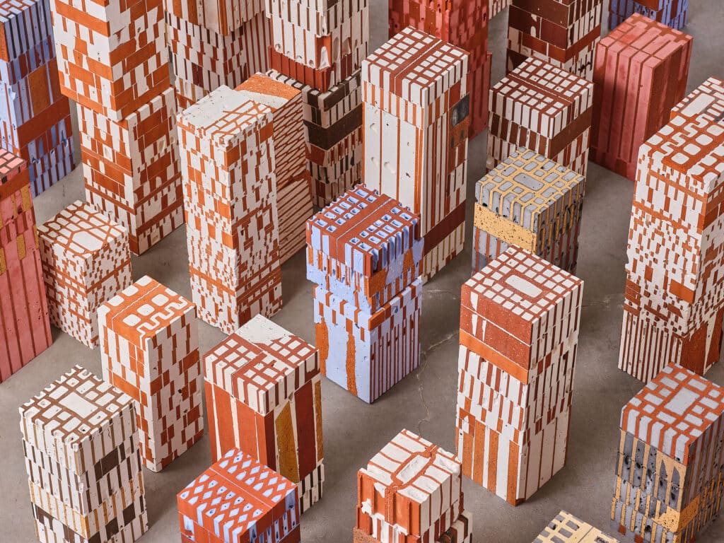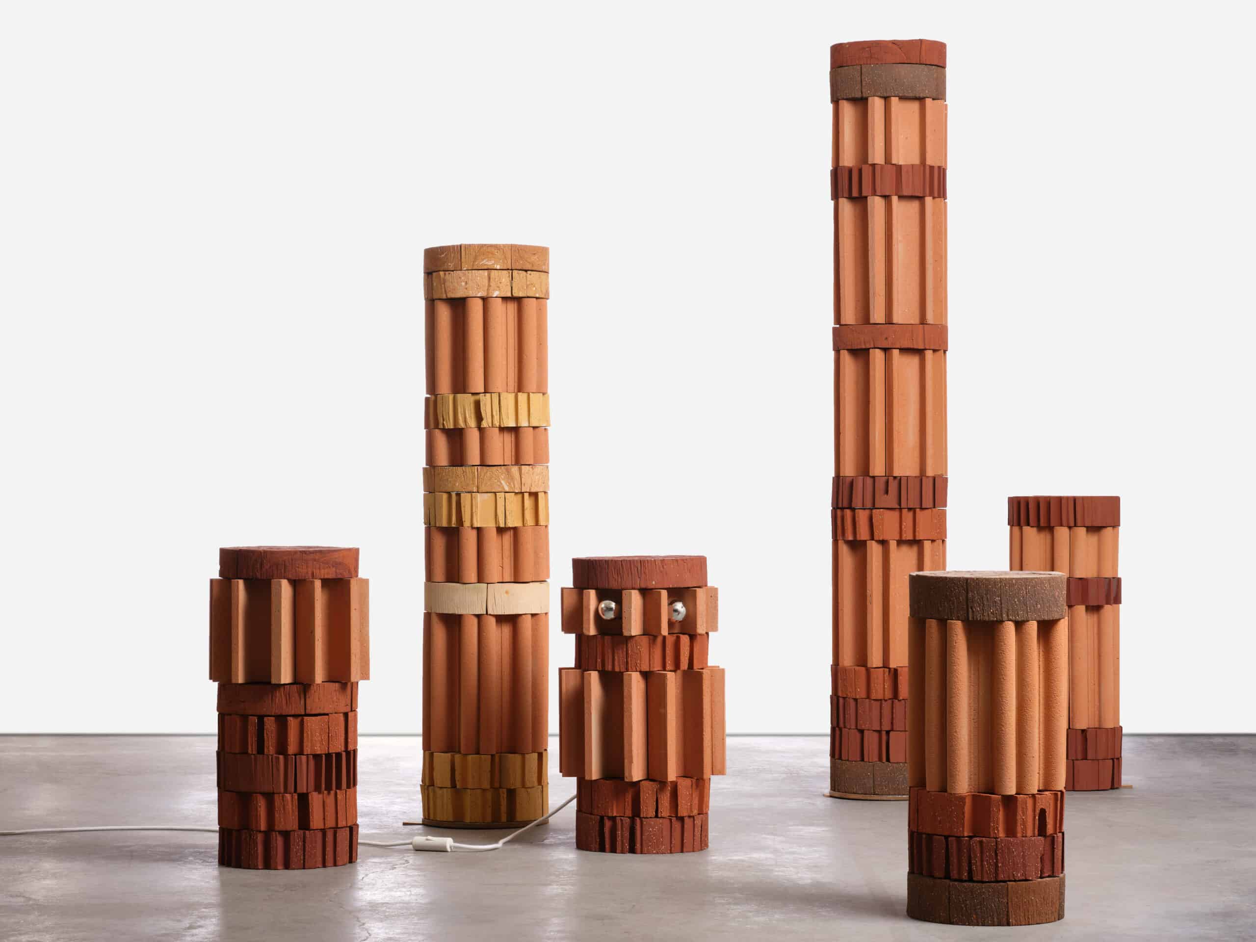 Ces briques deviennent des fragments, colonnes, blocs ou tours, entre sculpture et micro-architecture. Parfois objets nomades, parfois pièces lumineuses, elles dialoguent entre elles par leurs couleurs (rouge, rose, orange, gris) et leurs textures (lisses, rugueuses, tachetées). Le geste du créateur consiste moins à imposer une forme qu’à laisser la matière révéler son potentiel plastique.