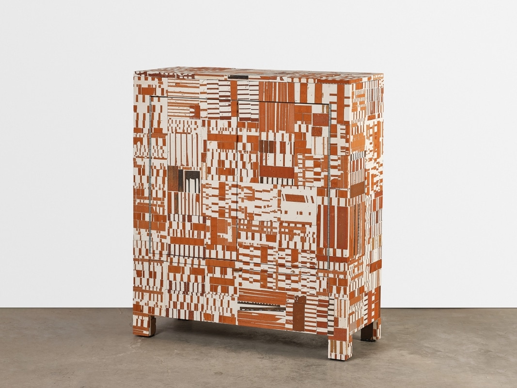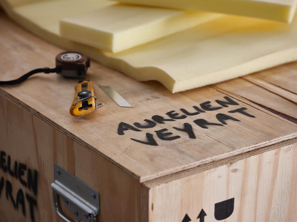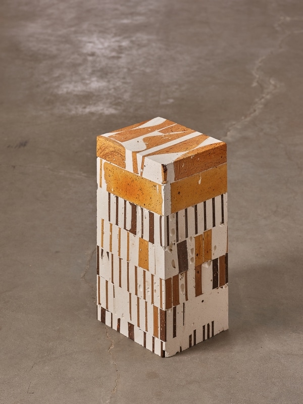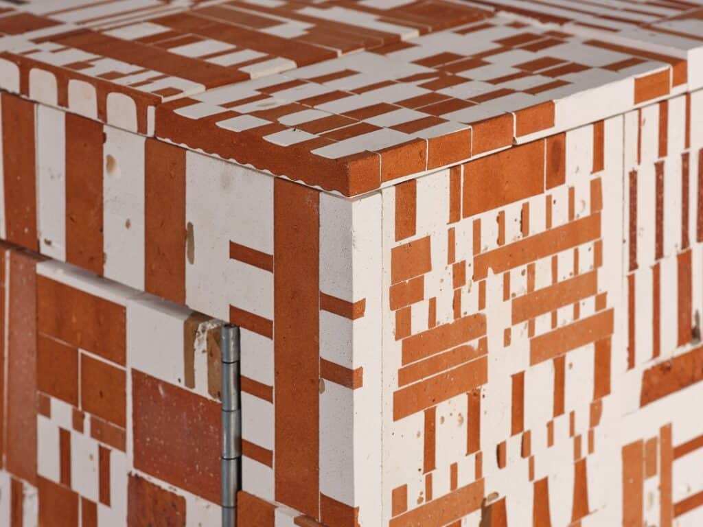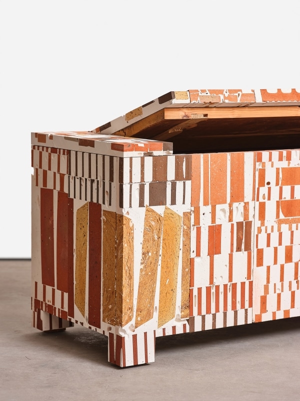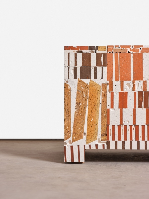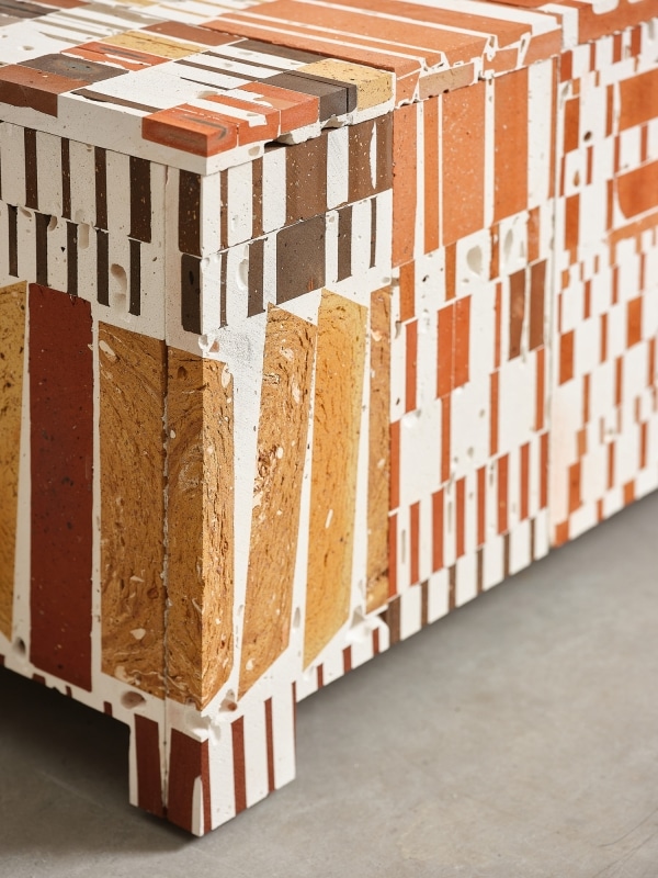 L’approche d’Aurélien Veyrat n’est pas sans rappeler son passé de menuisier. Comme une marqueterie contemporaine, ses assemblages de briques et de fragments évoquent le geste de l’artisan qui joue avec les essences et les veinages. Avec [aglɔmeʀa] furniture, il applique ce principe à des meubles anciens qu’il recouvre d’une « seconde peau » minérale, renouant ainsi avec l’idée d’un design circulaire et patrimonial.