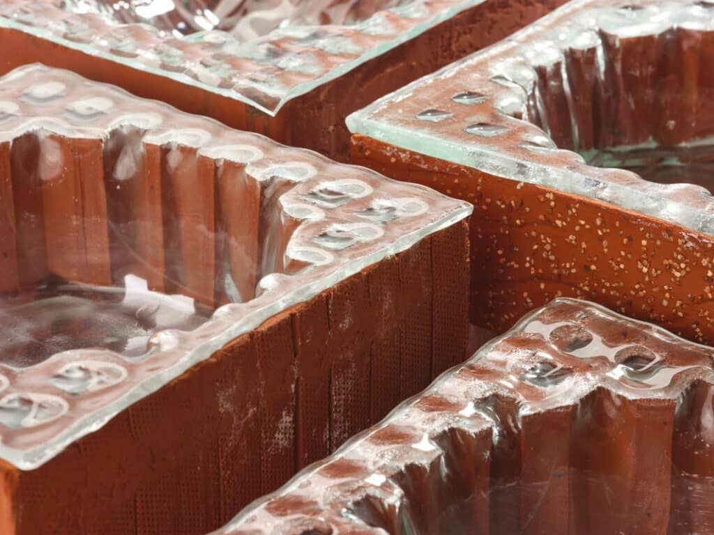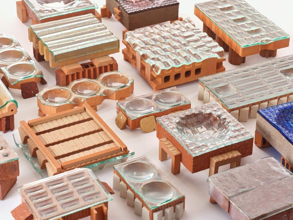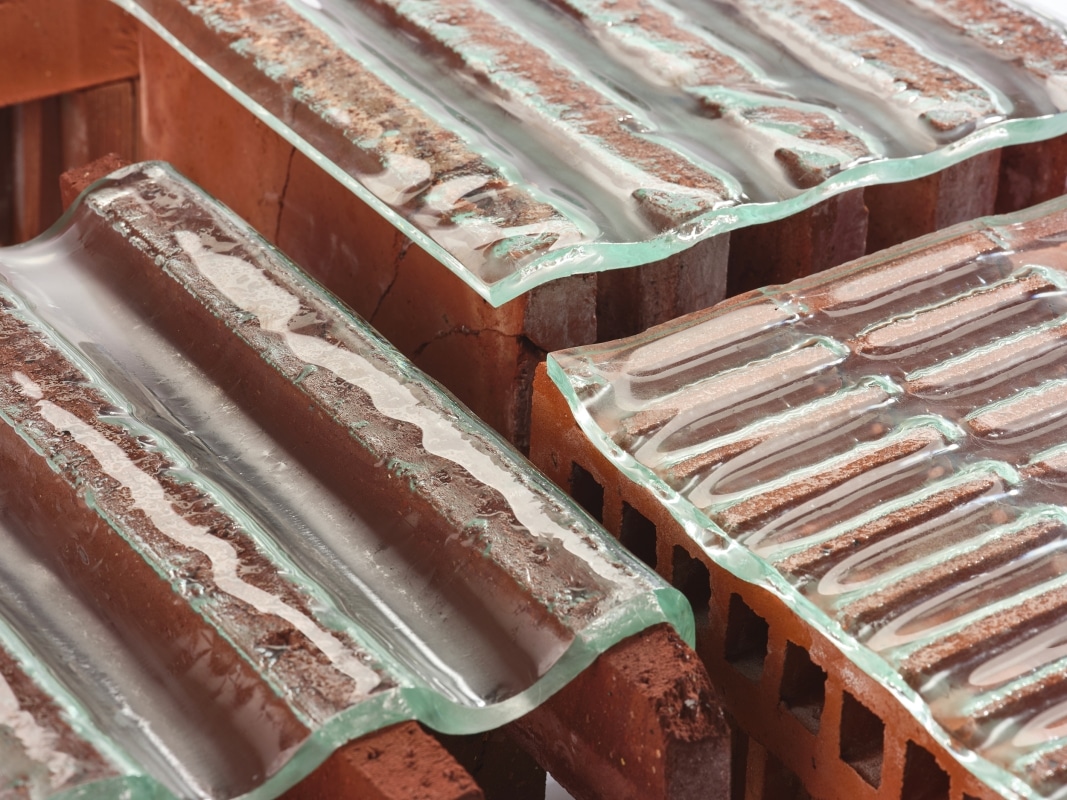 À côté de la brique, Aurélien Veyrat explore aussi le verre. Collecté dans les filières de seconde main, vitres, bouteilles, déchets d’ateliers, il fait fondre dans son four, parfois directement sur les briques. La fusion des deux matériaux donne naissance à des pièces où la transparence, la couleur et la lumière apportent une dimension nouvelle.