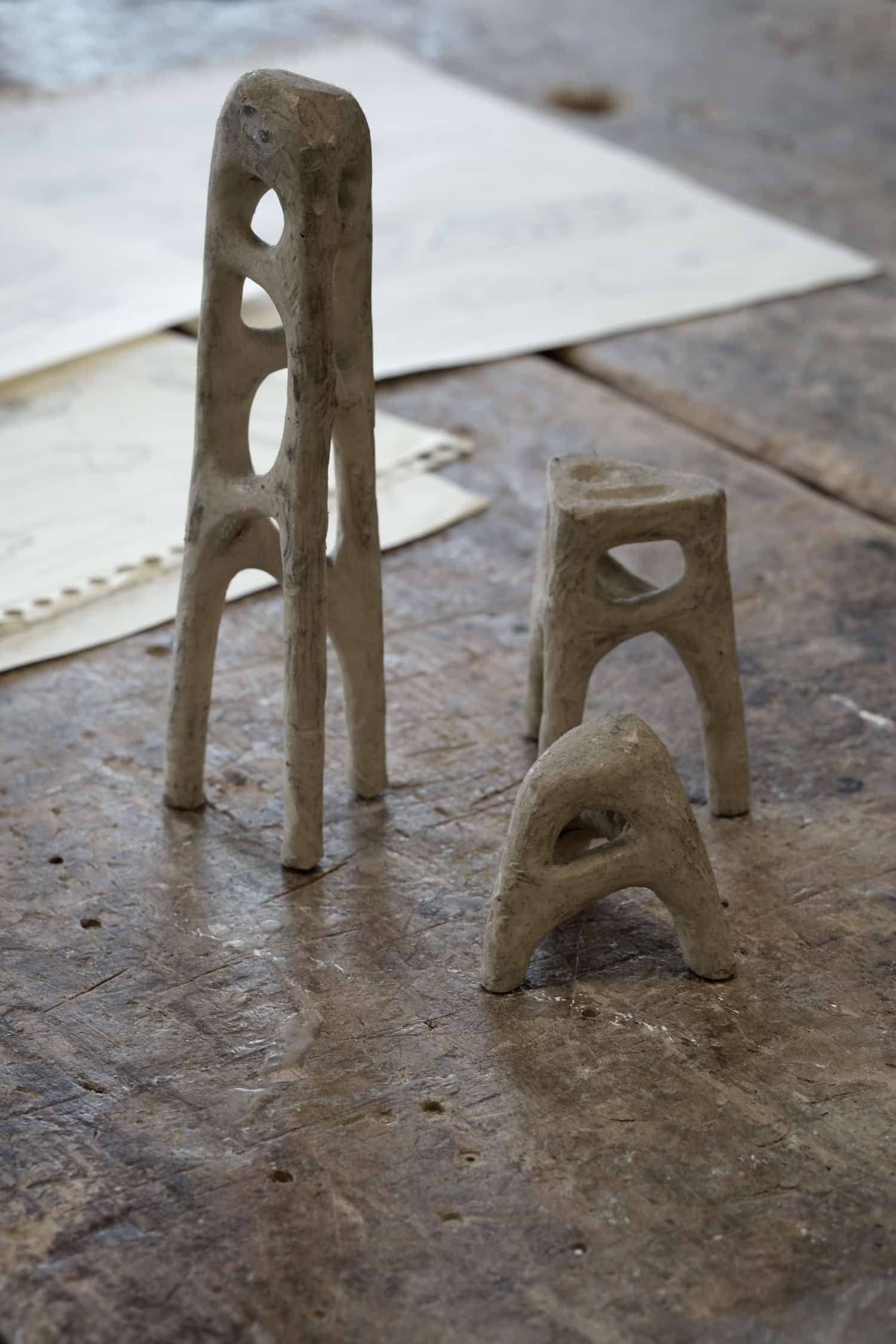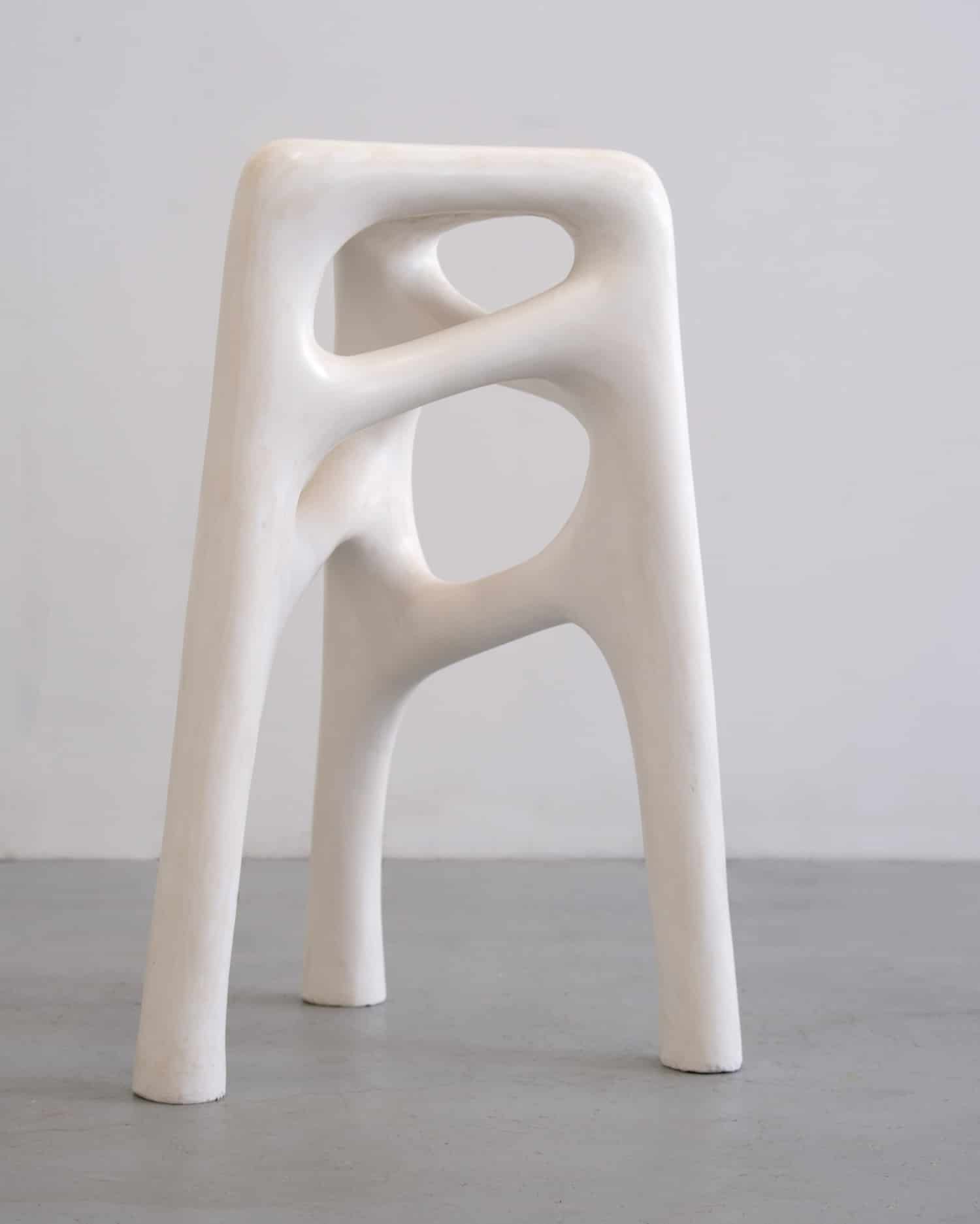 On pense, face à certaines de ces silhouettes au travail minéral exploré par Snarkitecture (voir l’article sur le design minéral de Snarkitecture), ou encore aux collections sculpturales du céramiste ukrainien Serhii Makhno, dont la collection Zemlya mêlait également plâtre et céramique pour des pièces à grande échelle (voir notre article sur le mobilier en céramique de Serhii Makhno). La démarche de Lelouch et Mars s’en distingue pourtant nettement : leur registre est plus épuré, plus silencieux le titre White Noise lui-même joue sur ce paradoxe d’un bruit omniprésent mais imperceptible, d’une tension formelle que l’on ressent sans pouvoir l’identifier précisément.