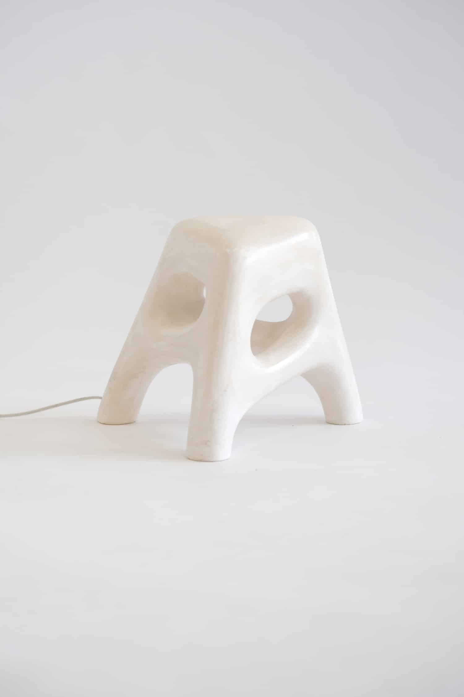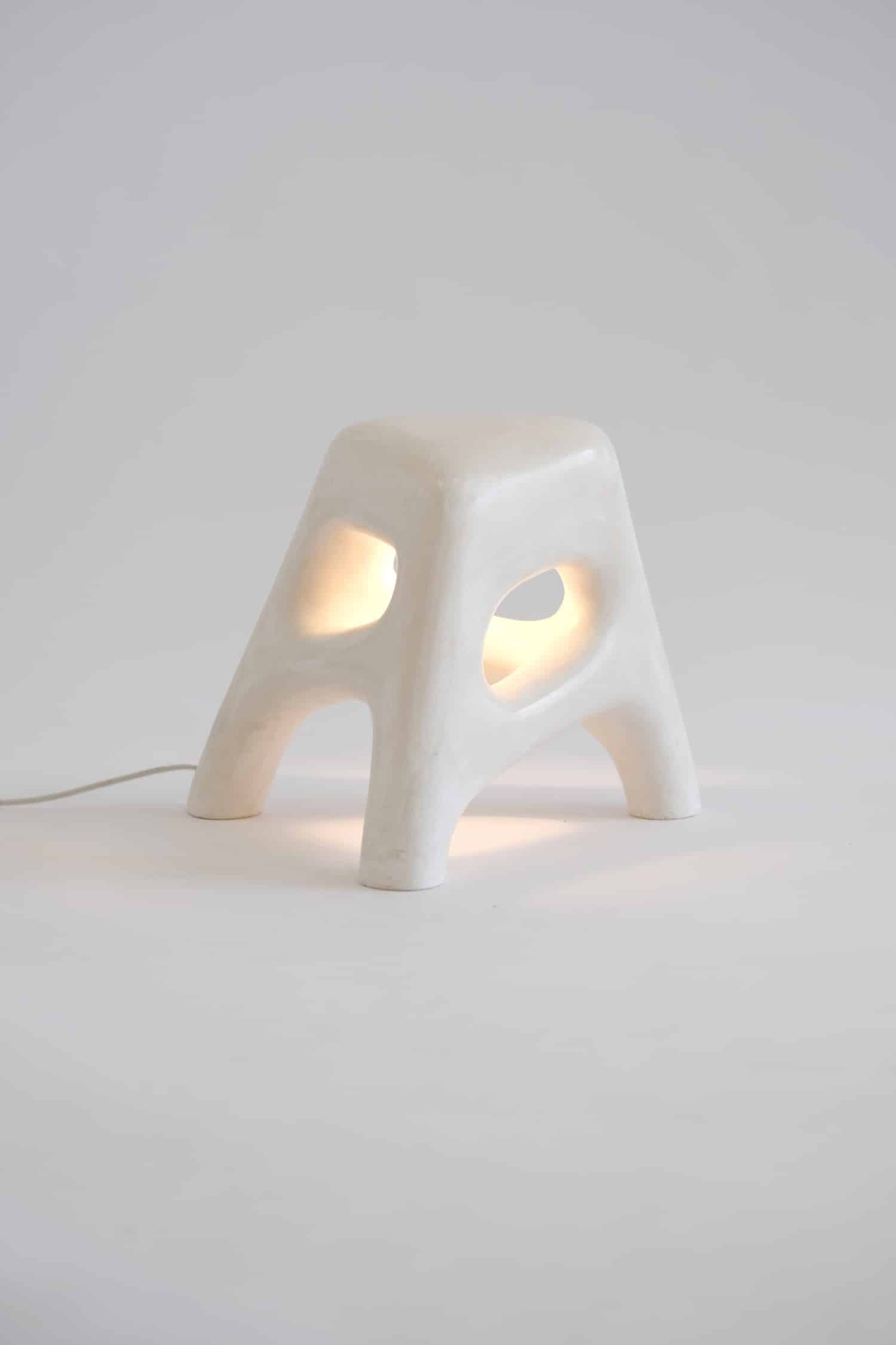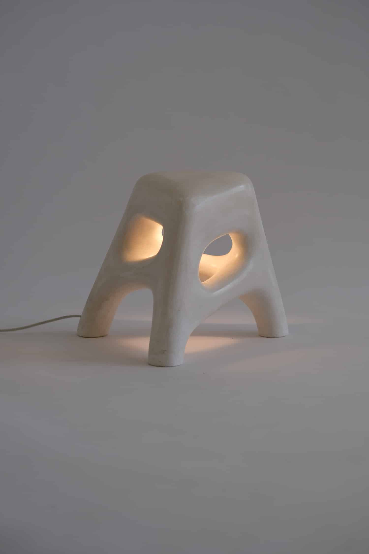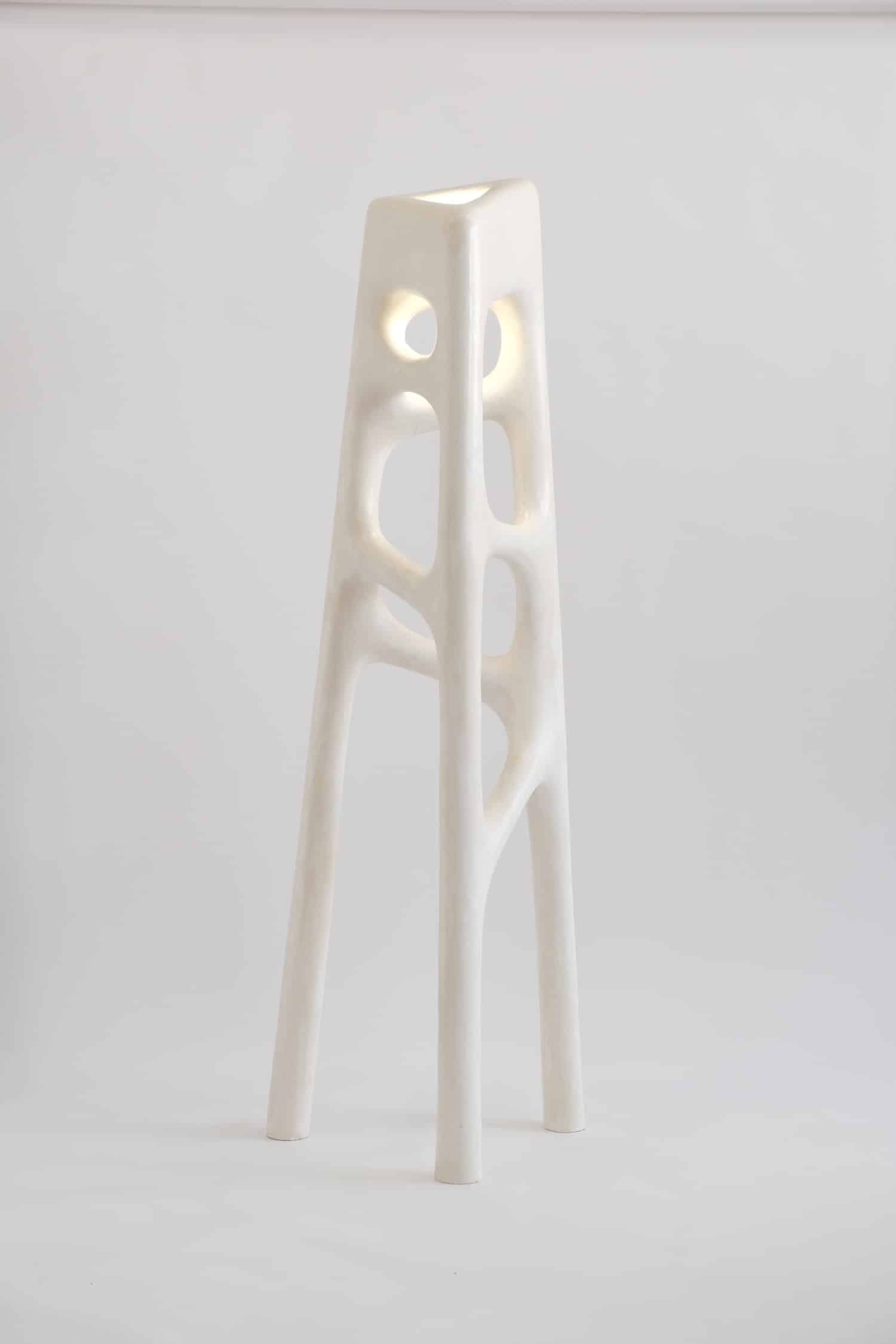 Thomas Lelouch s’est formé au travail du plâtre et du bronze lors de différentes formations en artisanat d’art. Cette maîtrise technique n’est pas décorative : elle conditionne les possibilités formelles de la collection, autorisant des courbes serrées, des porte-à-faux, des cavités lumineuses que d’autres matériaux ne permettraient pas aussi facilement. Sur certaines pièces, la structure est renforcée par une ossature en aluminium ou en acier, invisible mais essentielle pour assurer la tenue des pièces les plus élancées — comme le lampadaire White Noise, dont la silhouette évoque une colonne vertébrale pétrifiée. Le lustre, lui, intègre en plus du cristal, dont les reflets viennent animer la surface blanche autrement figée.