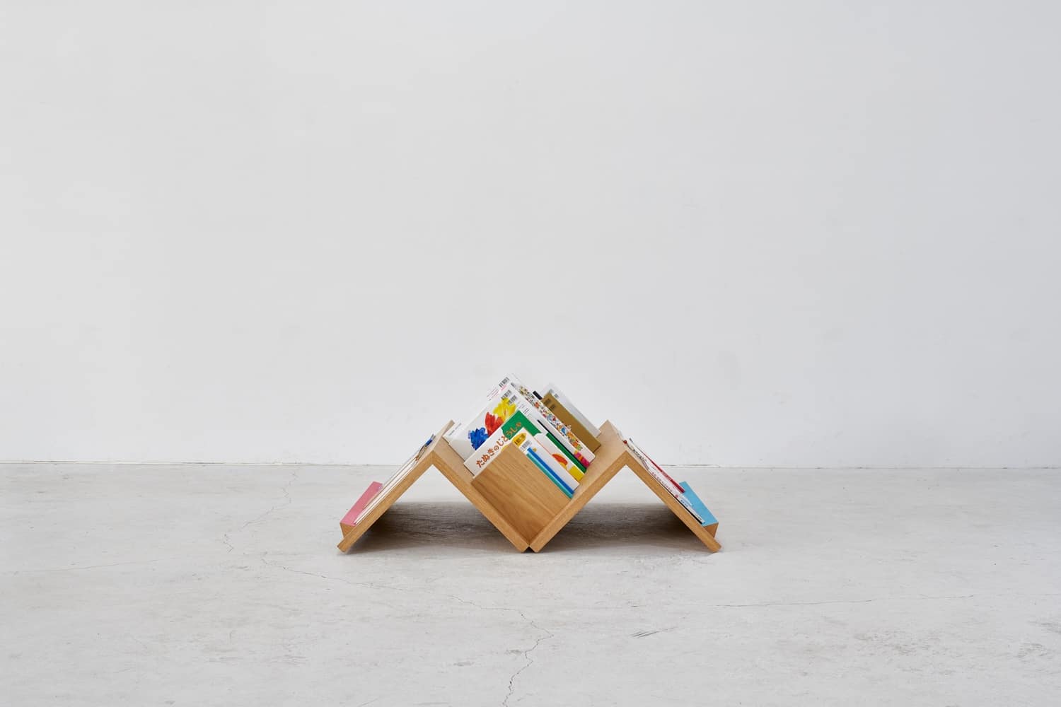 Tsuranari abandonne la verticalité classique du rayonnage. Le meuble est composé de modules en forme de montagne, assemblés les uns à côté des autres. Les versants inclinés deviennent la surface d’exposition. Sur les portions où deux modules se rejoignent, les ouvrages sont rangés en épi, de profil, comme dans une étagère traditionnelle. Sur les pans libres, c’est la couverture qui se donne à voir, face au lecteur. L’ensemble ressemble davantage à un petit relief de papier qu’à un meuble de salon, la suite des pentes forme une ligne d’horizon continue.