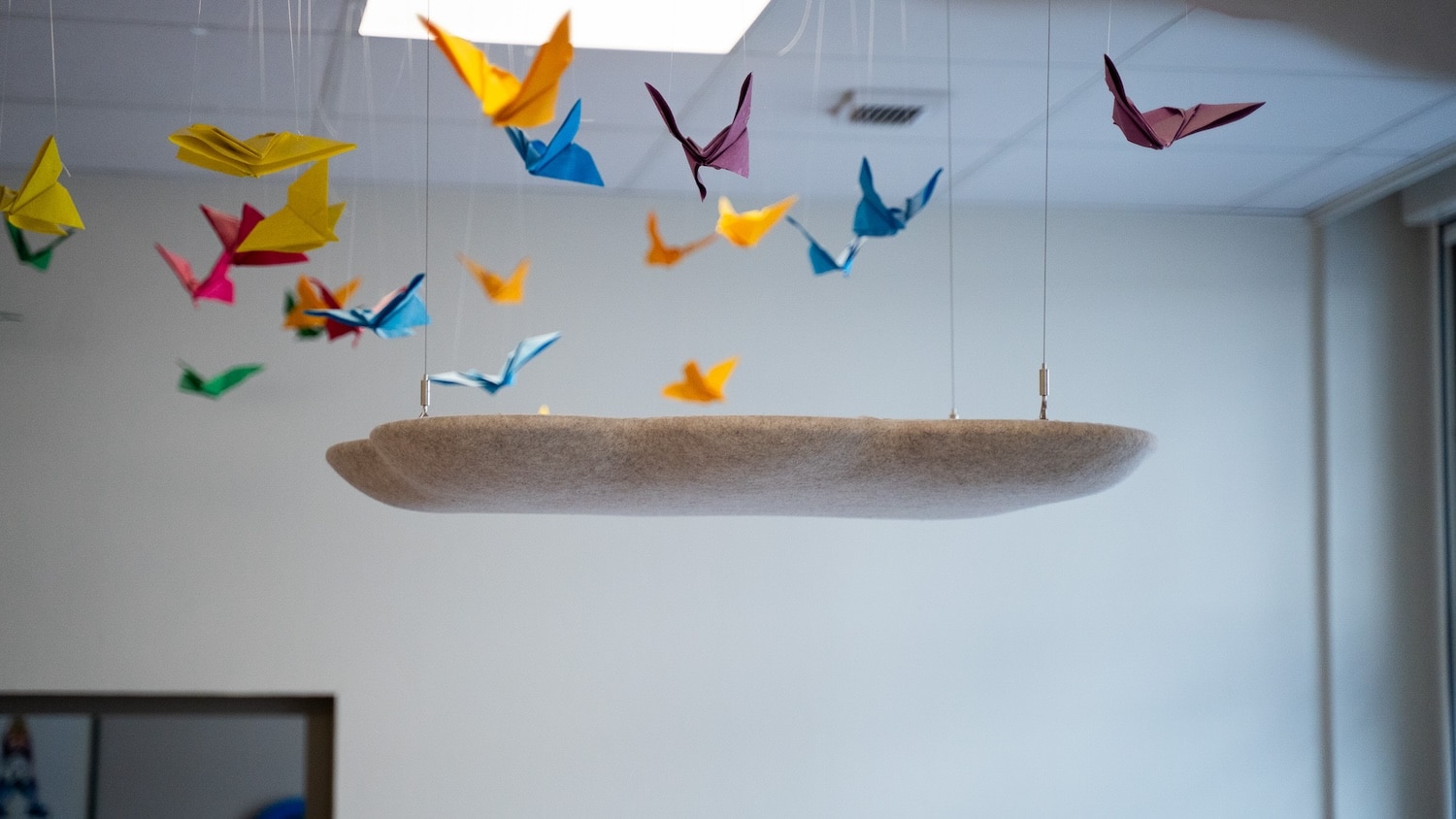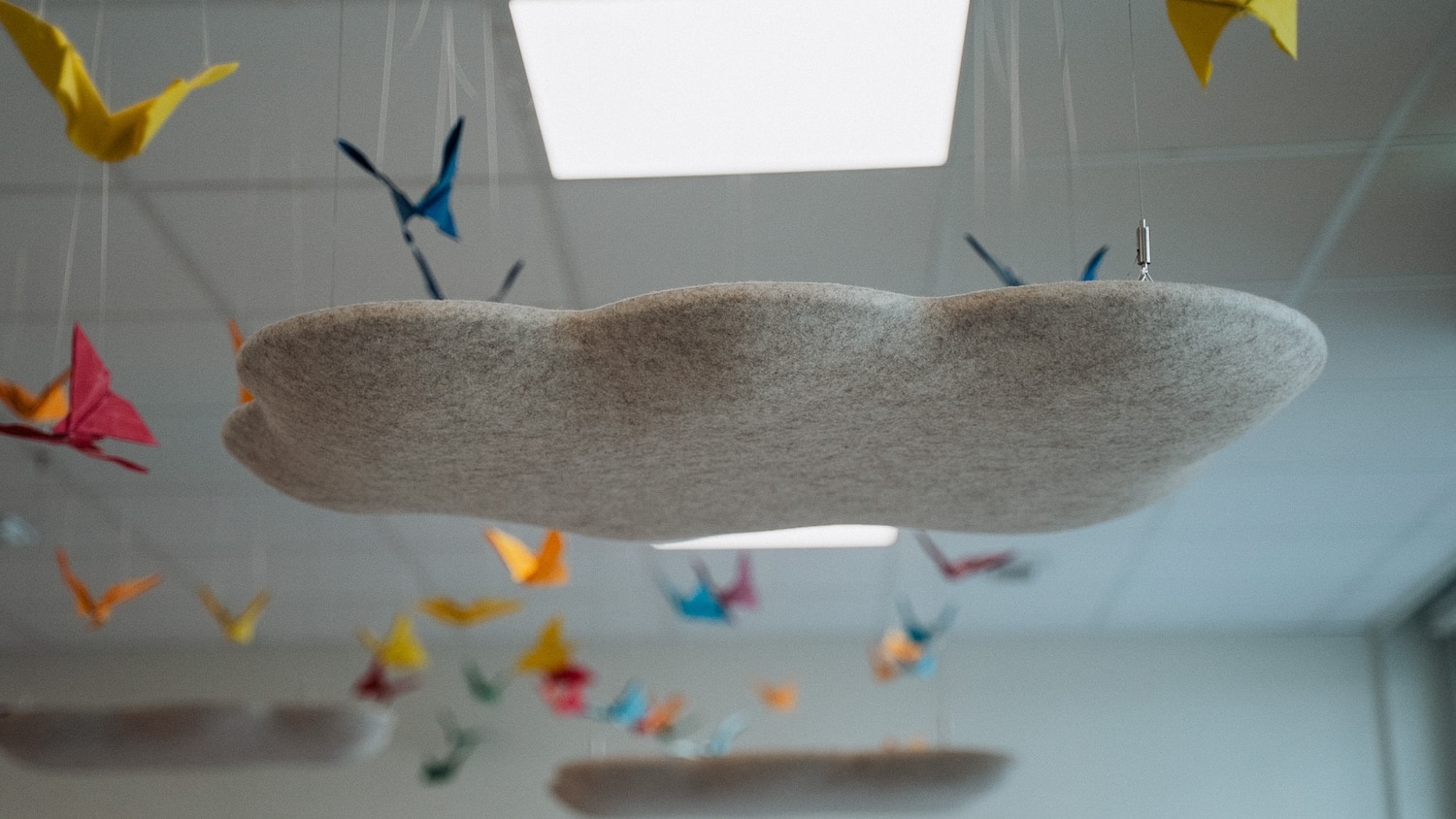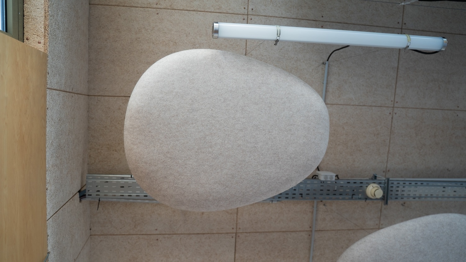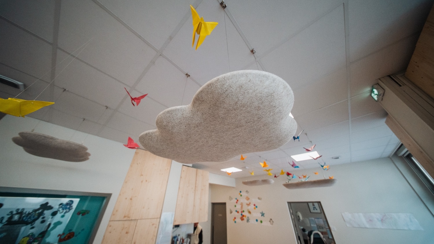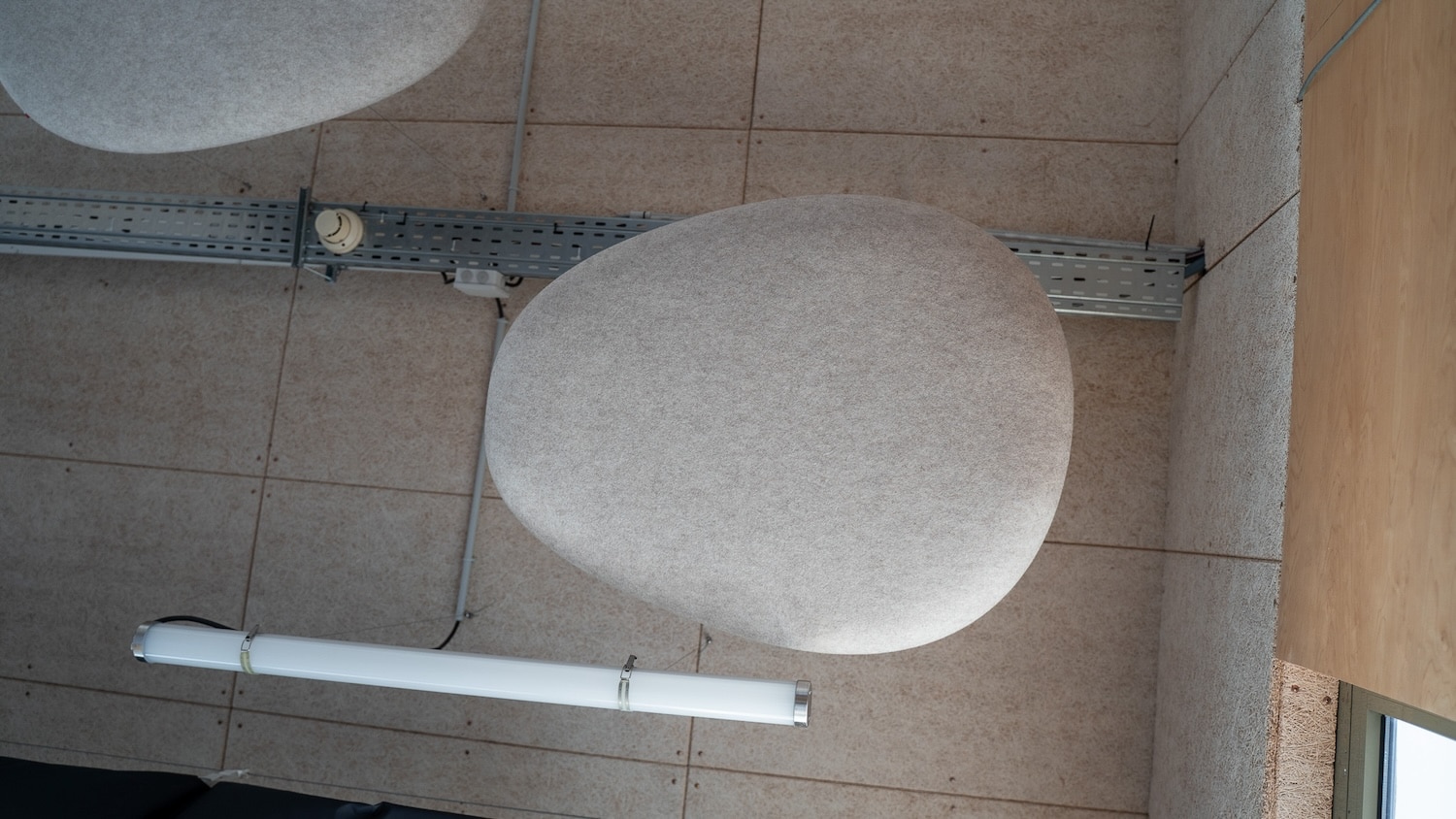 Les premières installations le montrent : des galets suspendus dans un café du 7e arrondissement de Lyon, des nuages dans une crèche du 2e, des galets muraux dans des espaces de coworking. Les formes rondes et biomorphiques s’intègrent sans effort dans des environnements contemporains. Et si l’on veut aller plus loin, Moumoute propose aussi des réalisations sur mesure : ovales, rectangles, boules acoustiques, les formes peuvent être adaptées à chaque projet.