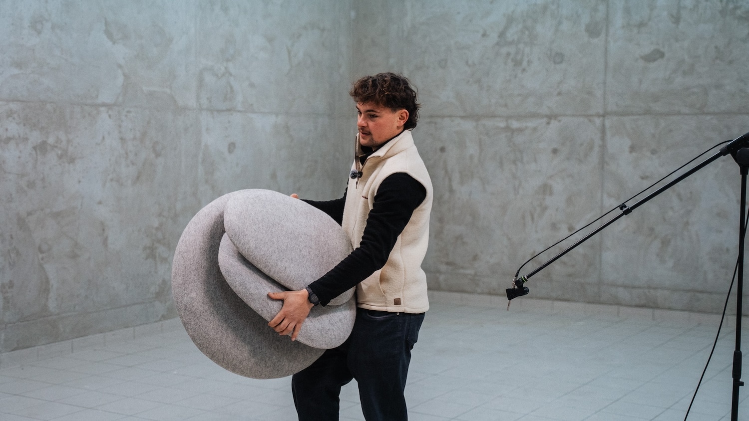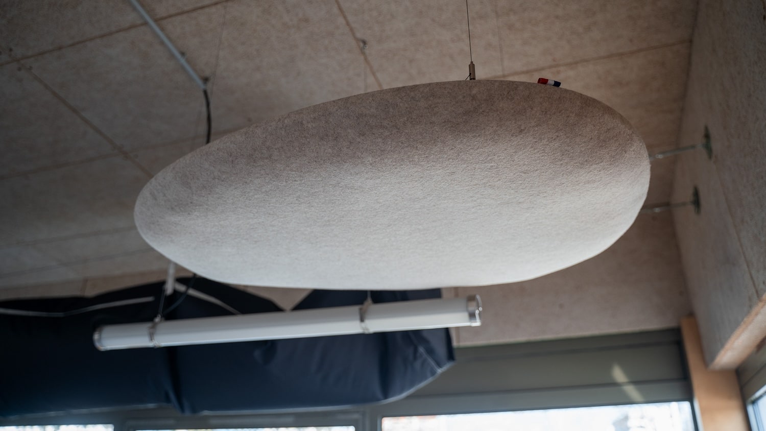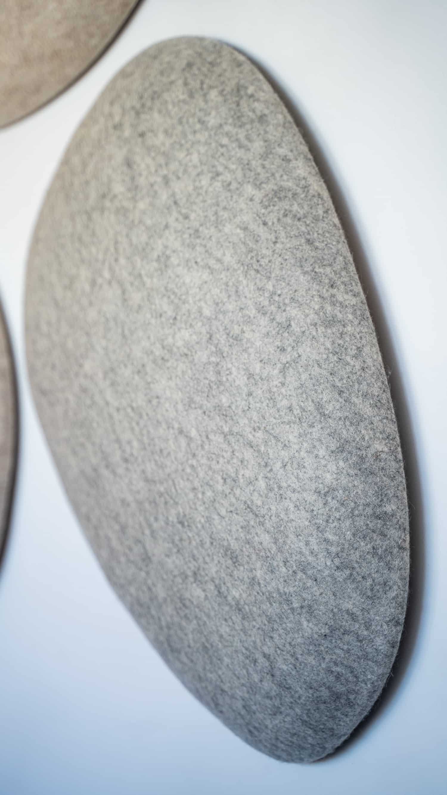 Le résultat prend la forme de trois produits : Le Galet, Le Disque et Le Nuage. Trois objets aux silhouettes organiques, inspirées de formes naturelles, qui s’installent au mur ou au plafond pour réduire la réverbération sonore. L’idée n’est pas nouvelle sur le fond, mais elle l’est clairement sur le matériau et sur la démarche.