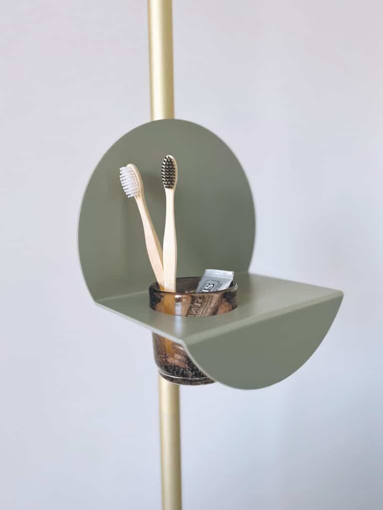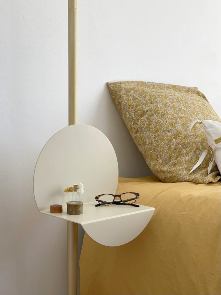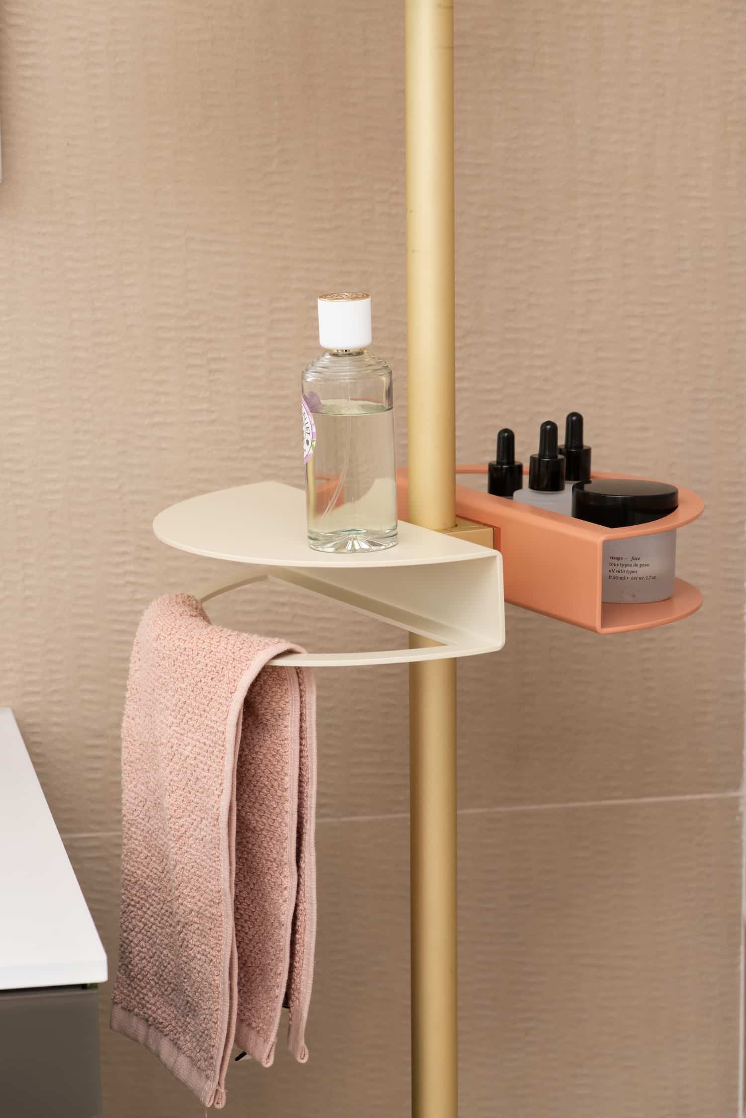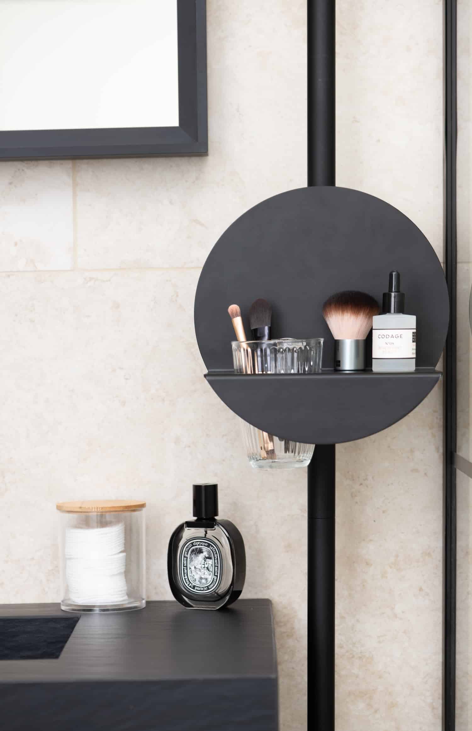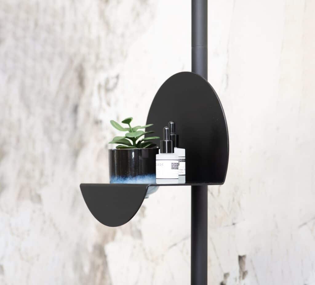 Ici le bloc, élément de fixation coulissant autour de la tige, permet d’ajouter ou déplacer des modules (étagères, miroirs, patères, consoles) sans détériorer les murs et sans talents ou expertises de bricoleurs.