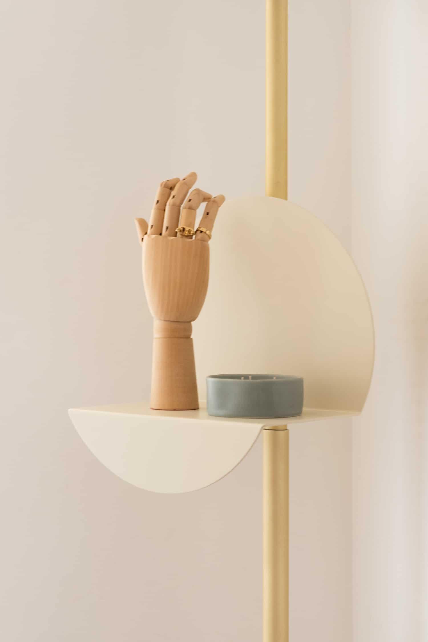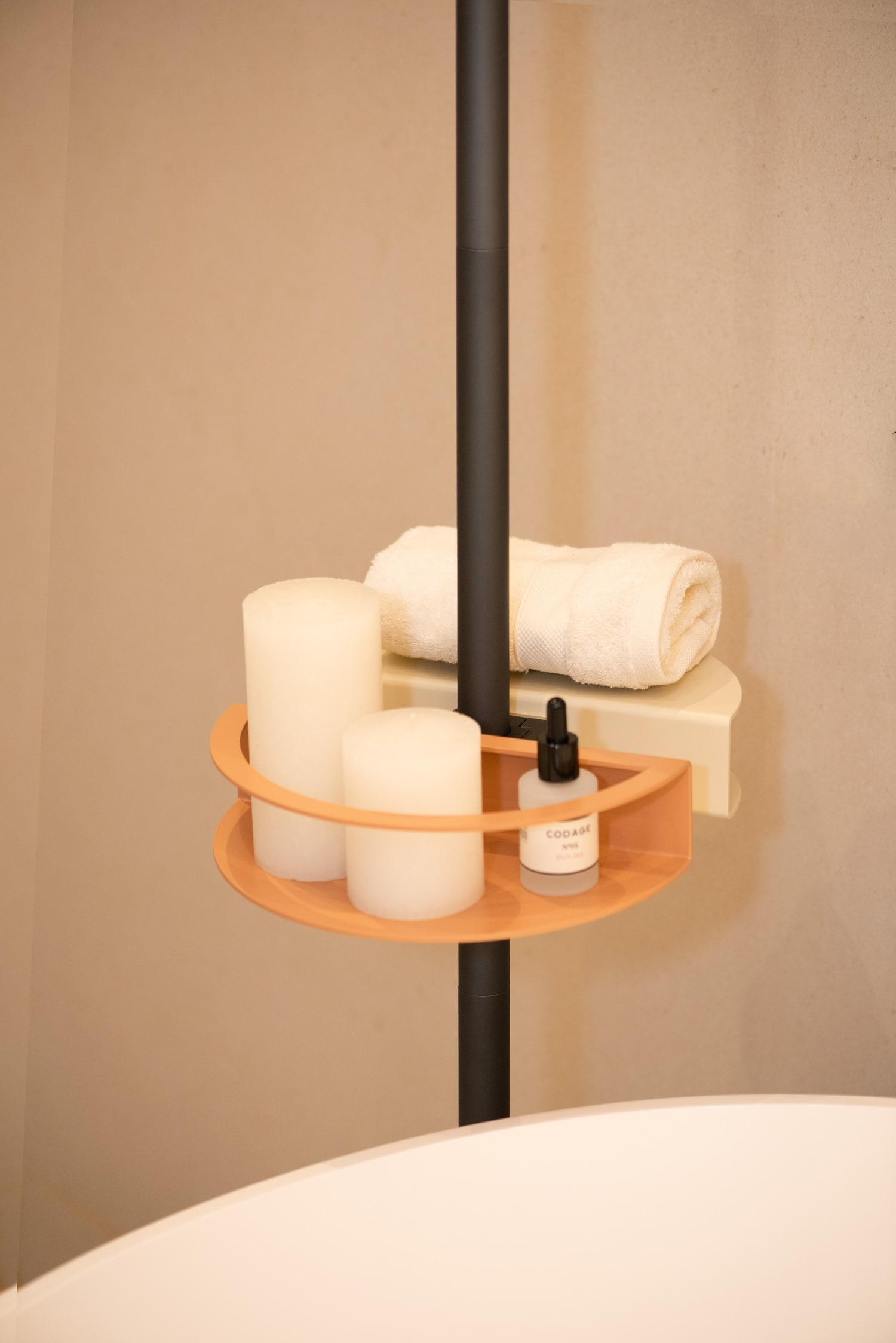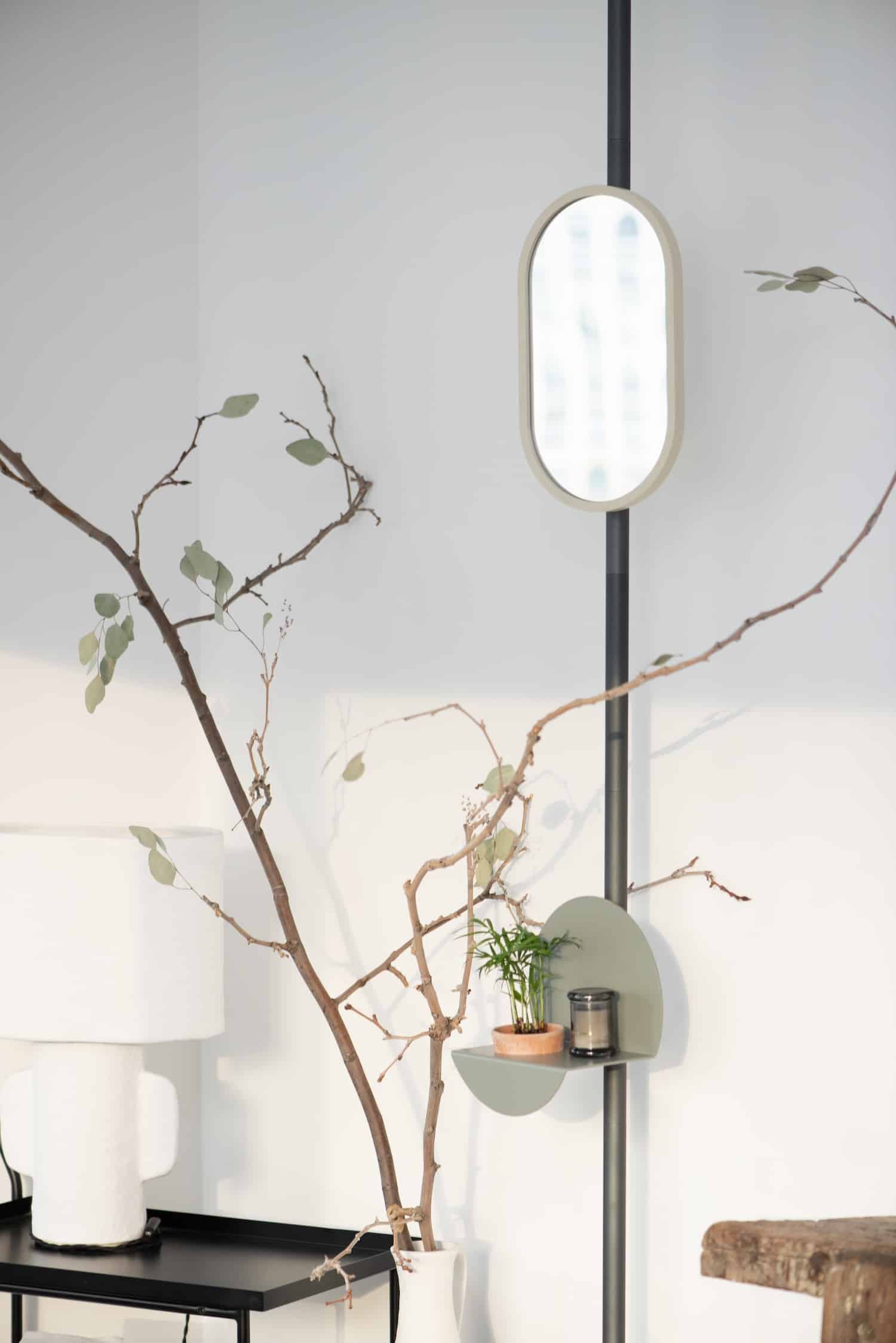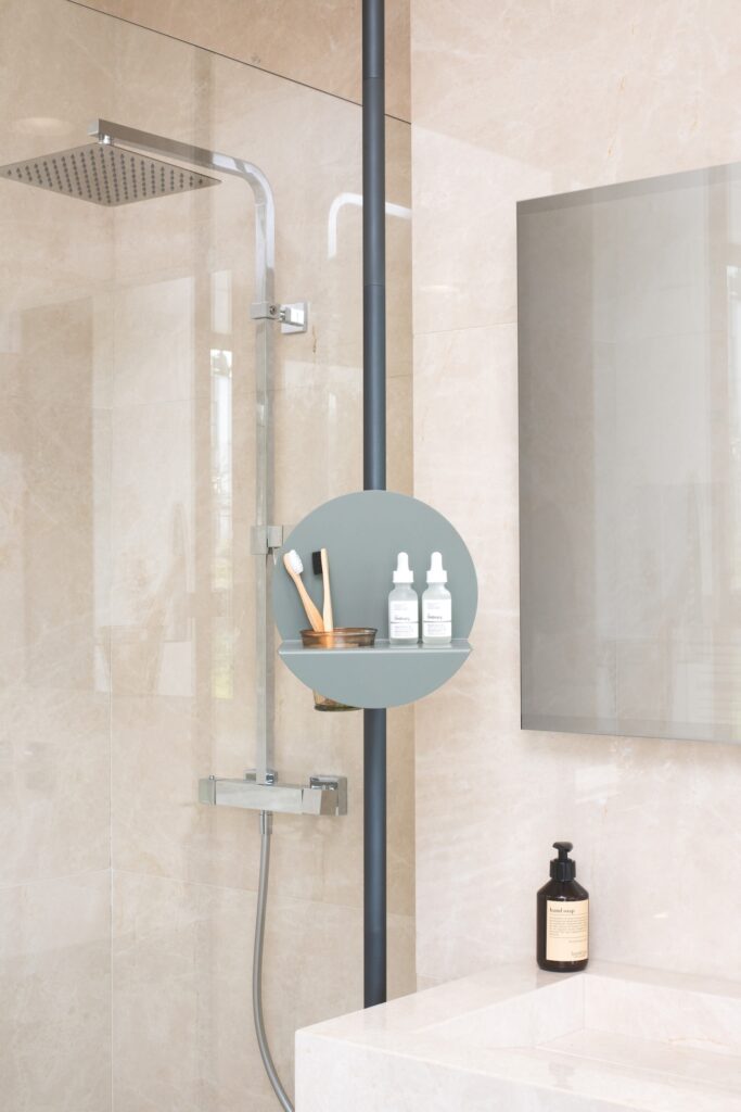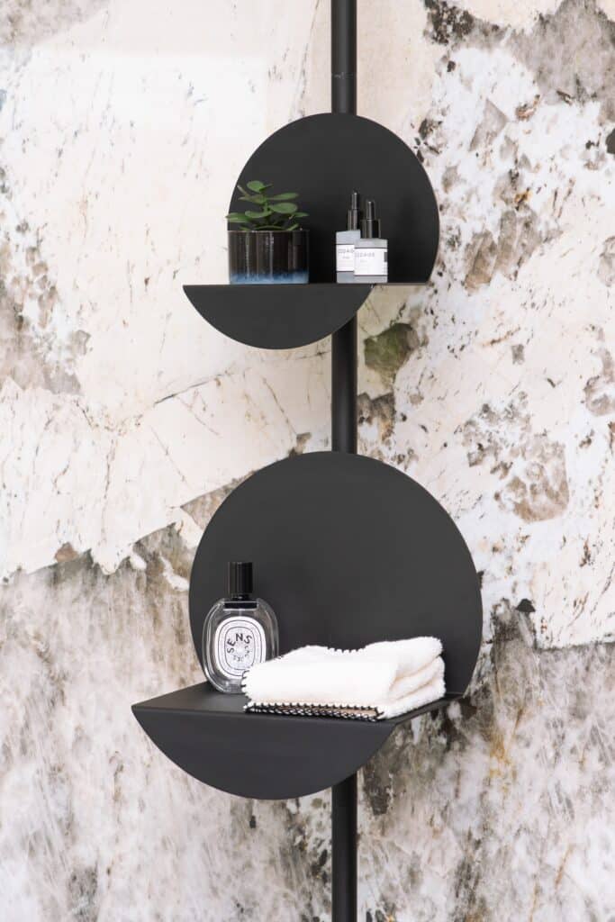 Ici le bloc, élément de fixation coulissant autour de la tige, permet d’ajouter ou déplacer des modules (étagères, miroirs, patères, consoles) sans détériorer les murs et sans talents ou expertises de bricoleurs.