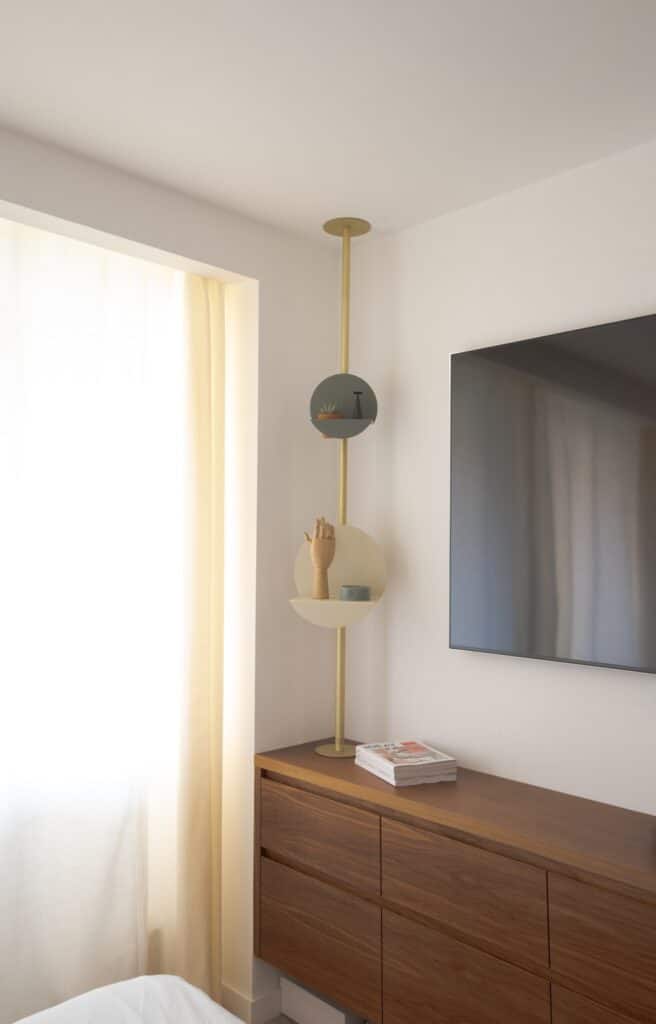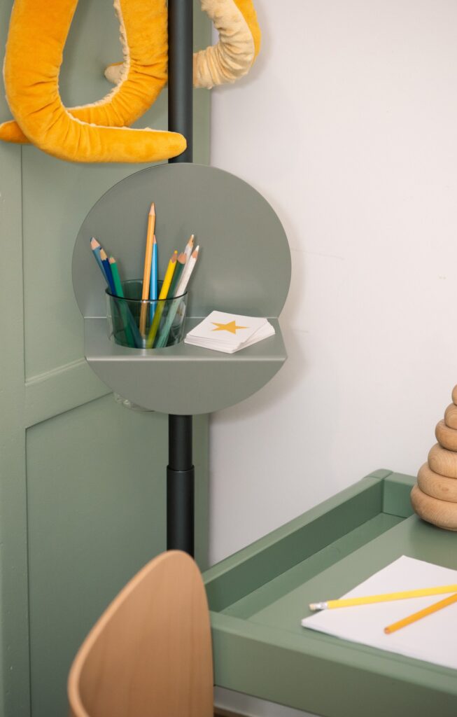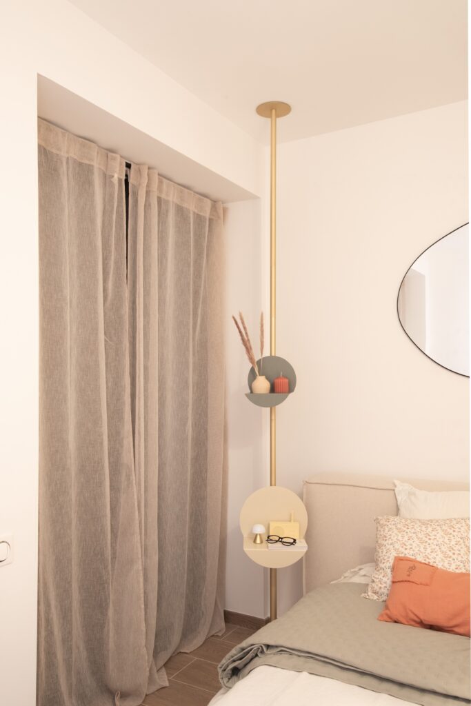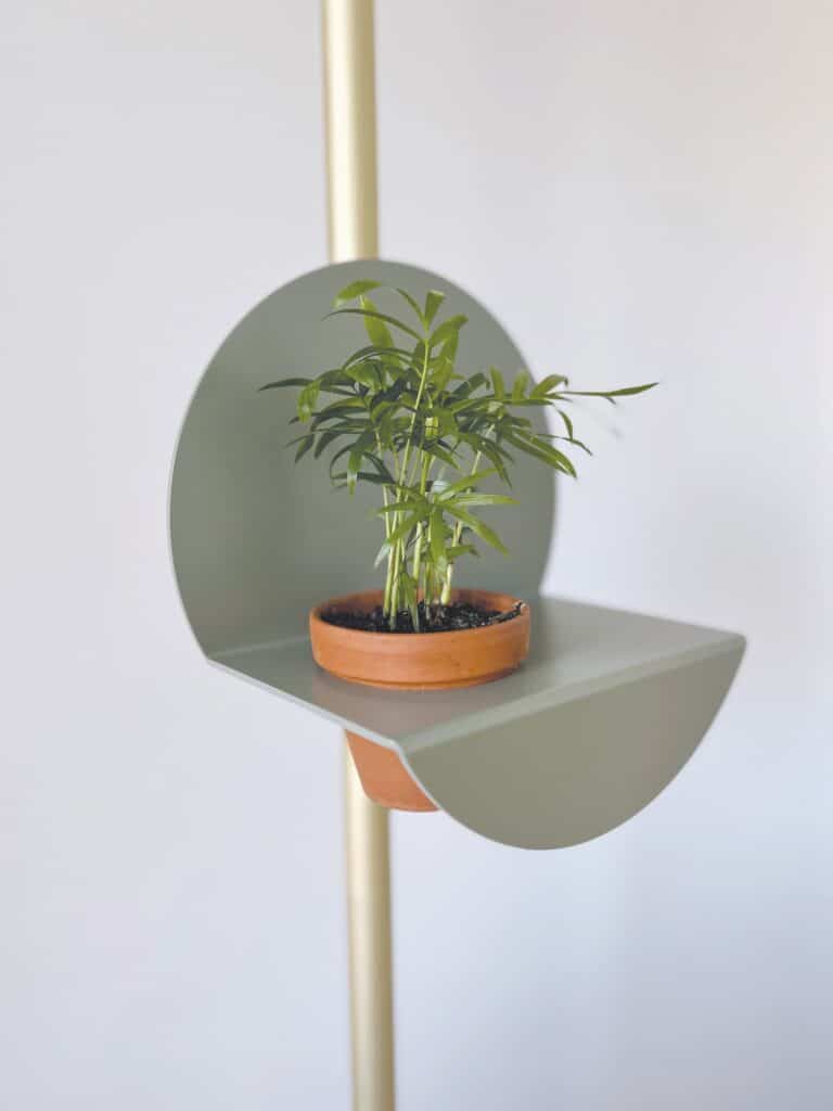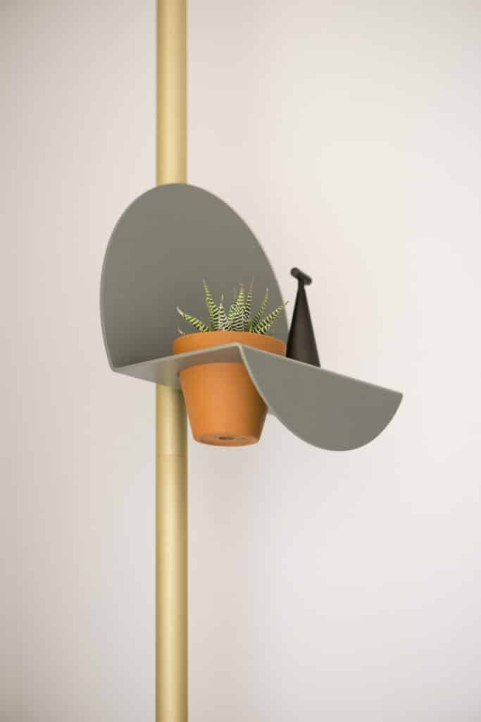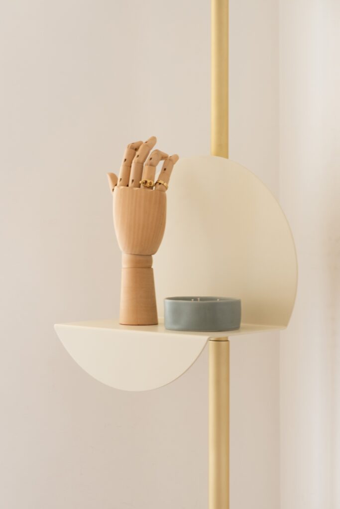 Ici le bloc, élément de fixation coulissant autour de la tige, permet d’ajouter ou déplacer des modules (étagères, miroirs, patères, consoles) sans détériorer les murs et sans talents ou expertises de bricoleurs.