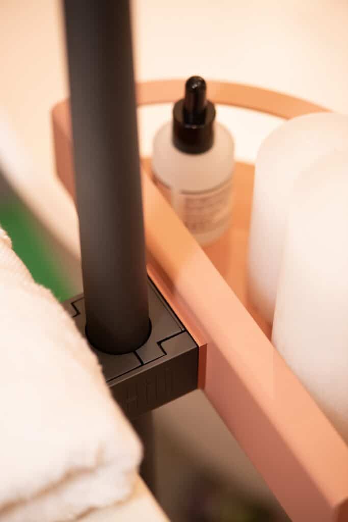 HILO, de par son système sans perçage, sa modularité facile et son esthétique épurée, répond à un besoin pragmatique en particulier dans les espaces contraints ou chez les locataires tout en promouvant un signe formel fort. C’est ce croisement entre usage et positionnement avec un vrai plus : le système de fixage breveté !