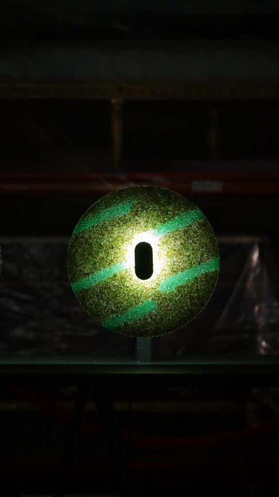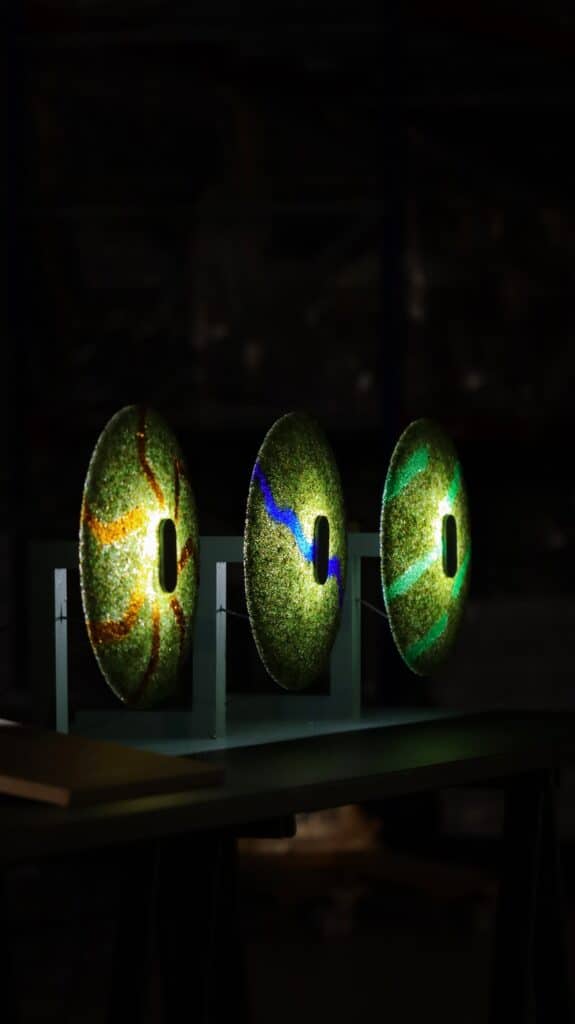 Les qualités du matériau ténacité, variation naturelle de teinte, interaction singulière avec la lumière en font une base d’expression intéressante pour des objets lumineux, renforçant l’idée qu’un déchet peut devenir une ressource technique et poétique.