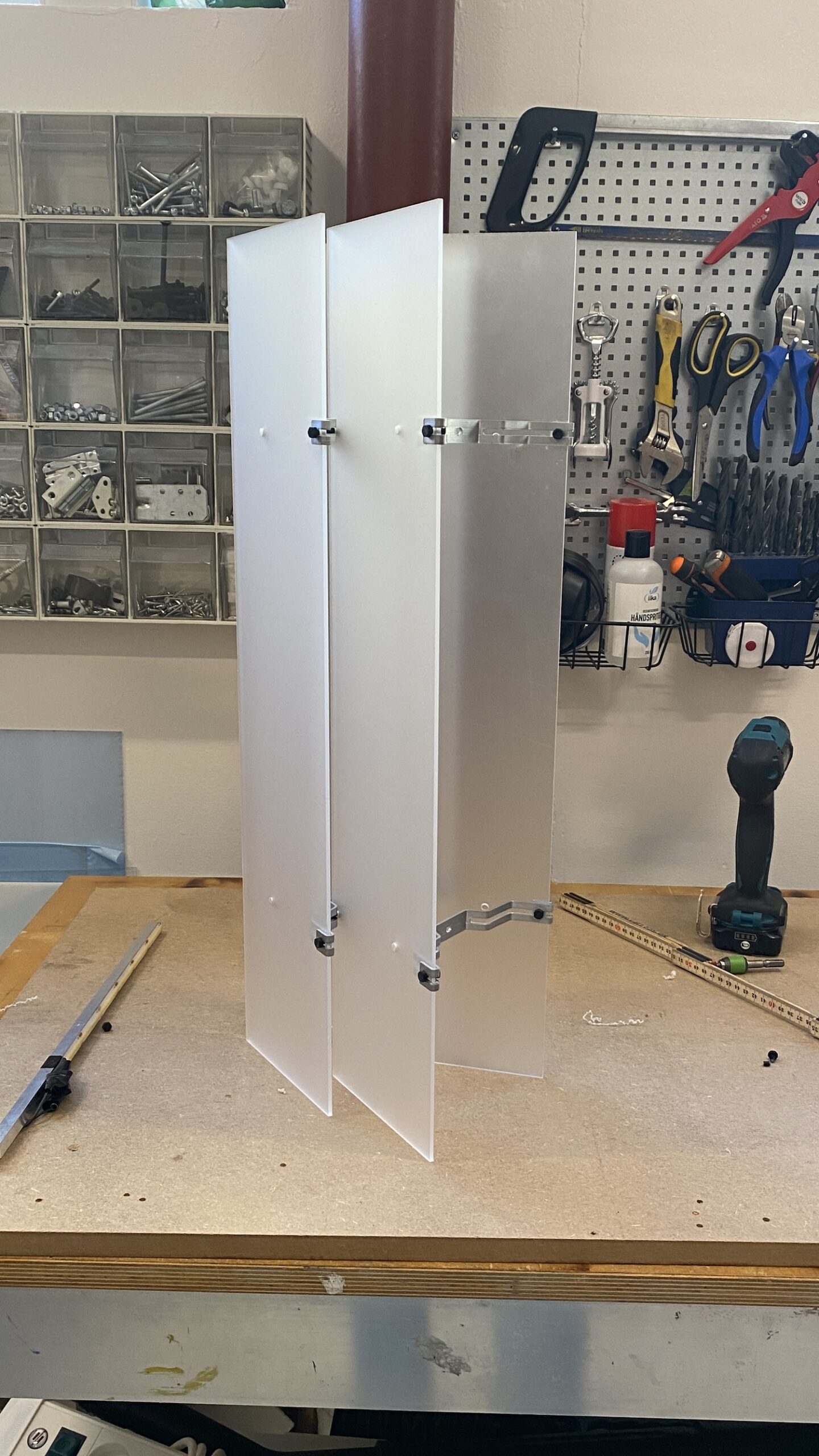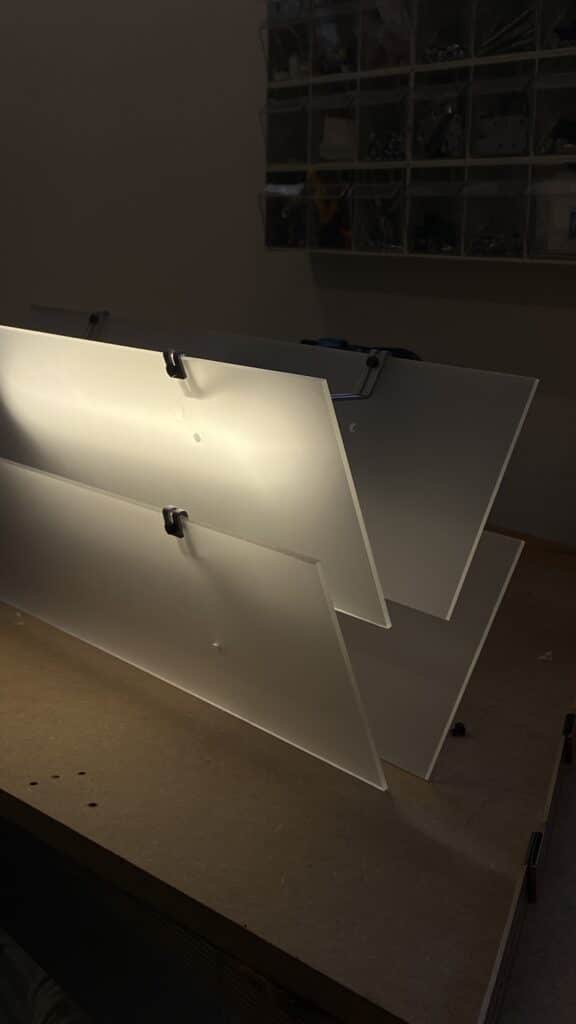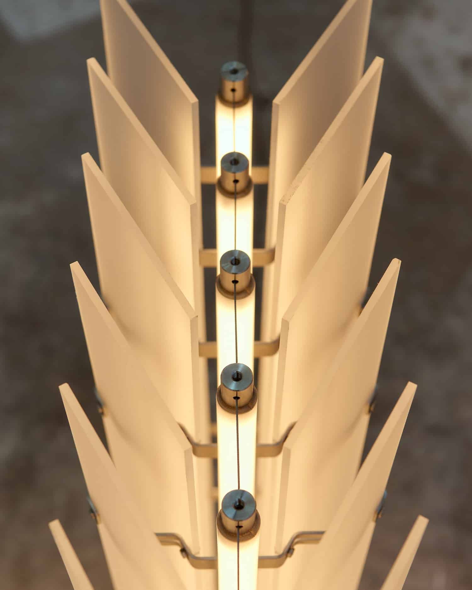 Lorsqu’elle est présentée comme lampadaire, les plaques d’acrylique deviennent un composant de support. Le système de connexion unique offre une liberté d’assemblage qui évoque d’autres projets modulaires comme ModuLight de Klaudia Zmuda, où la modularité et le contrôle de la source lumineuse permettent d’ajuster librement le flux lumineux selon les besoins.