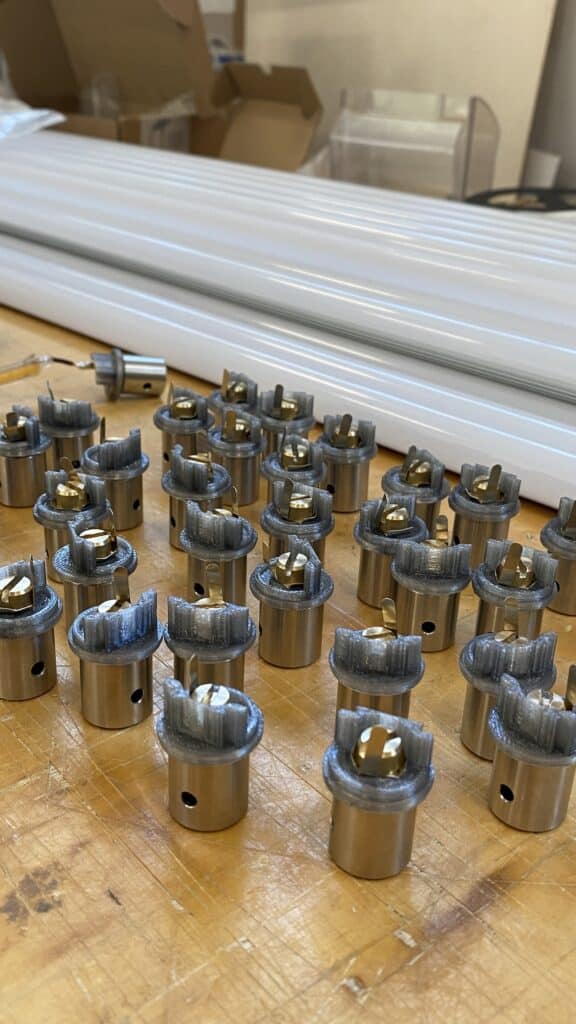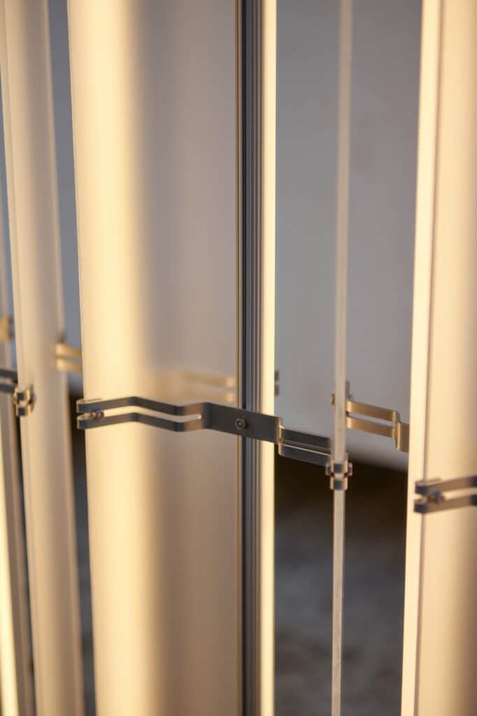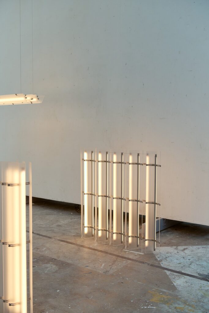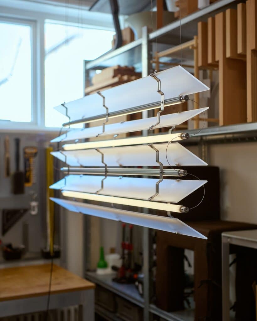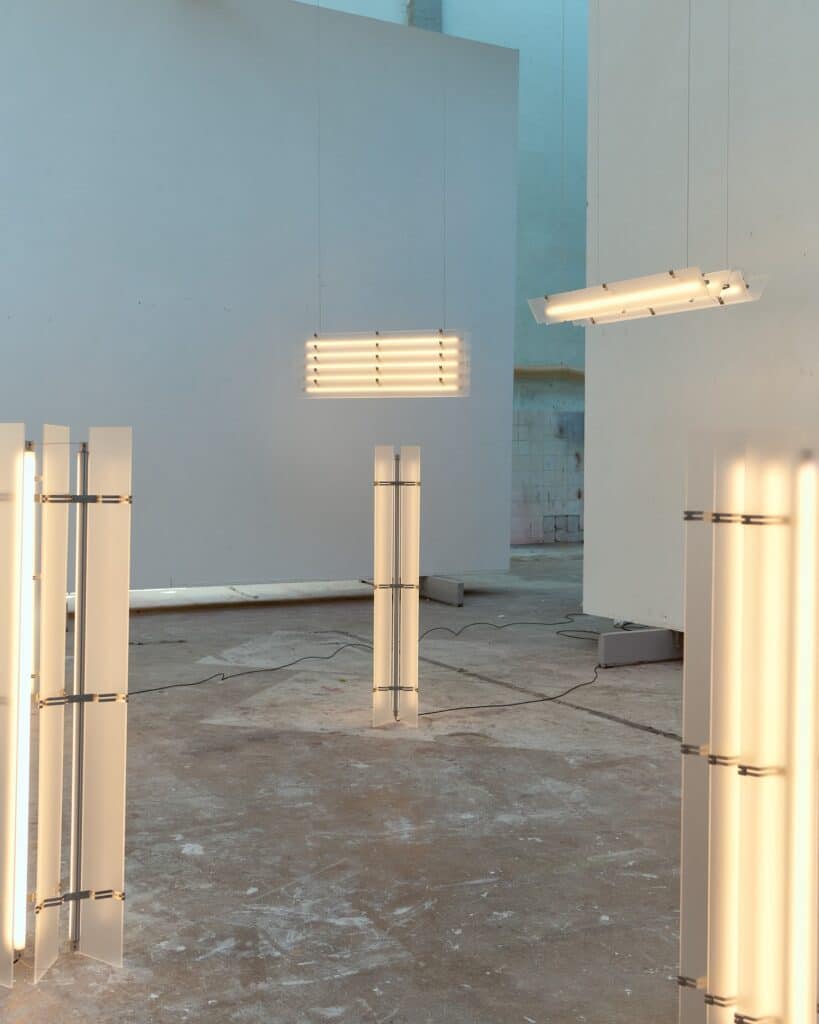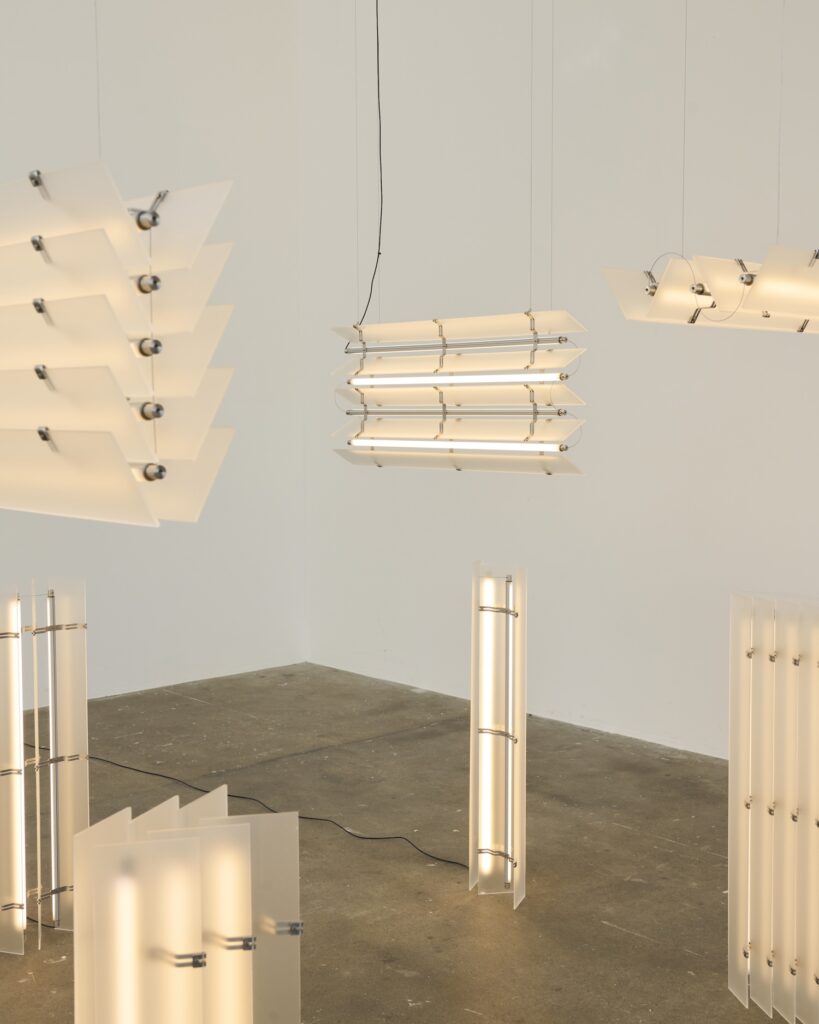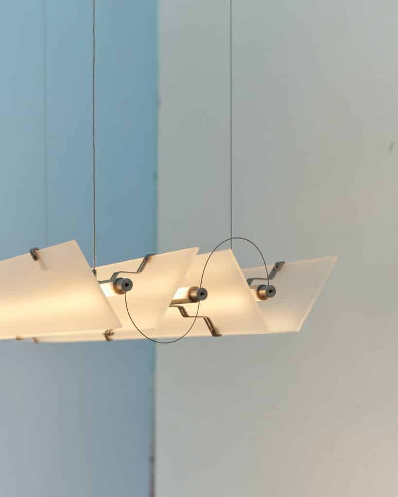 L’acier inoxydable apporte la structure et la solidité nécessaires, tandis que l’acrylique givré diffuse la lumière de manière douce et homogène. Cette combinaison crée un équilibre entre l’aspect industriel du métal et la délicatesse de la diffusion lumineuse. Comme nous l’avions observé avec les Polychrome Lamps d’Ihor Havrylenko, qui mariaient également plastique, acier et verre, la rencontre des matériaux peut générer des expressions plastiques singulières.