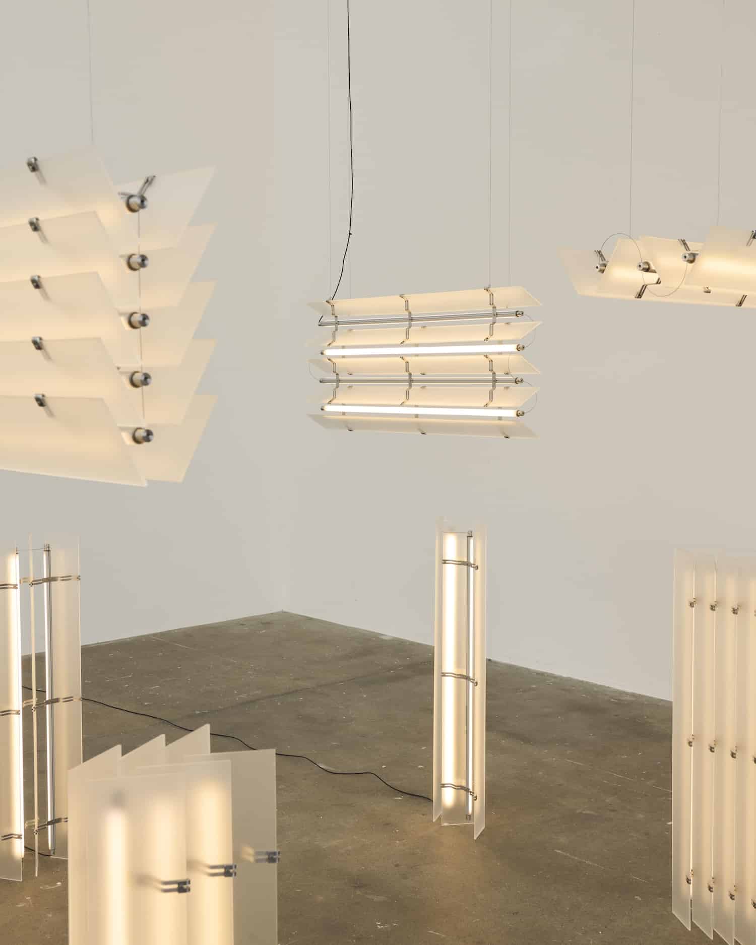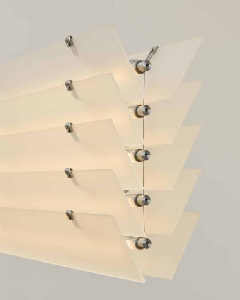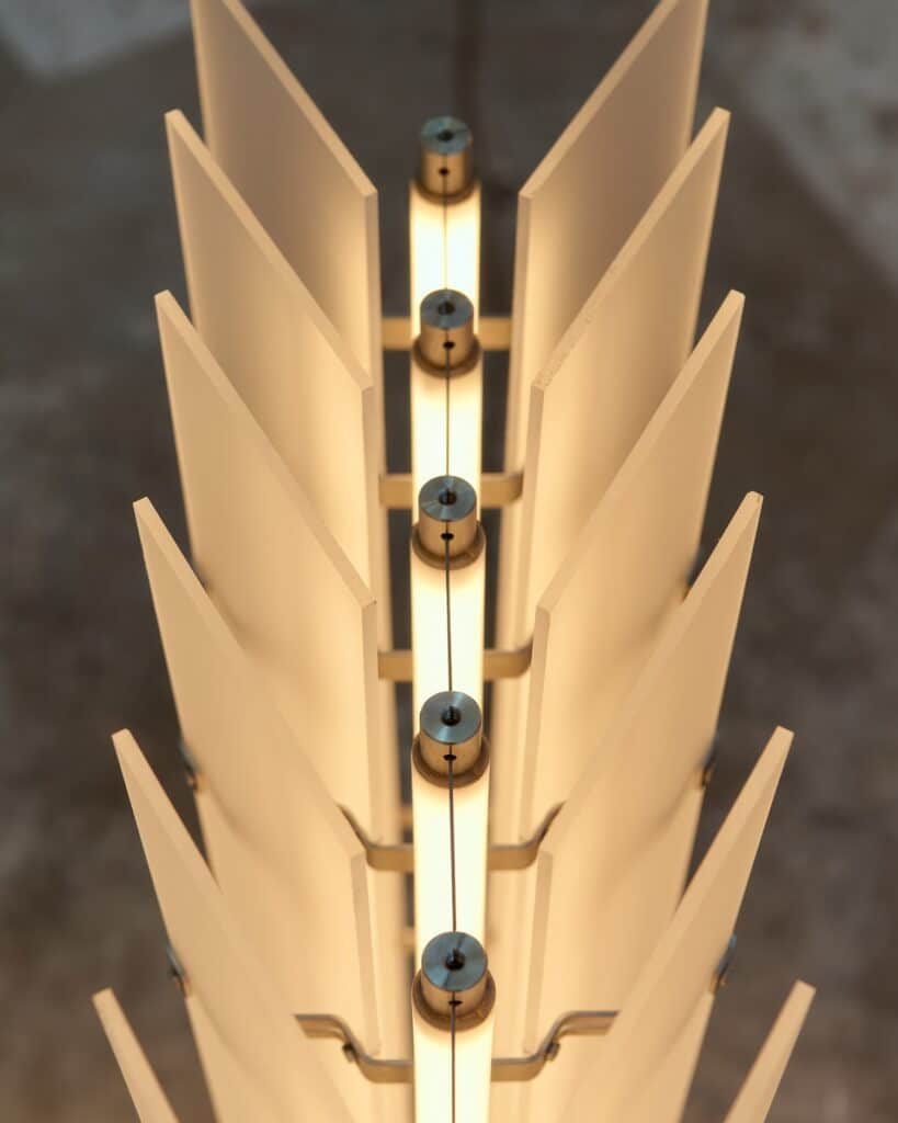 La collection Strata se décline en plusieurs configurations : suspensions et lampadaires. Les dimensions varient selon les modèles, allant de compositions compactes de 10 x 15 x 102 cm à des arrangements plus imposants de 15 x 44 x 102 cm. Cette variété permet à Strata de s’adapter à différents contextes, des configurations resserrées dans des intérieurs domestiques aux compositions monumentales définissant l’espace dans des environnements publics.