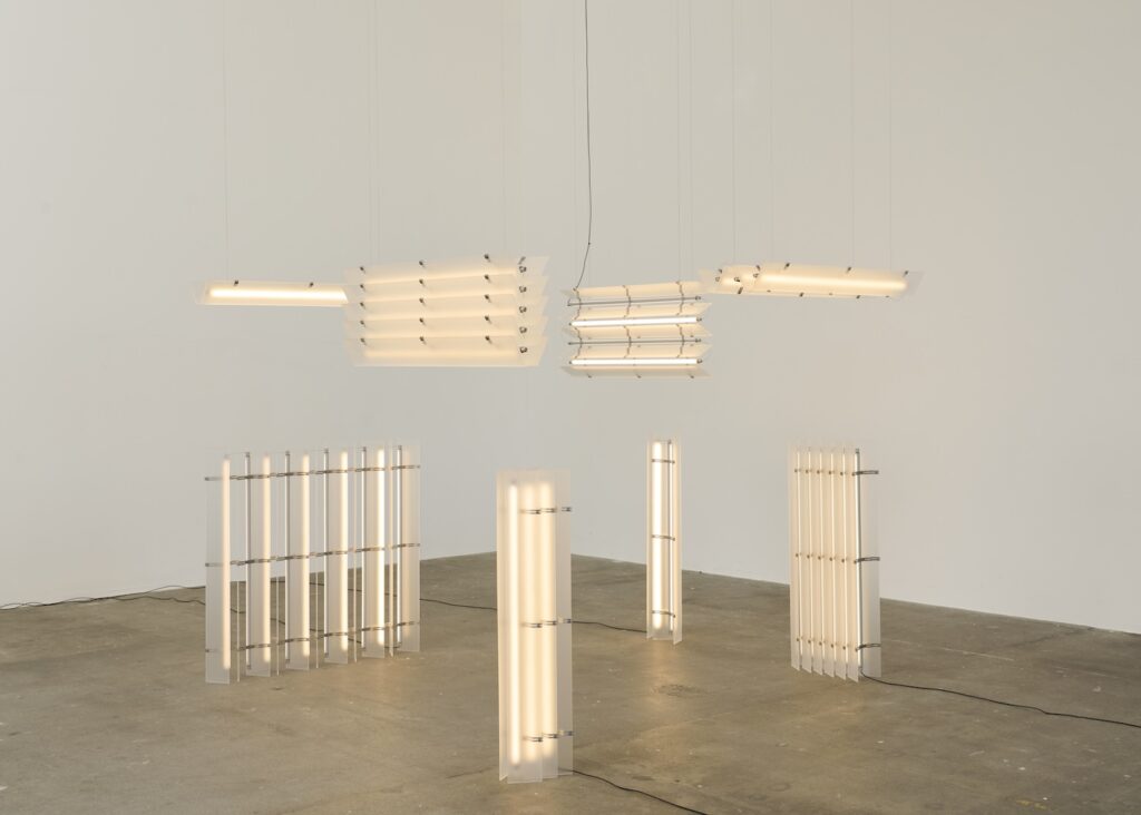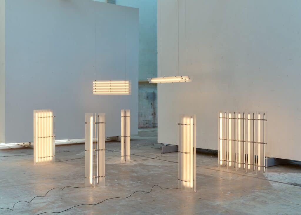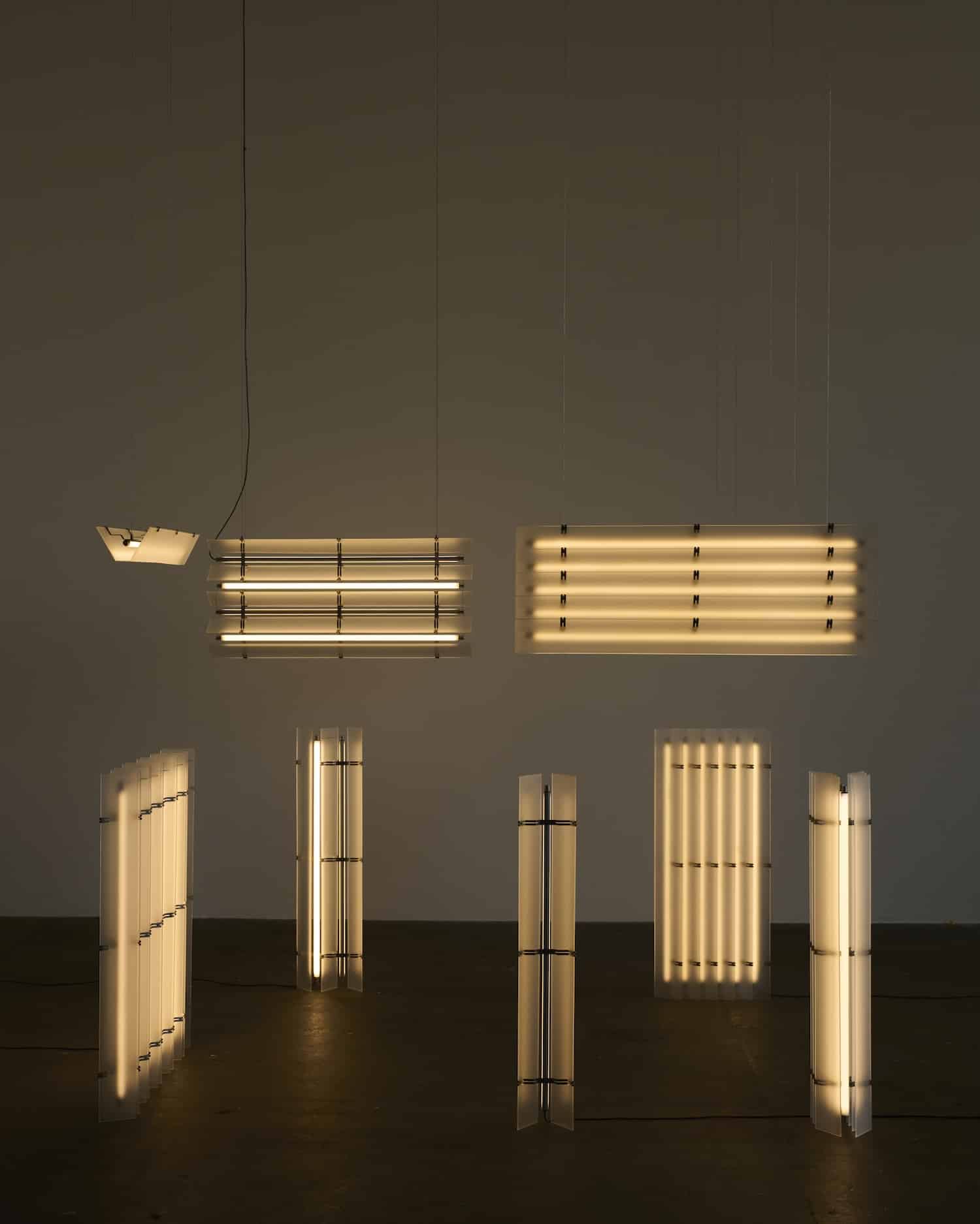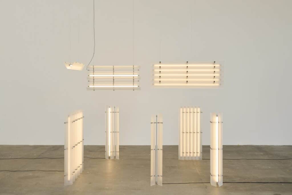 La collection Strata se décline en plusieurs configurations : suspensions et lampadaires. Les dimensions varient selon les modèles, allant de compositions compactes de 10 x 15 x 102 cm à des arrangements plus imposants de 15 x 44 x 102 cm. Cette variété permet à Strata de s’adapter à différents contextes, des configurations resserrées dans des intérieurs domestiques aux compositions monumentales définissant l’espace dans des environnements publics.