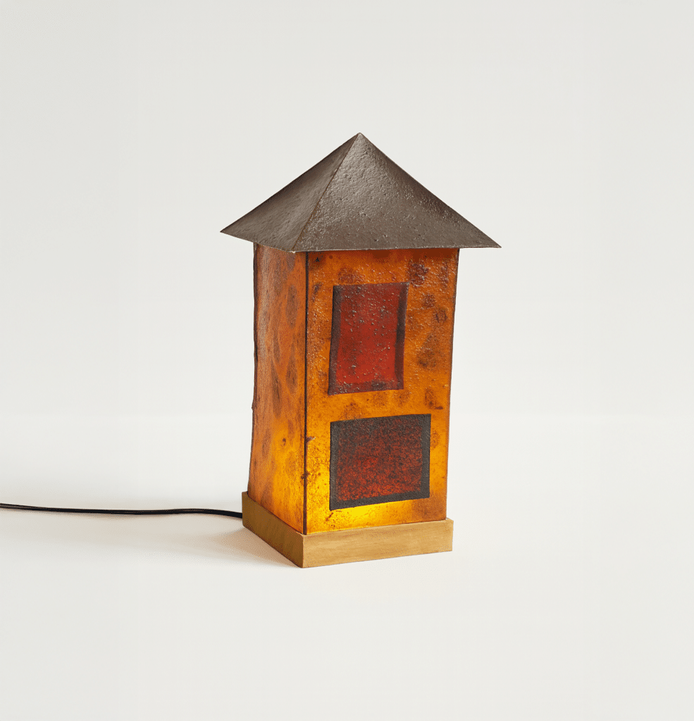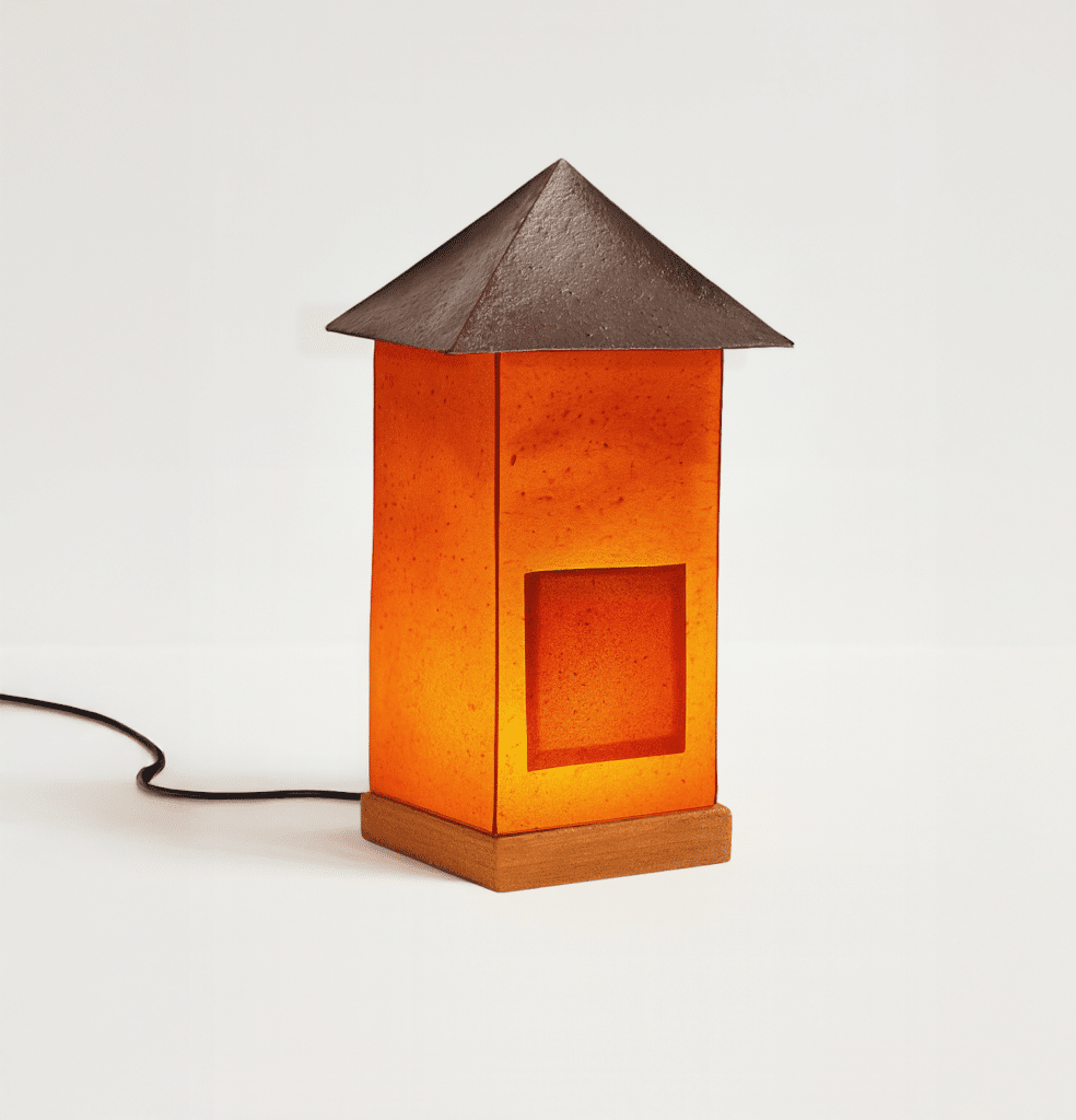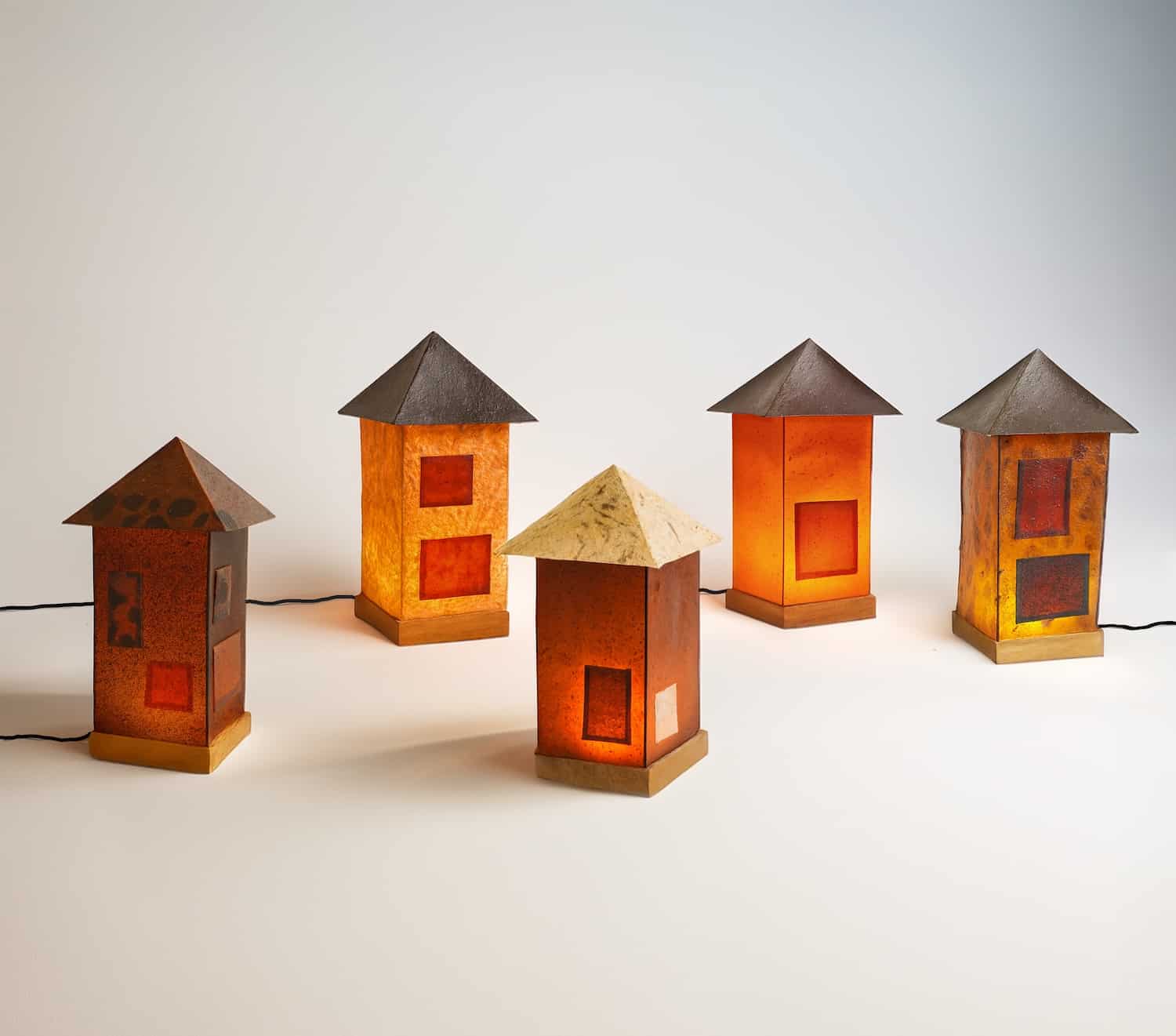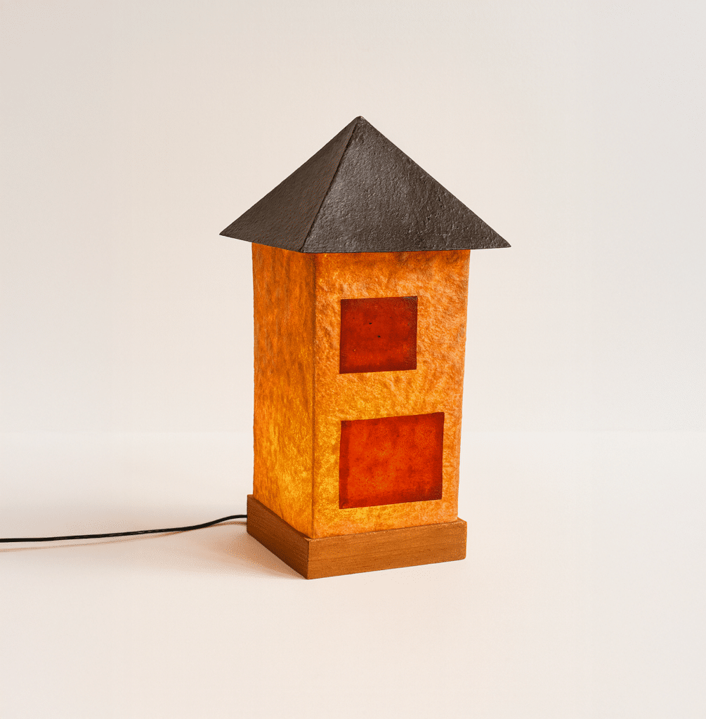 Par leur forme géométrique et leur construction verticale, ces lampes évoquent de petites folies architecturales, presque naïves dans leur simplicité. Un clin d’œil, peut-être, à la maison primitive de Ledoux ou aux maquettes de villages utopiques.