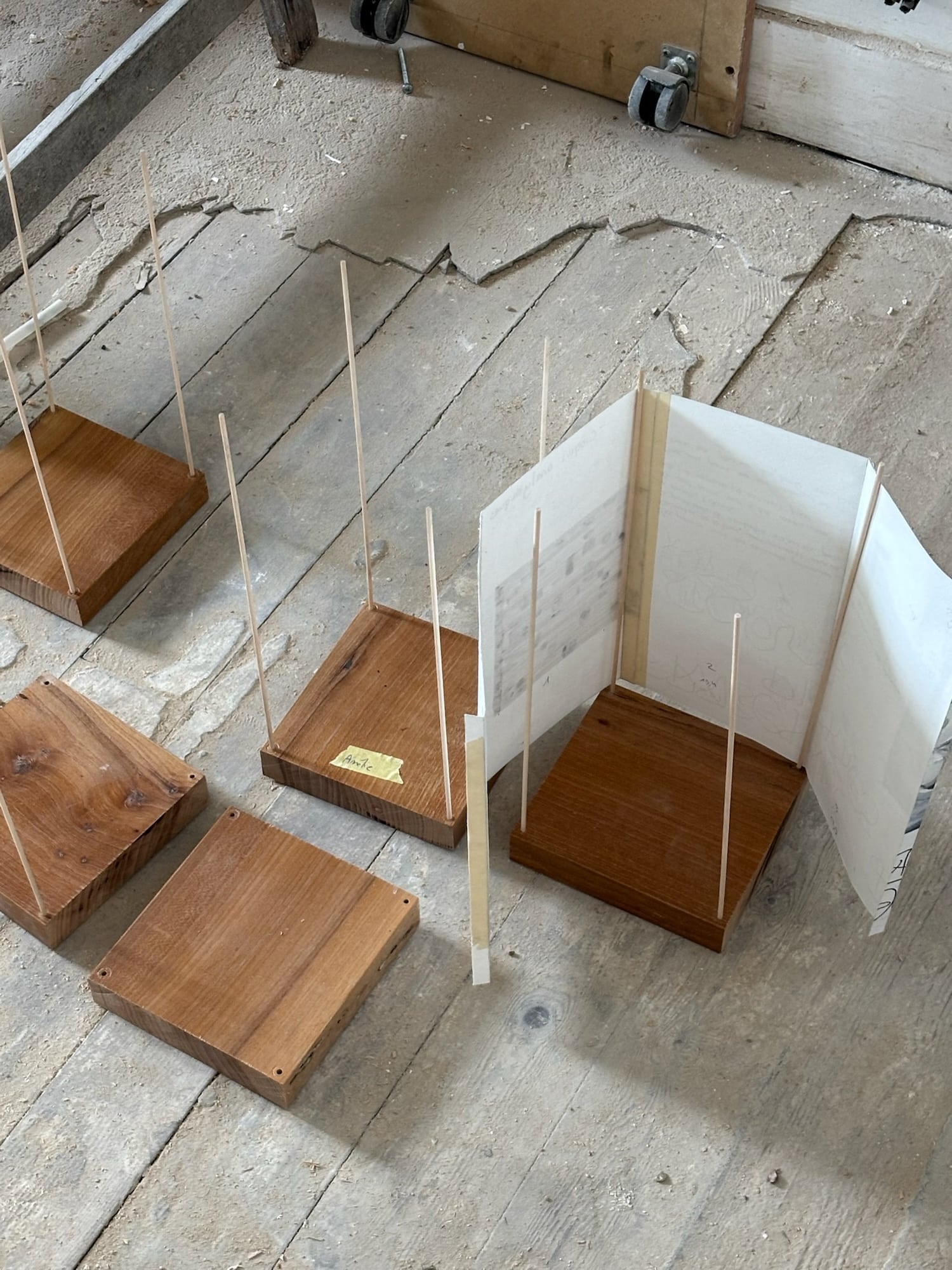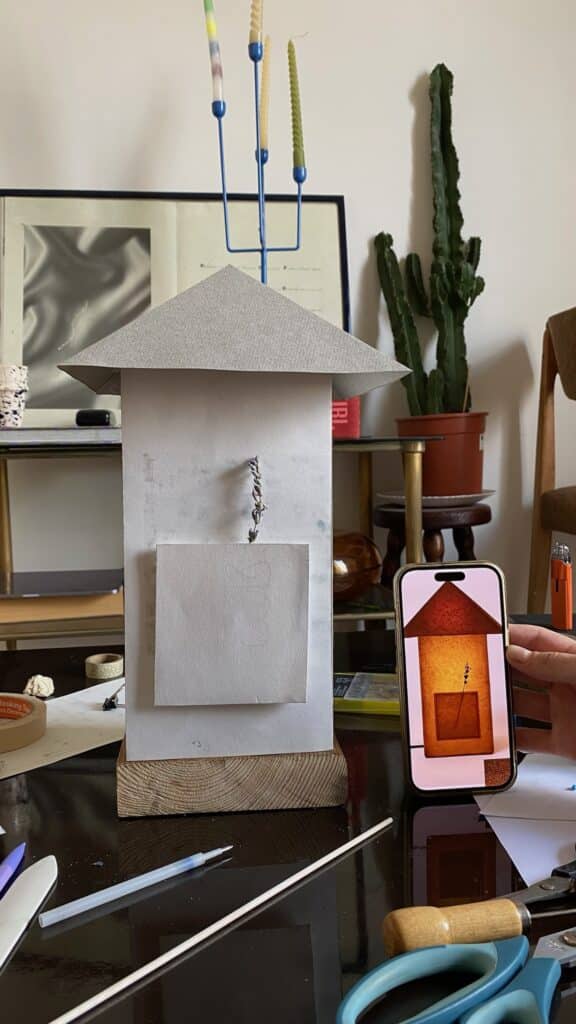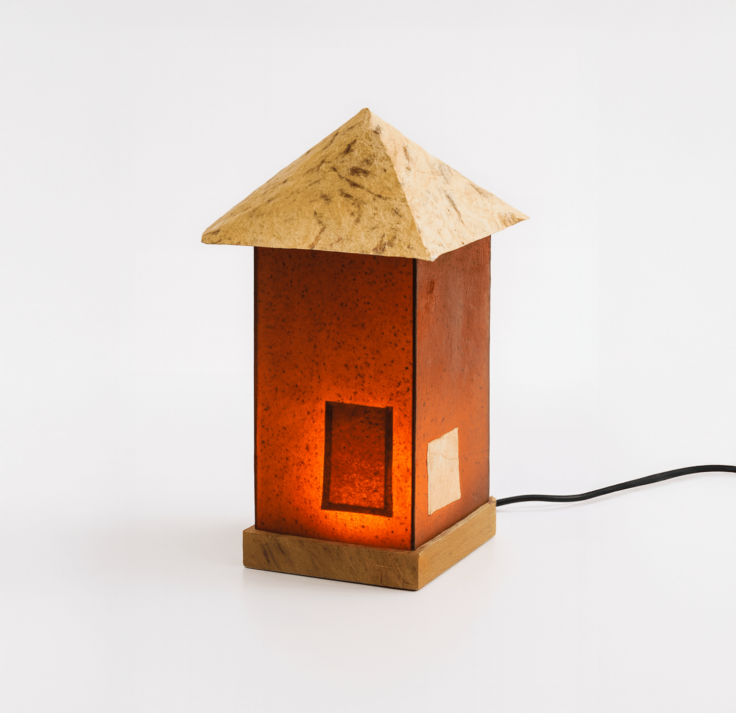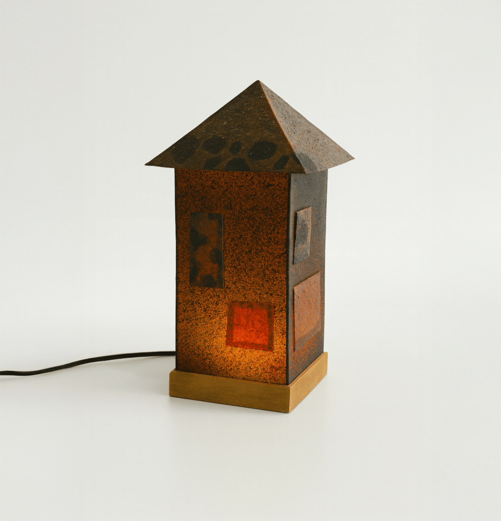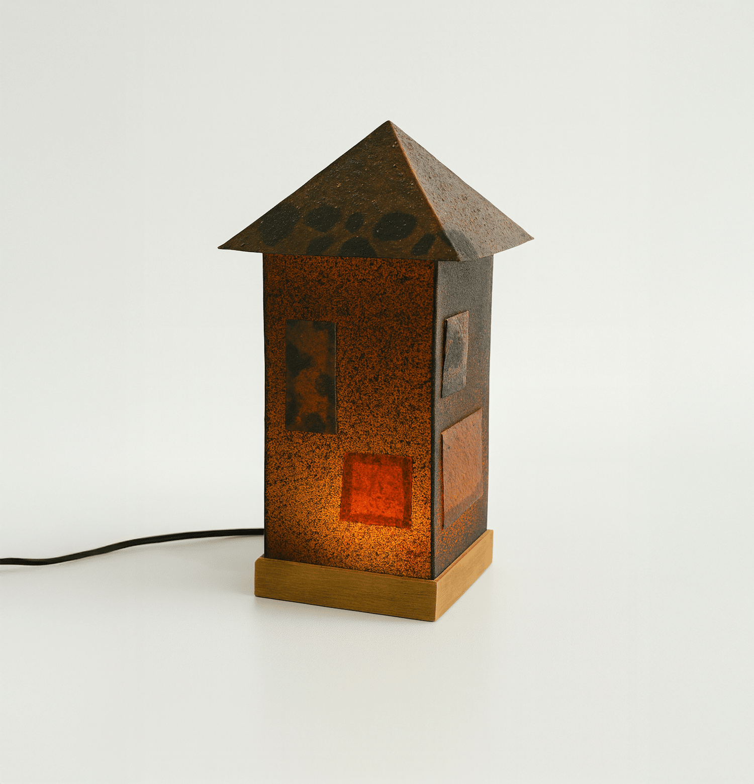 Par leur forme géométrique et leur construction verticale, ces lampes évoquent de petites folies architecturales, presque naïves dans leur simplicité. Un clin d’œil, peut-être, à la maison primitive de Ledoux ou aux maquettes de villages utopiques.