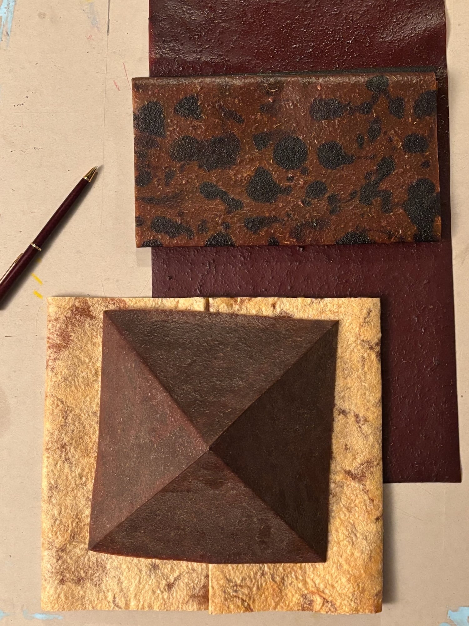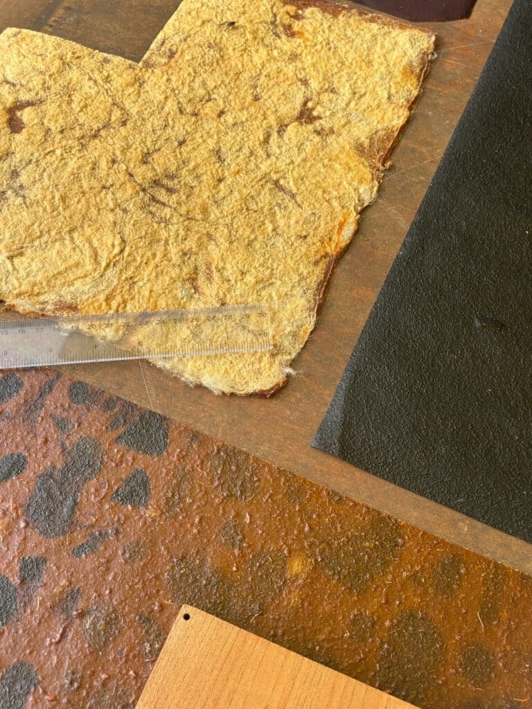 Le cœur du projet repose sur un bioplastique expérimental, développé à partir de pulpes, d’écorces et de résidus végétaux, orange, betterave, banane, café… Des matériaux biodégradables, collectés localement, puis transformés sans additif chimique. Ce travail sur la matière renvoie à une réflexion plus large sur les cycles naturels et les temporalités du vivant. Un projet s’inscrivant dans notre série dédiée au nouveaux matériaux, à base de végétaux, de déchets, de légumes, fruits, résidus, noyaux…