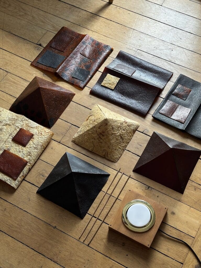 Visuellement, le matériau offre une palette de textures étonnamment riches : souple comme un cuir végétal, parfois translucide, granuleux, ou rigide comme une feuille pressée. Les teintes varient selon l’origine organique : le rouge profond de la betterave, l’orangé vif de l’agrume, les bruns chauds du café ou de la peau de banane. Chaque lampe est donc unique, marquée par la matière dont elle est née.