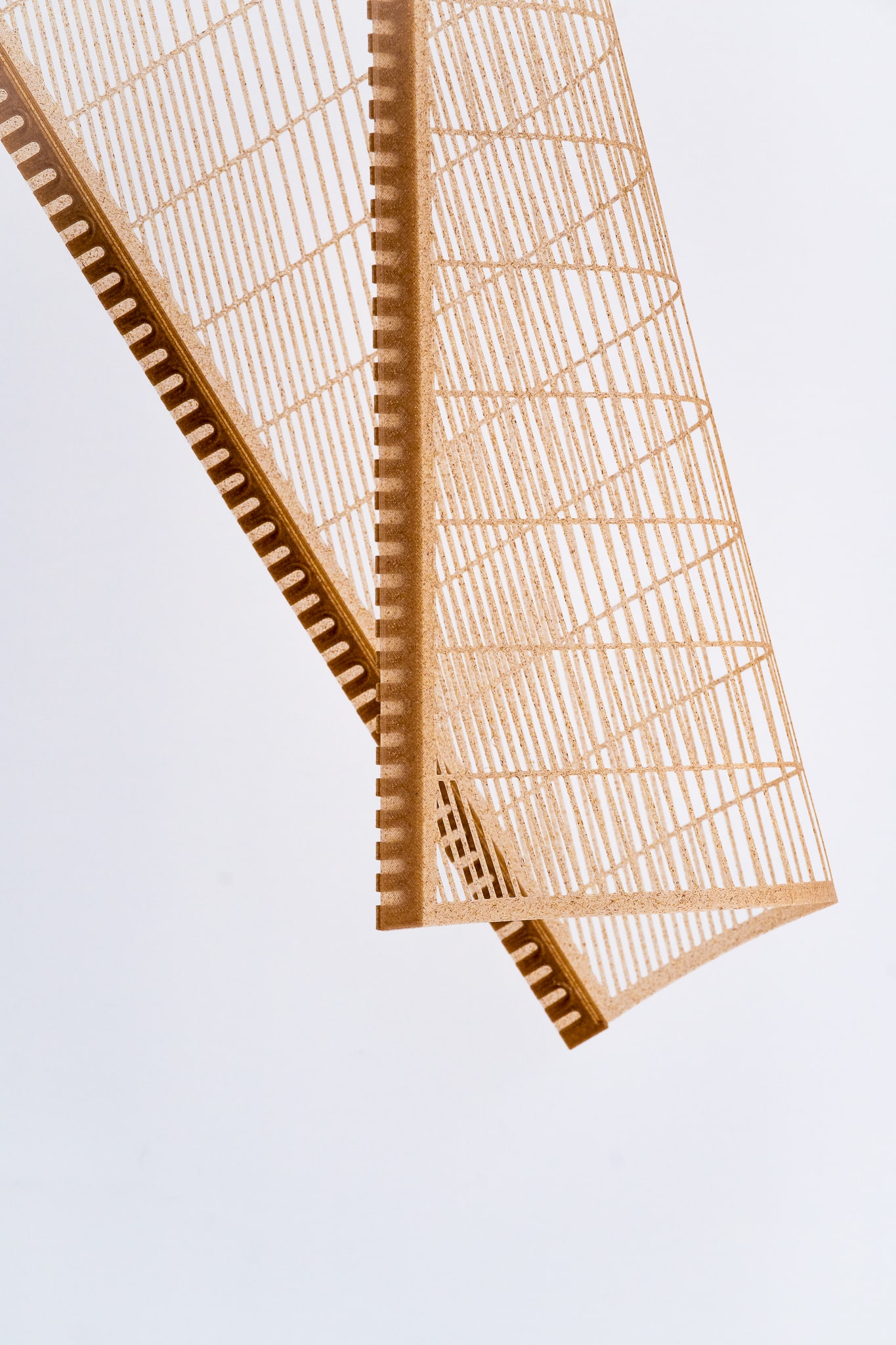 Ce mouvement lent, cadencé et précis donne naissance à des suspensions dont la structure économe et minimaliste devient la trame même de l’objet. La machine imite le geste du tisserand. La structure se suffit à elle-même, sans structure superflue, sans ornement ajouté.