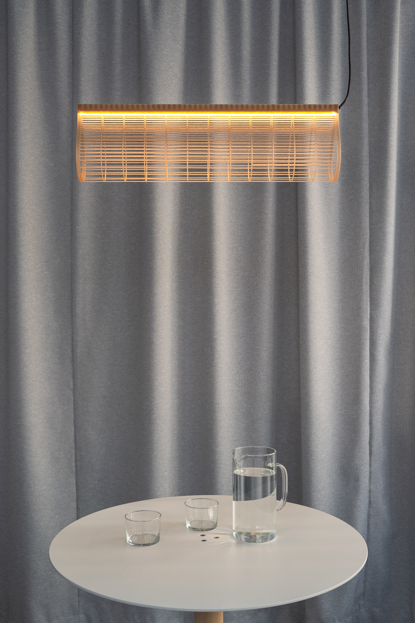 Le résultat est une suspension lumineuse aérienne, légère, à la teinte naturellement dorée, fabriquée à partir d’un filament entièrement biosourcé et biodégradable chargé de fibres de miscanthus cultivé en Seine-et-Marne.