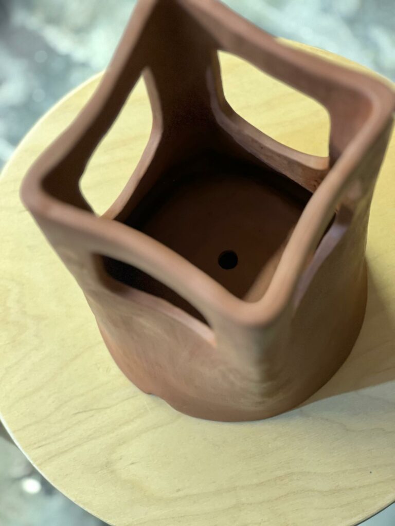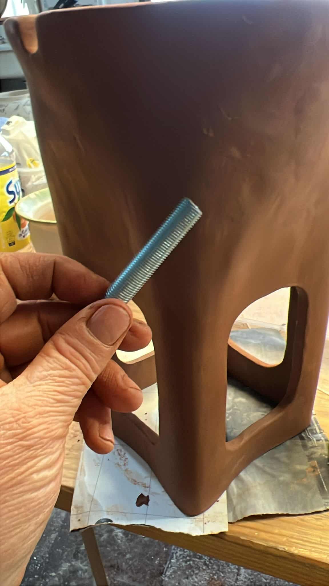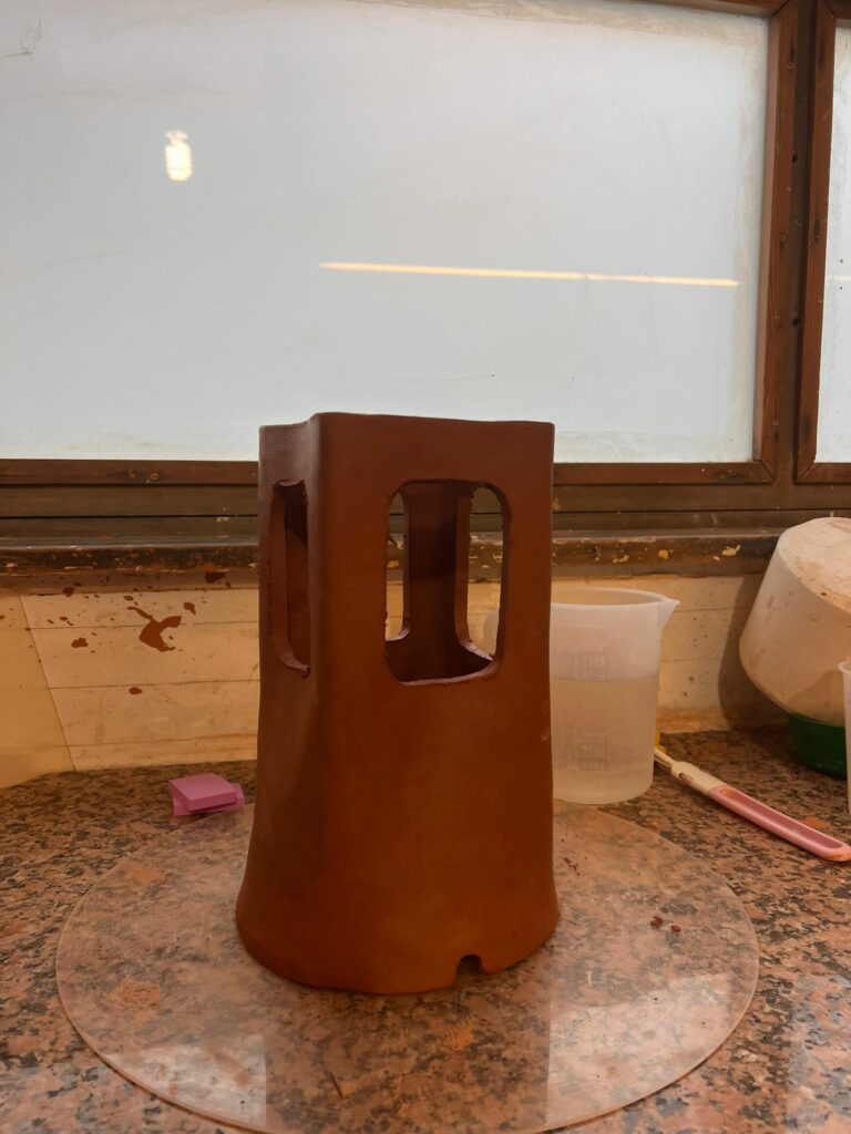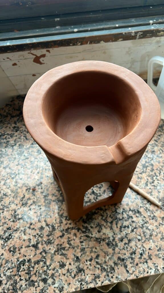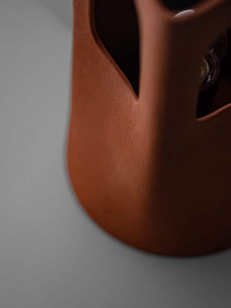La base en céramique, façonnée selon les méthodes traditionnelles, offre une présence forte qui l’ancrent dans l’espace. L’argile espagnole travaillée à la main conserve les traces de sa fabrication, ces petites irrégularités qui témoignent du geste de l’artisan. La finition naturelle et neutre du socle vient mettre en valeur l’abat-jour en verre coloré, plutôt que de rivaliser avec lui, créant un équilibre visuel délicat.
