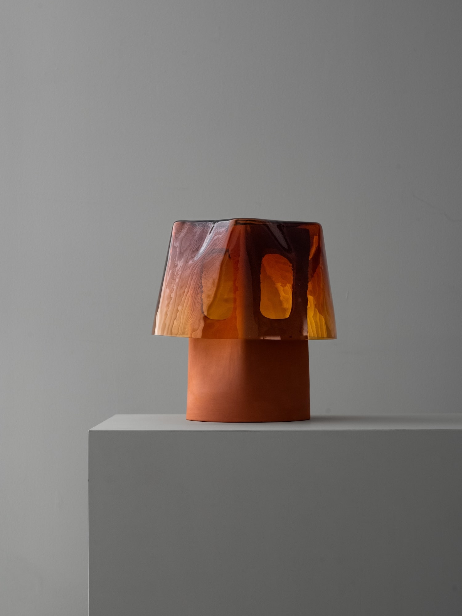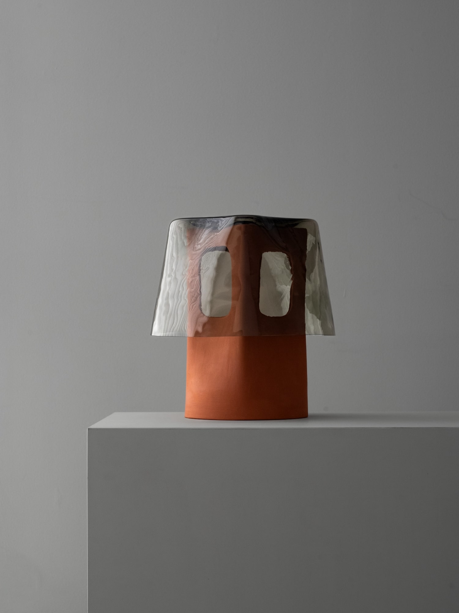 Ce qui frappe d’abord dans la conception de Mesia, c’est cette absence de jointure visible entre la base en céramique et l’abat-jour en verre. L’abat-jour repose directement sur le socle, sans connecteurs ni artifices, une approche qui rappelle les lampes entre artisanat traditionnel et design moderne présentées précédemment sur BED, où le verre soufflé à la main dialogue avec des bases travaillées artisanalement, ou encore le travail d’Aurelien Veyrat.